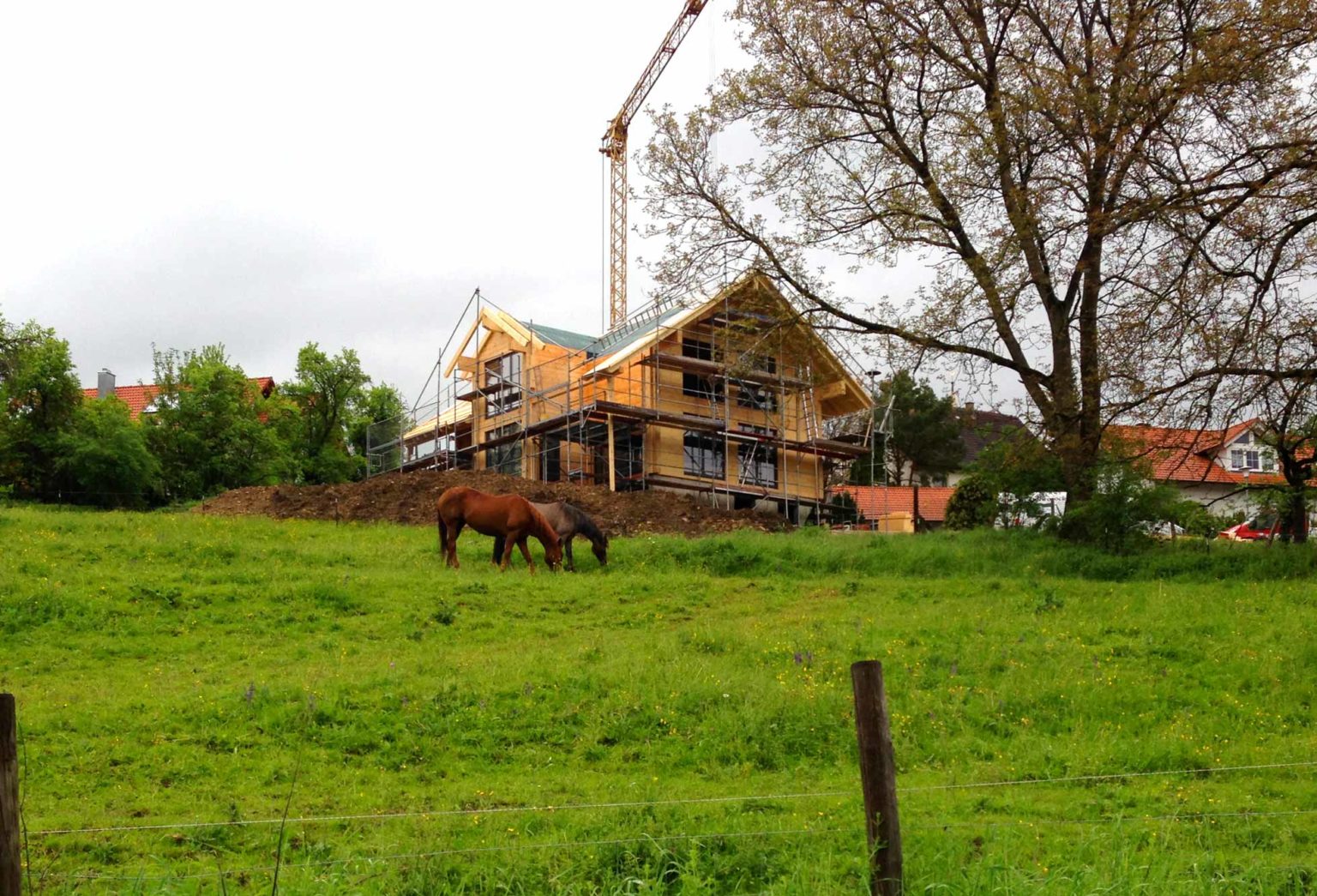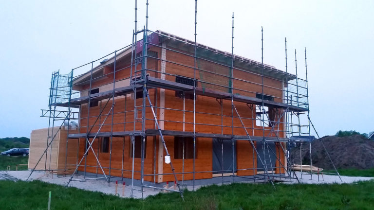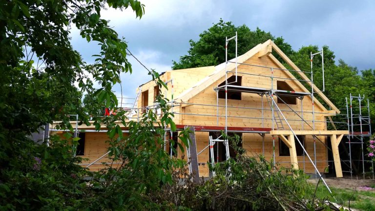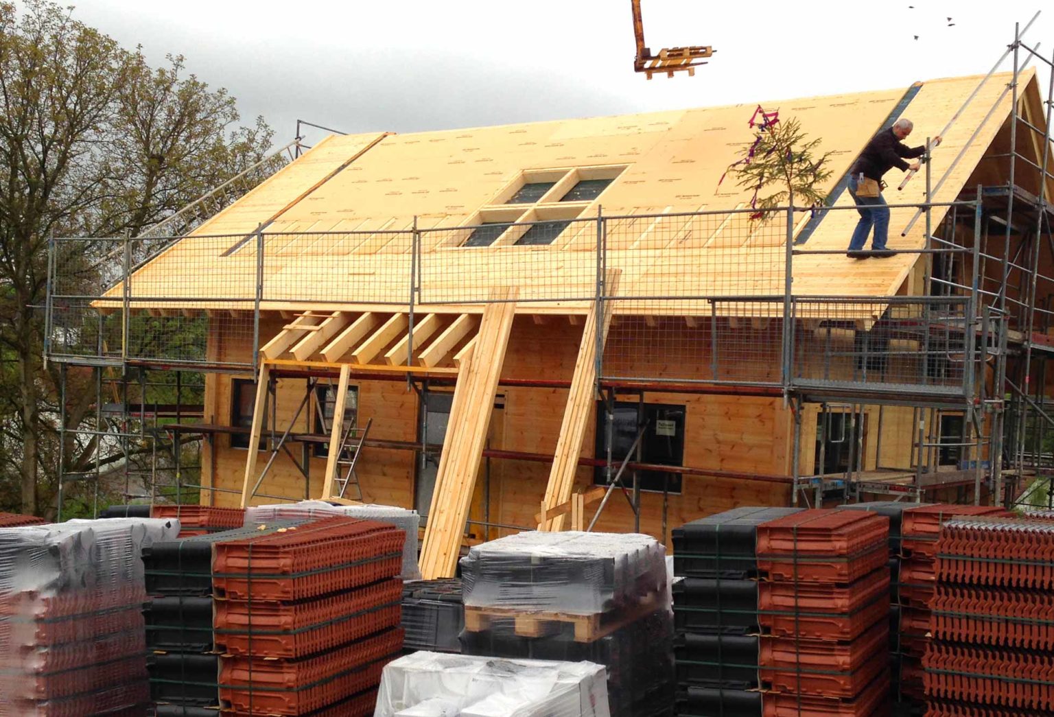Fullwood Wohnblockhaus ist in der Lage auf jedem Grundstück, egal wie schwierig und unwegsam es ist, ein massives Blockhaus zu errichten. Hier entsteht ein schönes Beispiel mit der 20cm dicken Vollholzwand aus Polarkiefernholz. Die Bauherren lassen ihr Blockhaus als Richtmeistermontage aufbauen, das bedeutet, sie helfen beim Hausaufbau mit und organisieren den Innenausbau in Eigenregie. Was sie können, machen sie sogar eigenhändig. Nach uns nach nimmt das neue Blockhaus am Hang Gestalt an, und alsbald beginnen die Dachdecker ihr Werk. Aufgrund der steilen Hanglage wurde vor der Blockwandmontage ein Kellergeschoss gemauert.