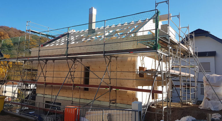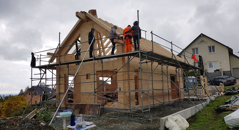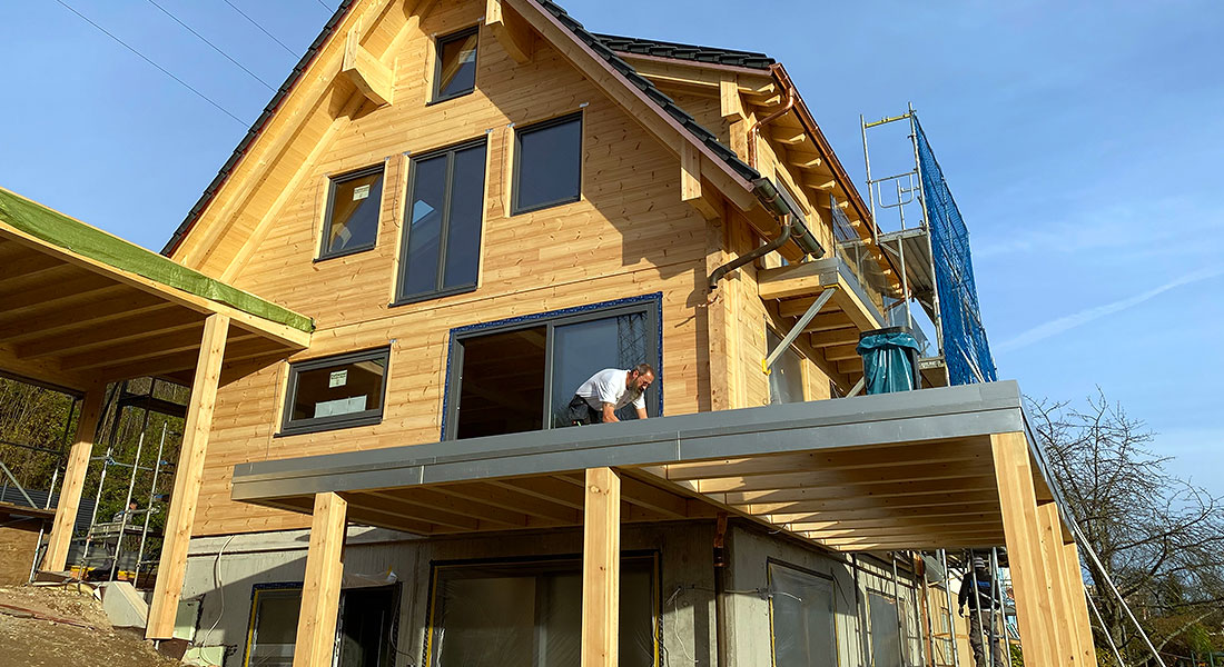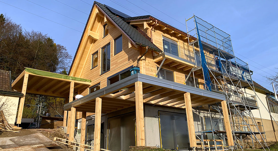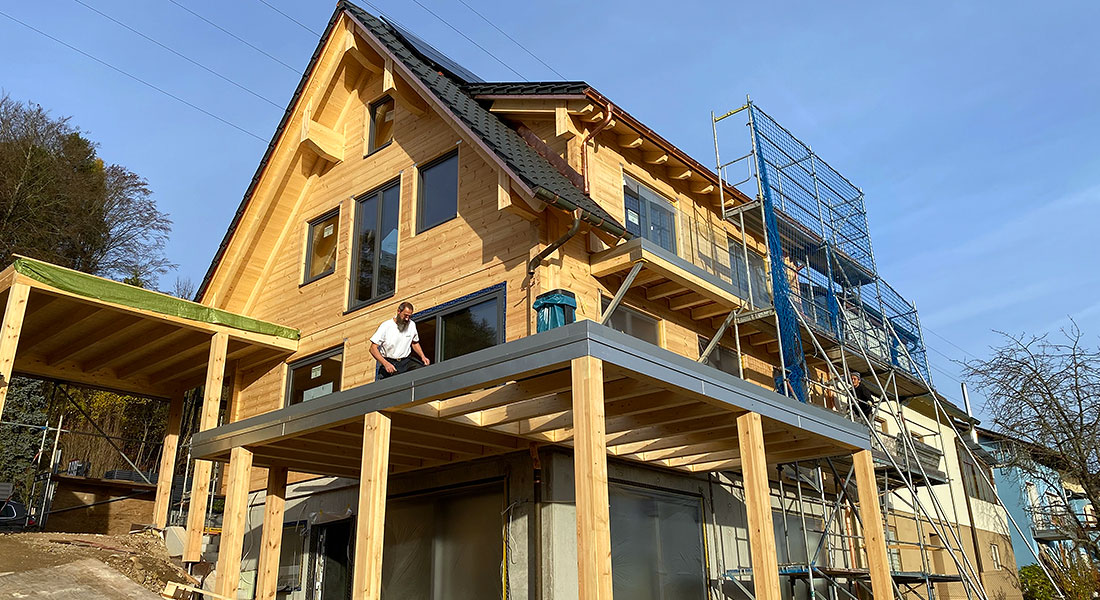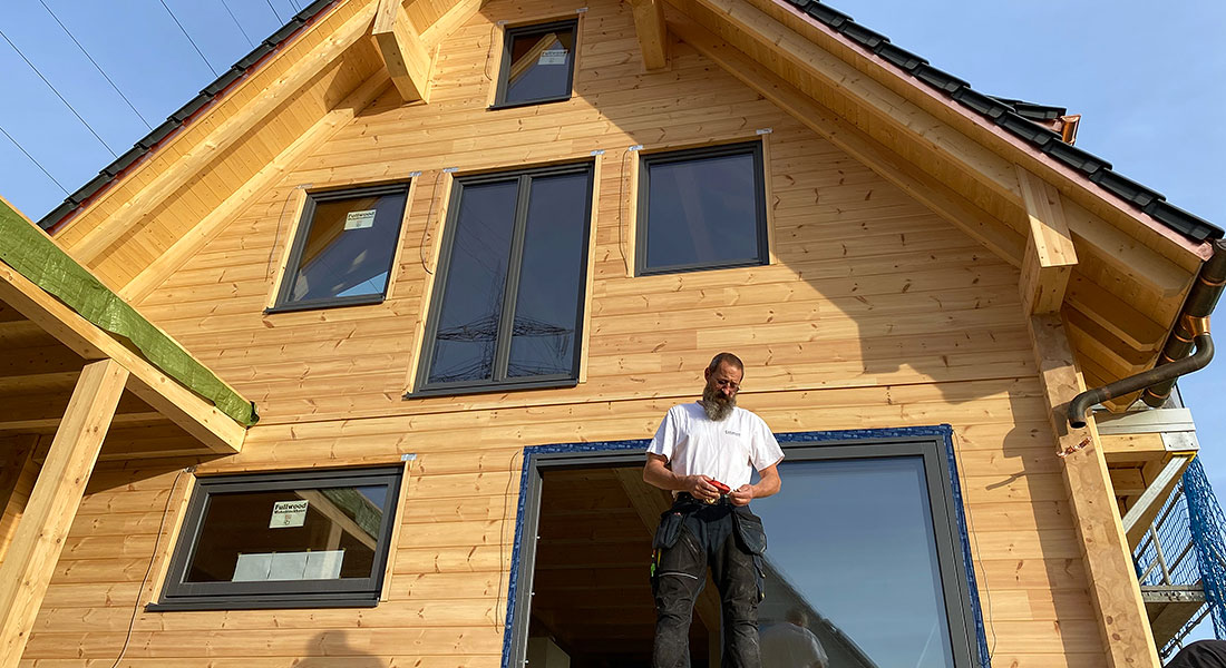 Zuerst lässt das Baupaar die Hälfte eines älteren Doppelhauses abreißen, dann plant es mit Fullwood Wohnblockhaus ein individuelles Blockhaus nach den eigenen Wünschen und örtlichen Bauvorgaben, um nun auf dem vorhandenen Bestandskeller Blockwand für Blockwand das ersehnte Traumhaus errichten zu lassen. Entsprechend dem benachbarten Altbau erhält auch das neue Blockhaus eine Schleppgaube mit bodentiefen Fenstertüren plus Balkon. Im Untergeschoss wird später die Hebammenpraxis der Hausherrin eingerichtet, während man oben – im Holzteil – wohnt.