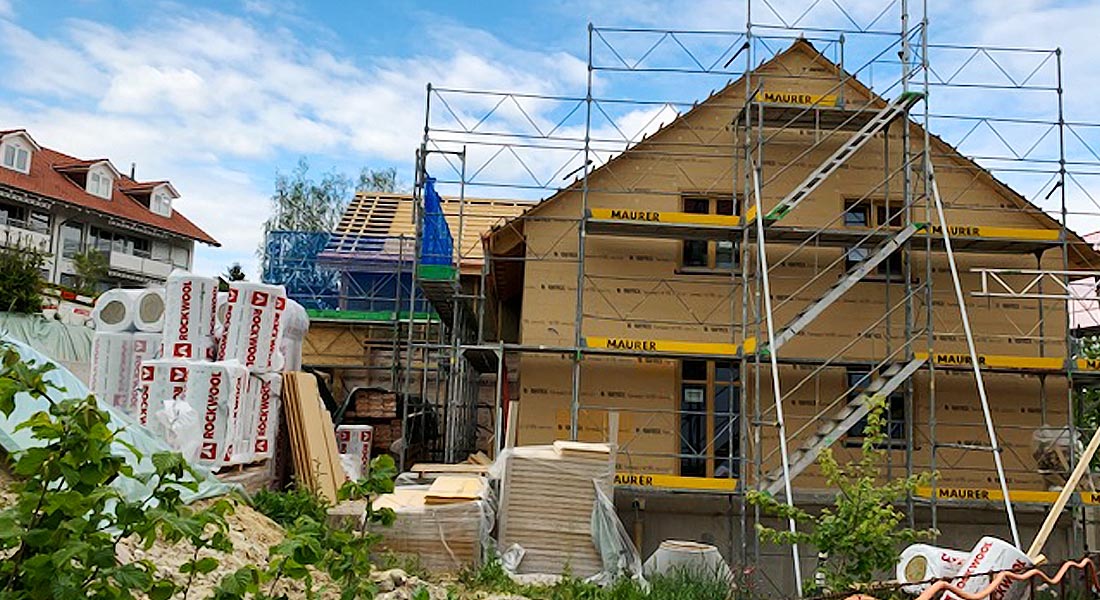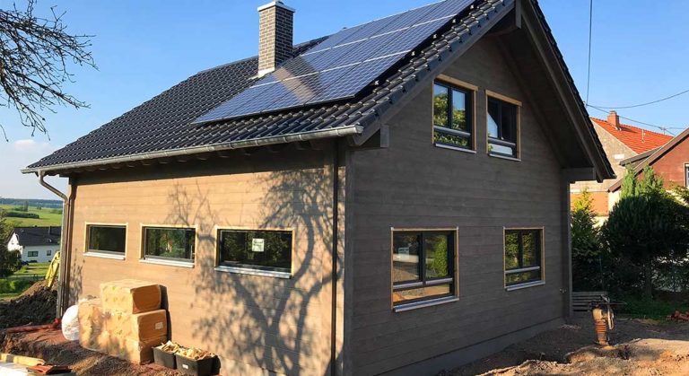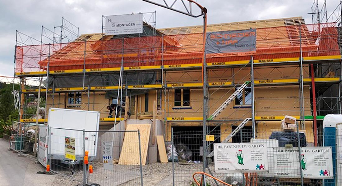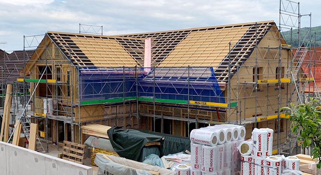 Da dieses Blockhaus in eine historisch gewachsene Dorfzone integriert wird, darf wegen des Ortsbild-Schutzes außen keine Massivholzfassade zu sehen sein. Kein Problem für Fullwood Wohnblockhaus und den Bauherrn: Er entscheidet sich für die Kombiblockwand und setzt die 9cm Blockschicht einfach nach innen. Zur Außenseite werden Trägerplatten montiert, die teils verputzt und teils mit vertikaler Holzschalung verkleidet werden. Dazwischen befindet sich eine Dämmschicht, so dass es sich um ein mehrschaliges Blockhaus mit Dämmung handelt. Plastik- oder Kunststofffolien sind trotzdem nicht zu finden, sodass die Wohngesundheit auch bei diesem "atmungsaktiven" Blockhaus nicht beeinträchtig wird.