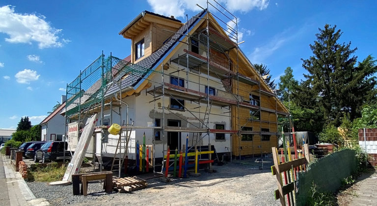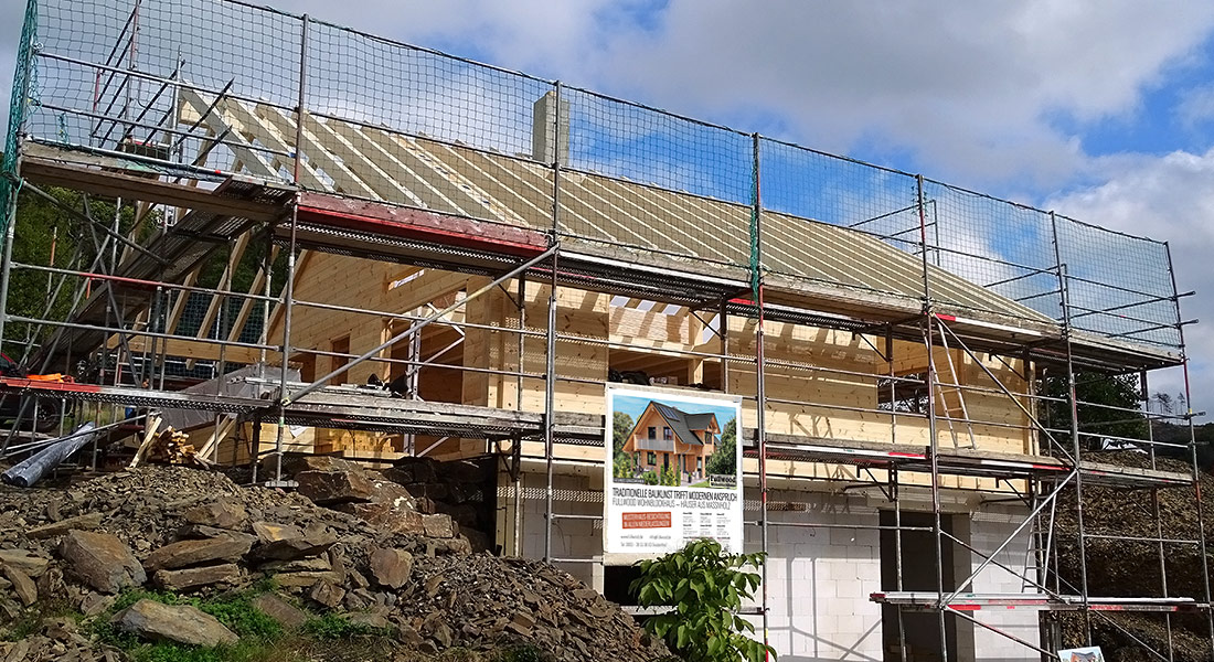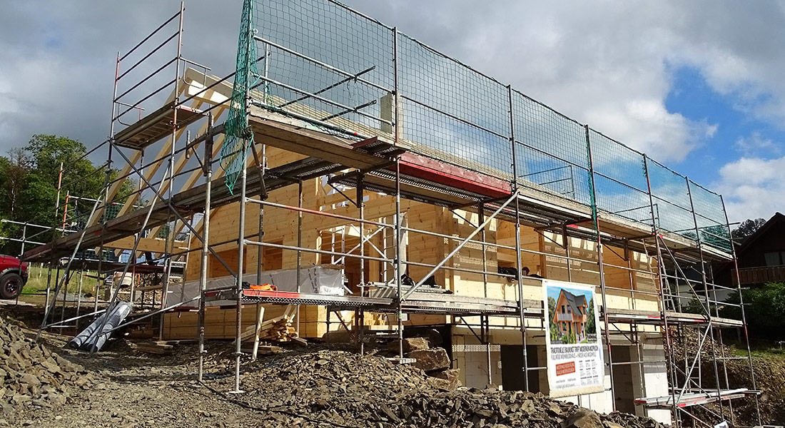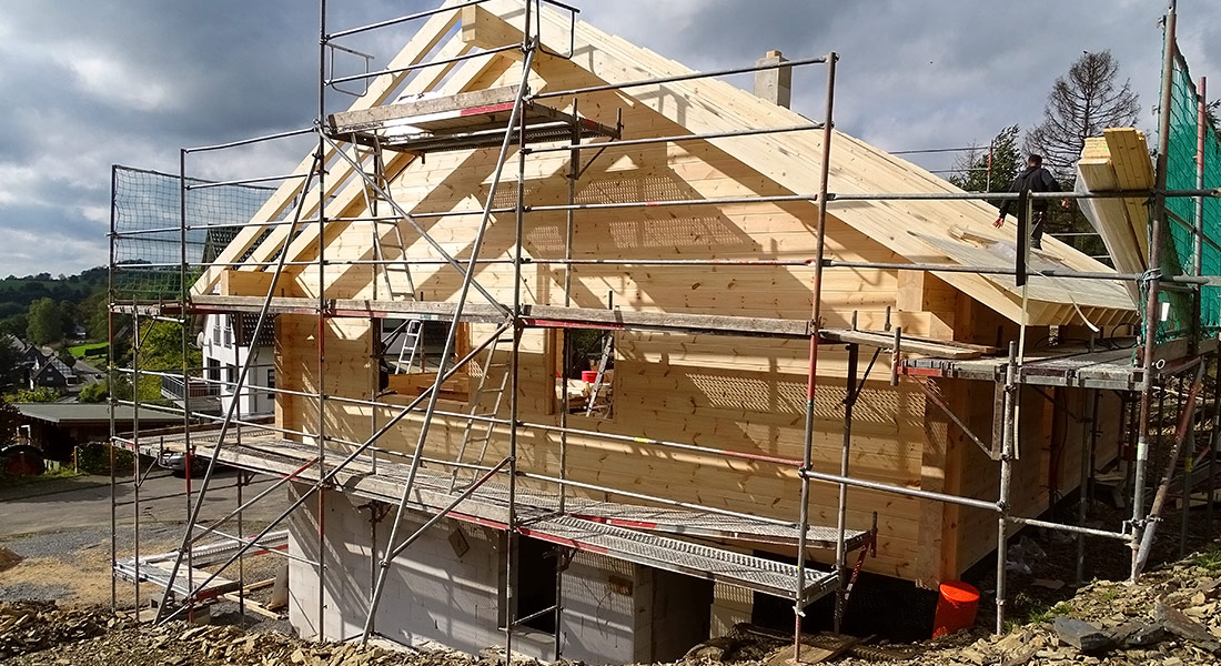 Termingetreu wird auch dieses massive Blockhaus ausgeliefert, bzw. seine in der Werkstatt exakt vorgefertigten Wandelemente und Bauteile. Seine Bauherrschaft, ein Lehrerehepaar, träumt schon lange vom eigenen Blockhaus und baut dieses unter der Regie des Richtmeisters mit Helfern aus der Familie und dem Freundeskreis auf. Nach nur 2 Tagen ist der Rohbau schon auf dem zuvor erstellen Kellergeschoss montiert.