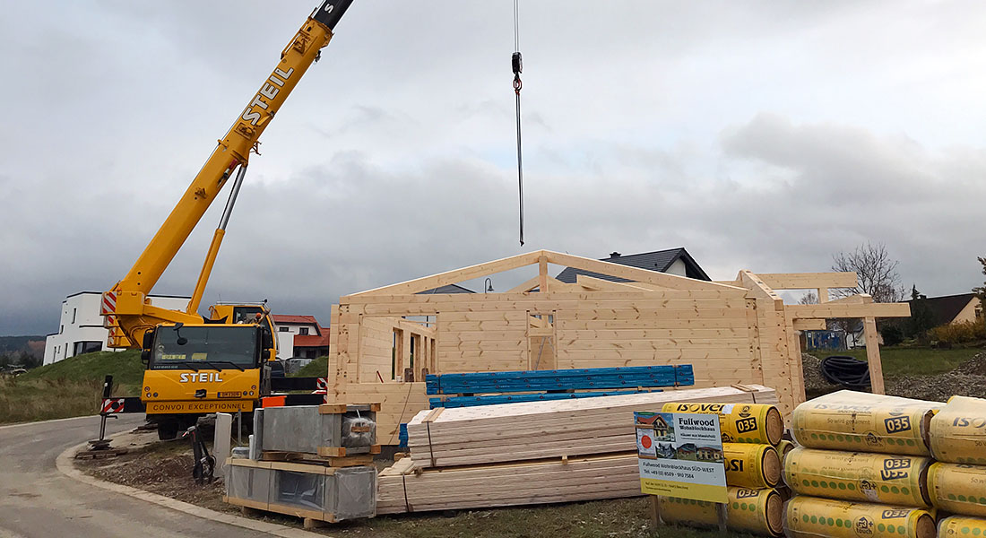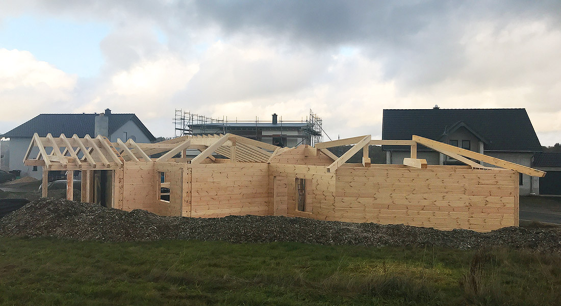 Die Fullwood-Monteure bauen das eingeschossige Blockhaus geschwind und professionell auf, damit die erwartungsvollen Bauherren samt Hunden baldmöglichst einziehen können. Durch die Dachlandschaft aus Sattel und Walm, sowie einen Erker mit Dachverlängerung über der Terrasse und eine im 45°-Winkel angebaute Doppelgarage wirkt das Blockhaus-Ensemble architektonisch besonders ausdrucksstark. Kombiniert mit den Kiefernholzwänden ist es fast unwiderstehlich.