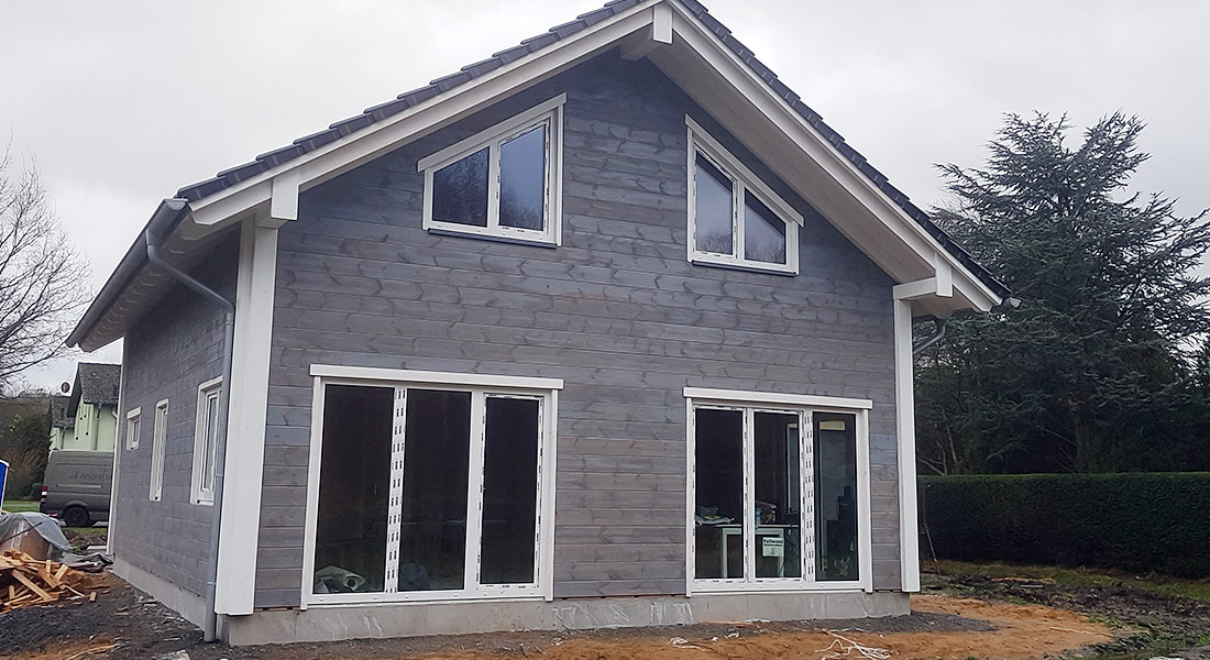 Hier entsteht ein weiteres schönes Beispiel für farbig lasierte Blockhäuser, sofern man grau als Farbe bezeichnen mag. Die junge Baufamilie möchte sowohl bei der Blockhaus Montage als auch beim Ausbau selbst viel Hand anlegen – bei Fullwood Wohnblockhaus kein Problem! Der Kunde ist auch bei der Wahl der Ausbaustufe König, kann sein Blockhaus also individuell planen und bauen. In diesem Fall entscheidet sich das Baupaar für die gestalterisch besonders flexible Kombiblockwand.