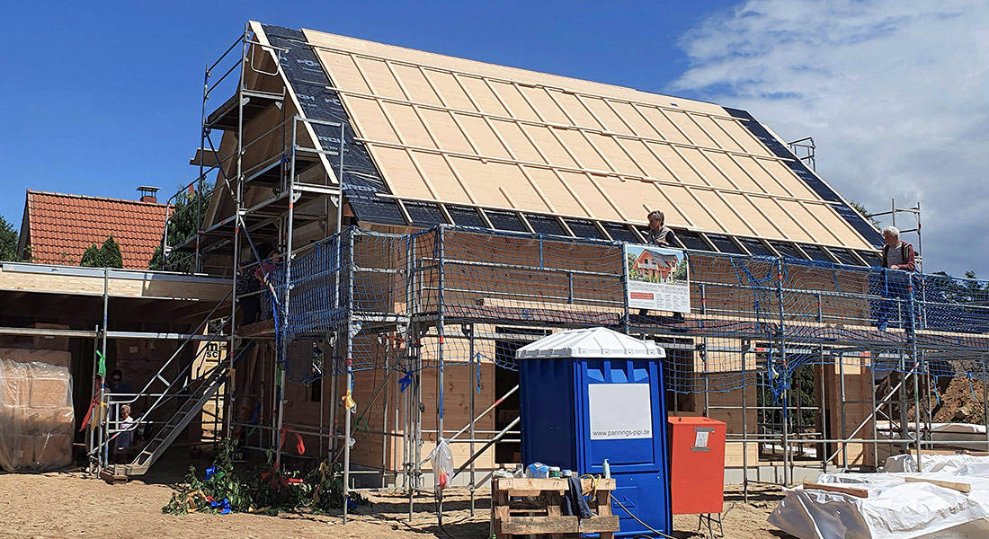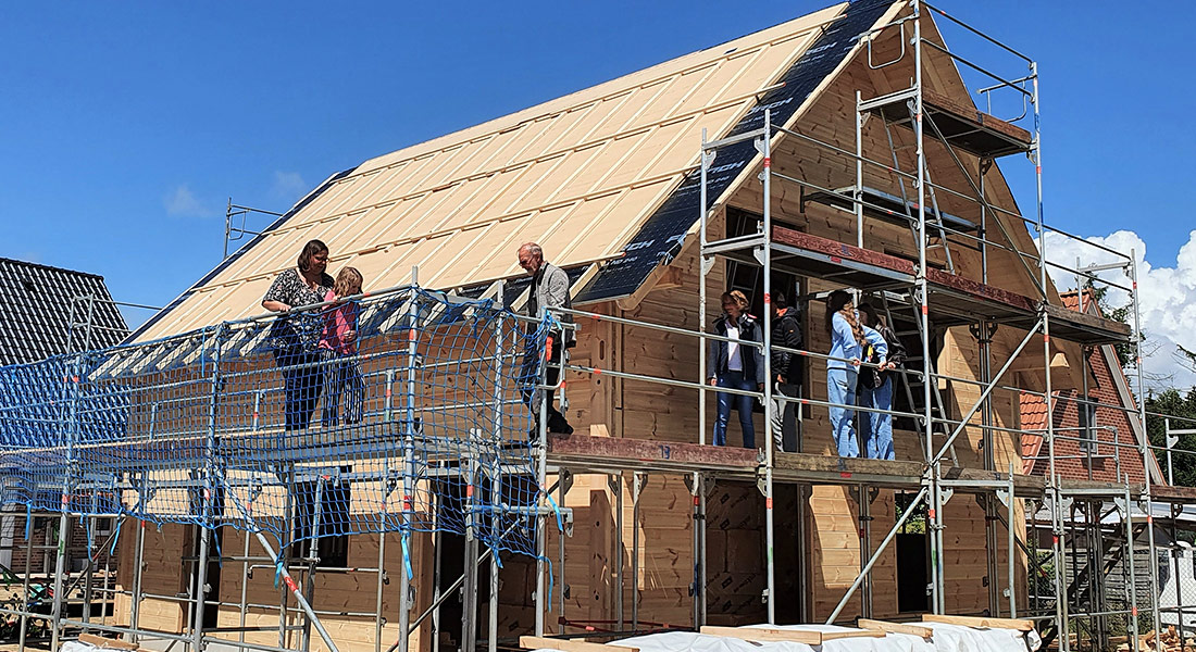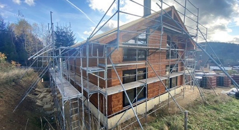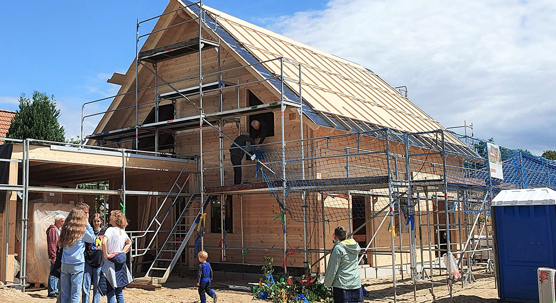 Nicht nur ökologisch und nachhaltig bauen, sondern auch die Kfw Förderung in Anspruch nehmen will die junge Baufamilie. Der Informatiker und seine Frau haben zwei kleine Kinder (davon ein Neugeborenes). Zusammen mit ein paar Familienmitgliedern entsteht das Blockhaus unter der Regie des Fullwood-Richtmeisters mit viel Eigenleistung von Seiten des Baupaares. Ein klassisches, schlichtes Einfamilien Blockhaus mit eineinhalb Geschossen, Satteldach und Carport.