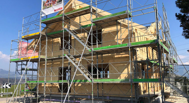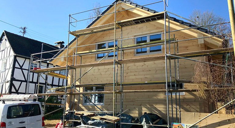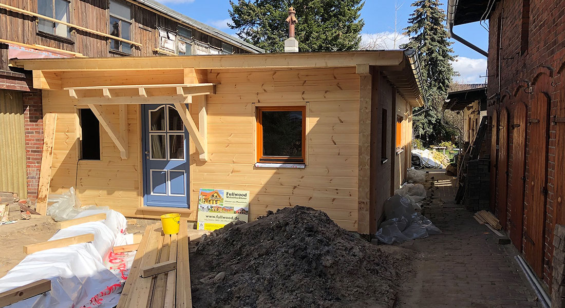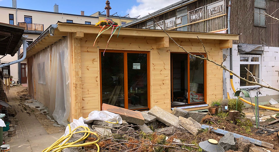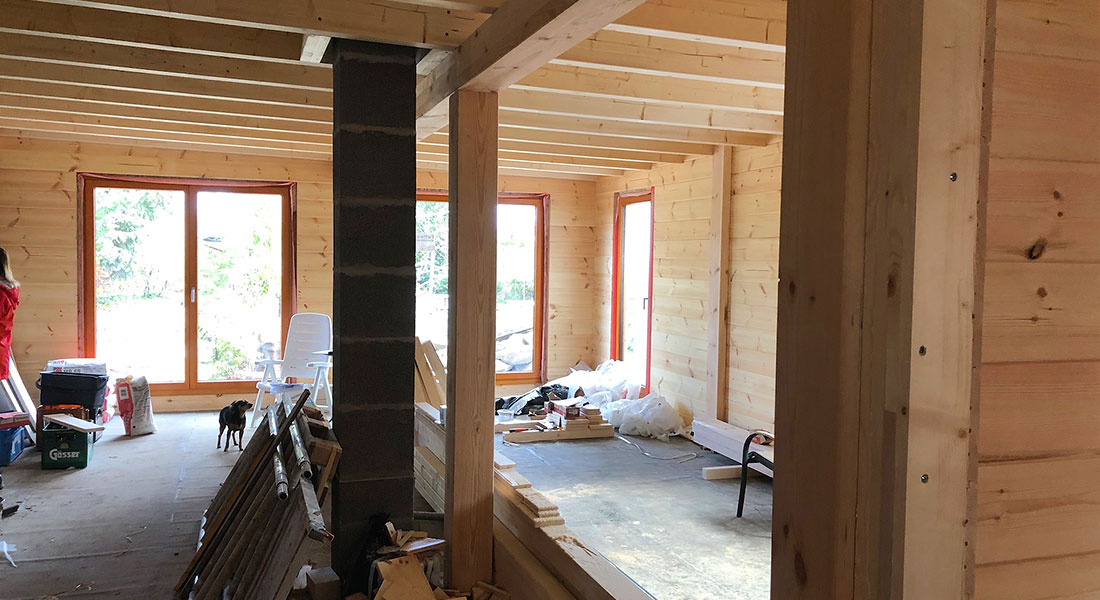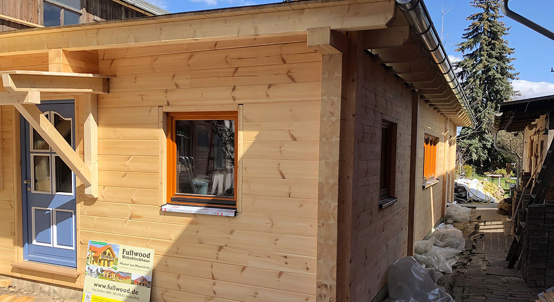 Die Bauherrin wählt für den Anbau die einschalige Blockwand und lässt diese als "Richtmeistermontage" von Fullwood Wohnblockhaus montieren. Vom Altbau wird es später einen Zugang auf die Dachterrasse des neuen Blockhauses geben.