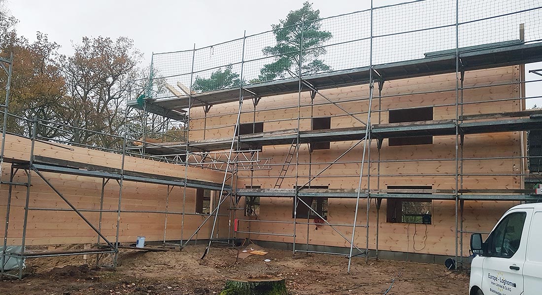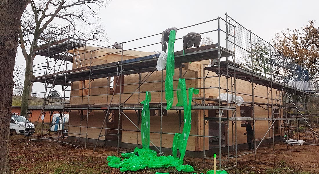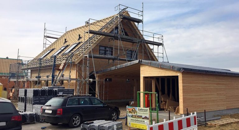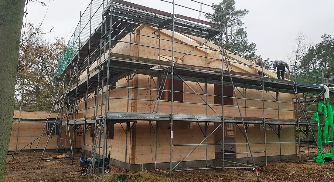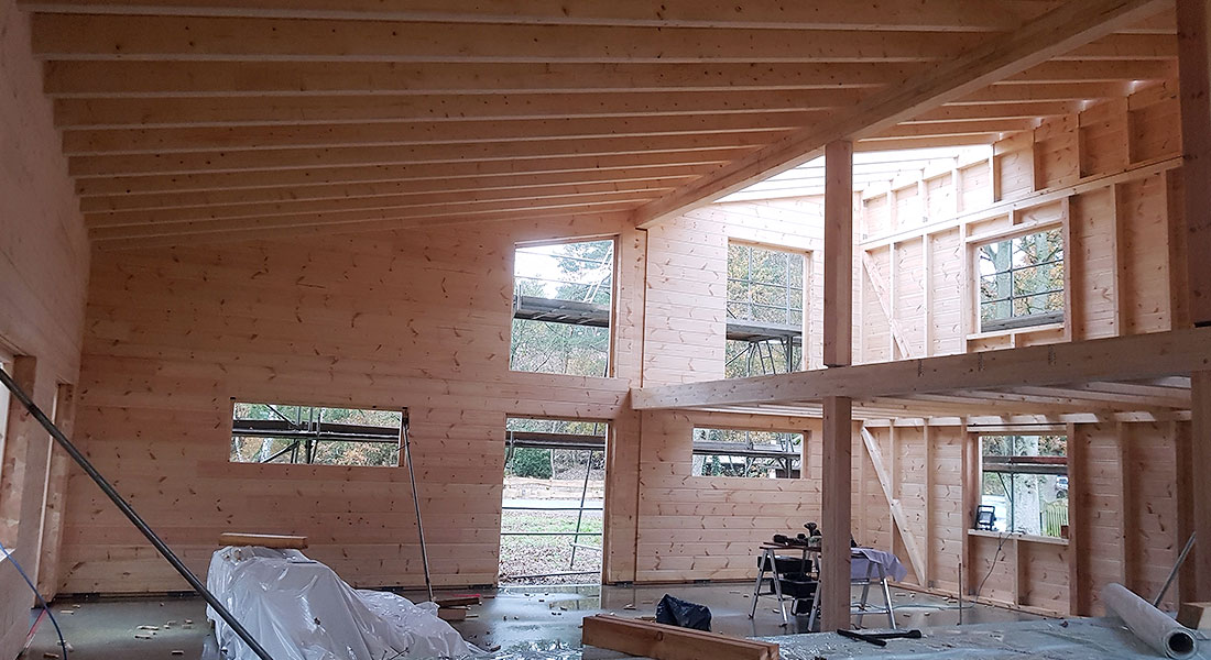 Da die Baufamilie es modern mag, bekommt das Blockhaus ein Pultdach, unter dem sich unter anderem eine Galerie verbirgt. Drei Hauswände bestehen aus der massiven, 20cm dicken Blockwand, die größte Hauswand besteht aber aus der Kombiblockwand (9er Block mit Kerndämmung). Alle Wände sind selbstverständlich absolut winddicht und setzungsfrei und dämmen hervorragend. Ein großer Anbau ergänzt das neue Blockhaus.