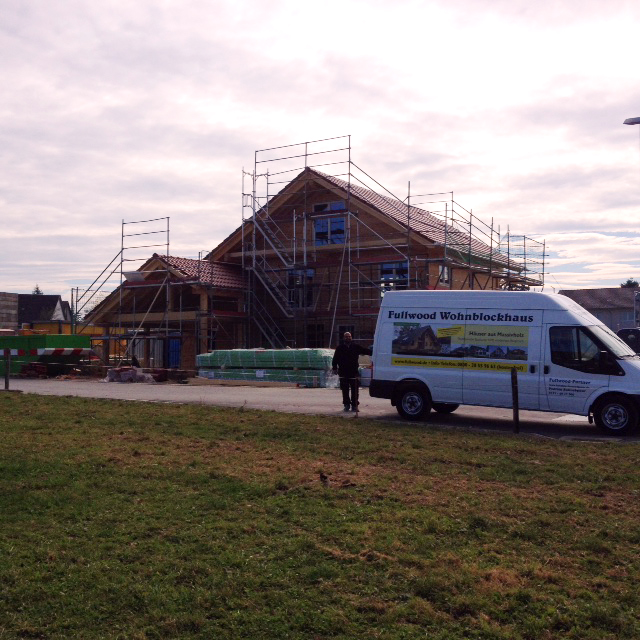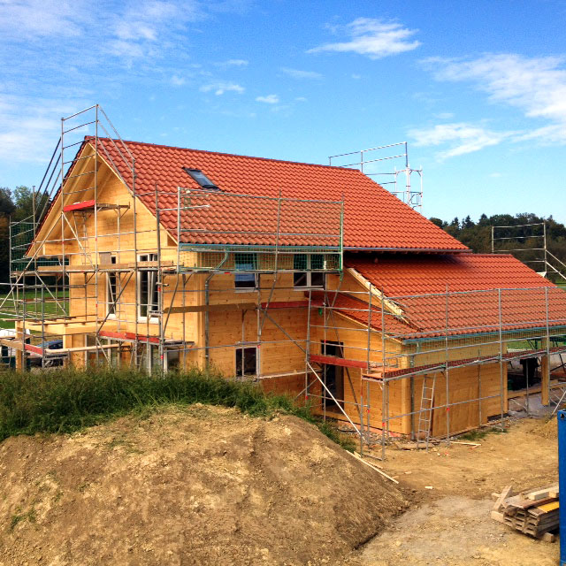 Unterm Dach dieses Blockhauses wird es eine Galerie mit Balkon geben, von wo die Familie den Bodensee sehen kann. Alle drei Geschossebenen werden mit offenen Treppen und großzügigen Lufträumen miteinander verbunden. Obwohl noch unfertig, ist das massive Blockhaus schon jetzt DER Blickfang im Neubaugebiet, und die Bauherren werden nicht müde, ihren zukünftigen Nachbarn von der exklusiven Qualität ihres Blockhauses und der zuverlässigen Planungs- und Bauausführung vorzuschwärmen.