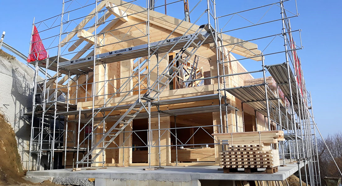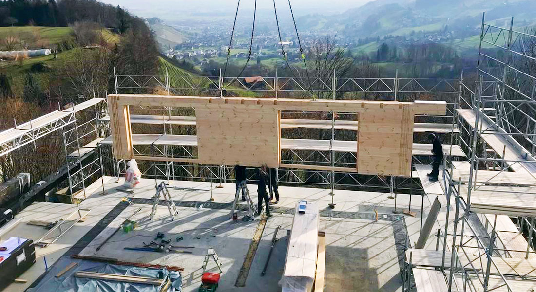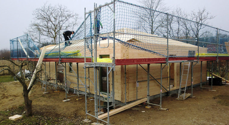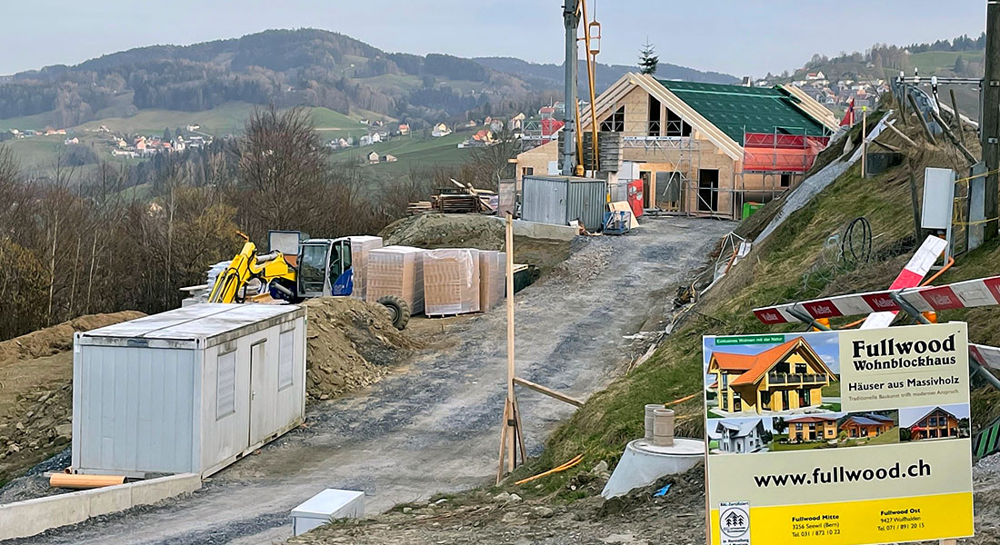 Hier entsteht ein schönes, großes Blockhaus mit 27cm dicken (!) Blockwänden aus massivem Polarkiefernholz. Diese „Königsklasse“ unter den Fullwood-Blockwänden wird überwiegend in der Schweiz nachgefragt, wo andere Energievorschriften und Vorlieben existieren als beispielsweise in Deutschland. Das Blockhaus wird in Hanglage gebaut und ist (auch) deshalb vollunterkellert. Die Bauherrschaft setzt auch bei der Dachdämmung auf Holz und entscheidet sich für eine Holzweichfaser.