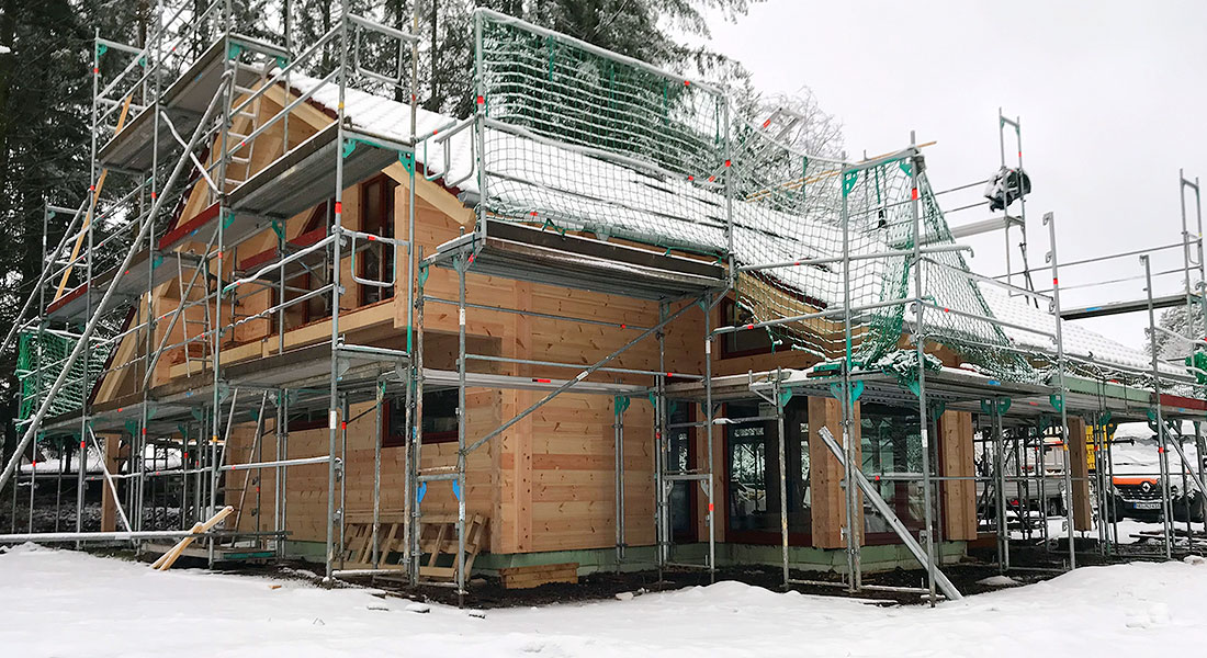 Hier baut ein Ehepaar seinen (Un-)Ruhesitz für den Herbst des Lebens. Das Blockhaus entsteht nahe der französischen Grenze in herrlicher Waldrandlage. Für den Blockhaus Aufbau ist ein Richtmeister von Fullwood Wohnblockhaus mit zwei Helfern verantwortlich. Verbaut wird die einschalige Blockwand, die aus 20cm bestem Polarkiefernholz besteht.
