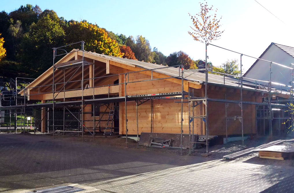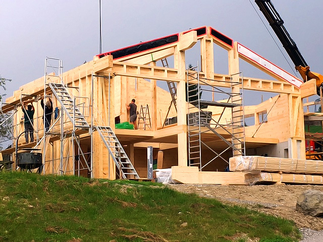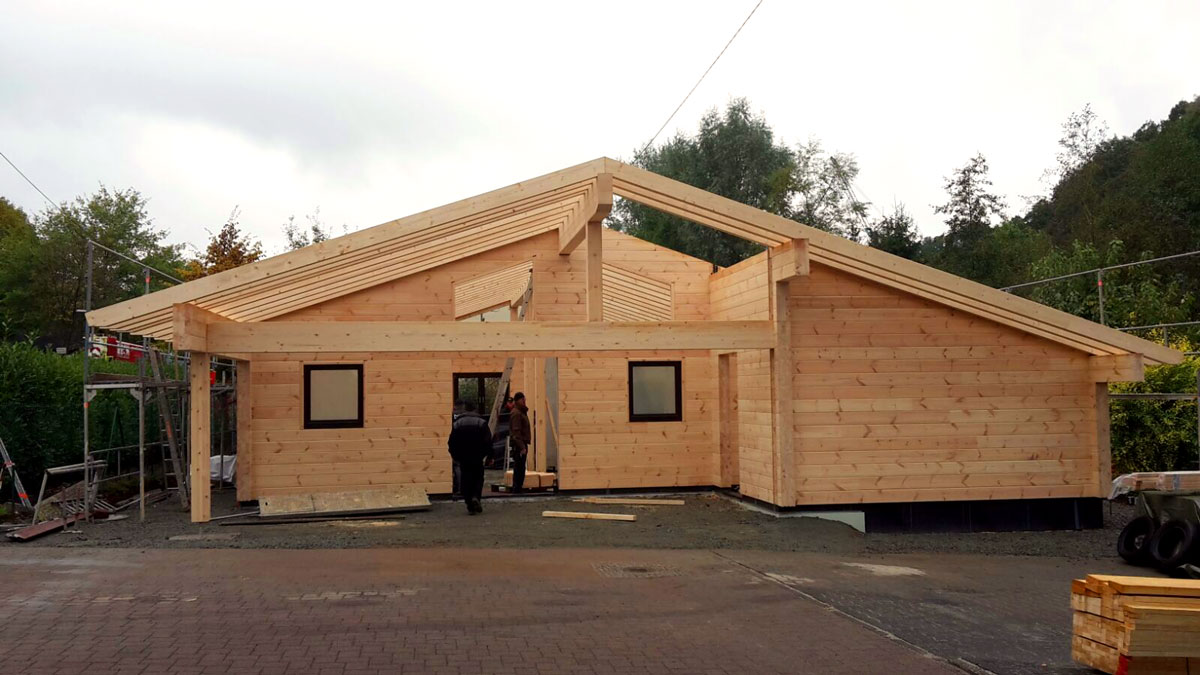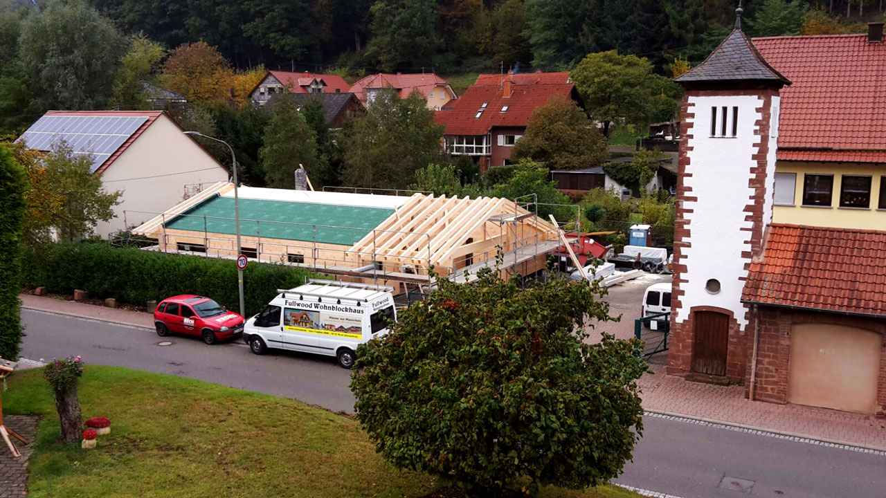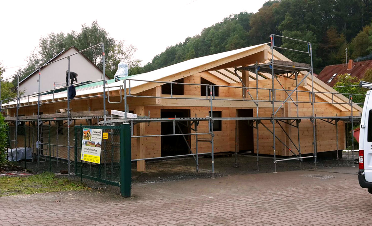 Den Traum vom eigenen Blockhaus erfüllt sich die Bauherrschaft gleich neben der eigenen Autowerkstatt. Das Blockhaus wird eingeschossig von den Fullwood-Monteuren errichtet und besteht aus der 20cm dicken Vollholzwand. Diese ist nicht nur absolut winddicht, sondern auch setzungsfrei, weshalb keine späteren Wartungsarbeiten anfallen. Schrauben wollen die Bauherren nämlich nur an den Autos ihrer Kundschaft und nicht am eigenen Blockhaus!