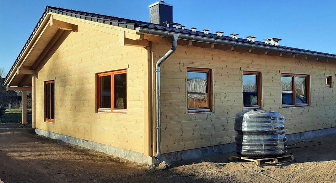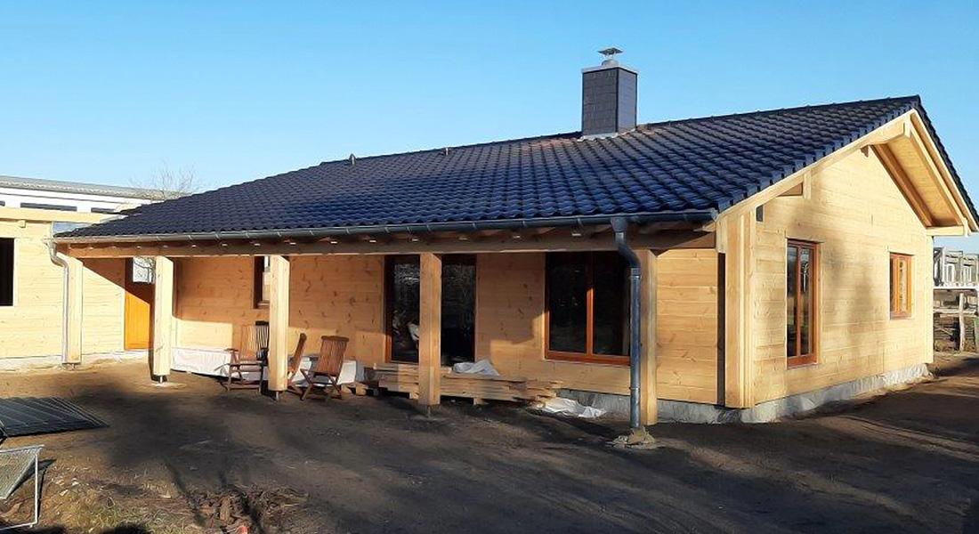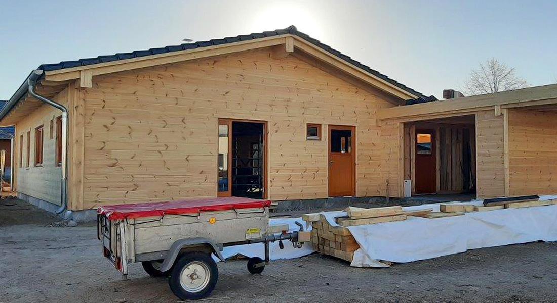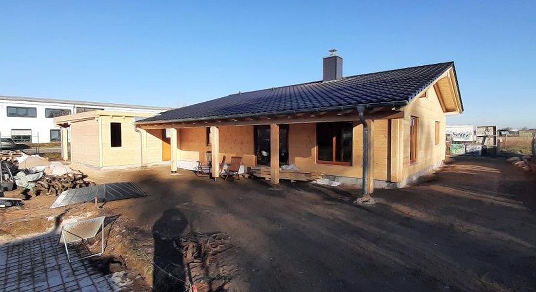 In unmittelbarer Nachbarschaft zu Musterhaus „Havelland“ entsteht dieses eingeschossige Blockhaus. Geplant wird es in Zusammenarbeit der Bauherrin, ihres Zeichens Innenarchitektin, und dem Fullwood-Berater. Gebaut wird dieses Blockhaus als „Richtmeistermontage“, also unter Anleitung und Mitarbeit eines erfahrenen Zimmermanns von Fullwood, und montiert wird die im Kern gedämmte Kombiblockwand.