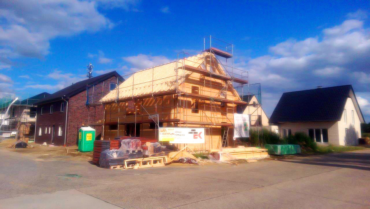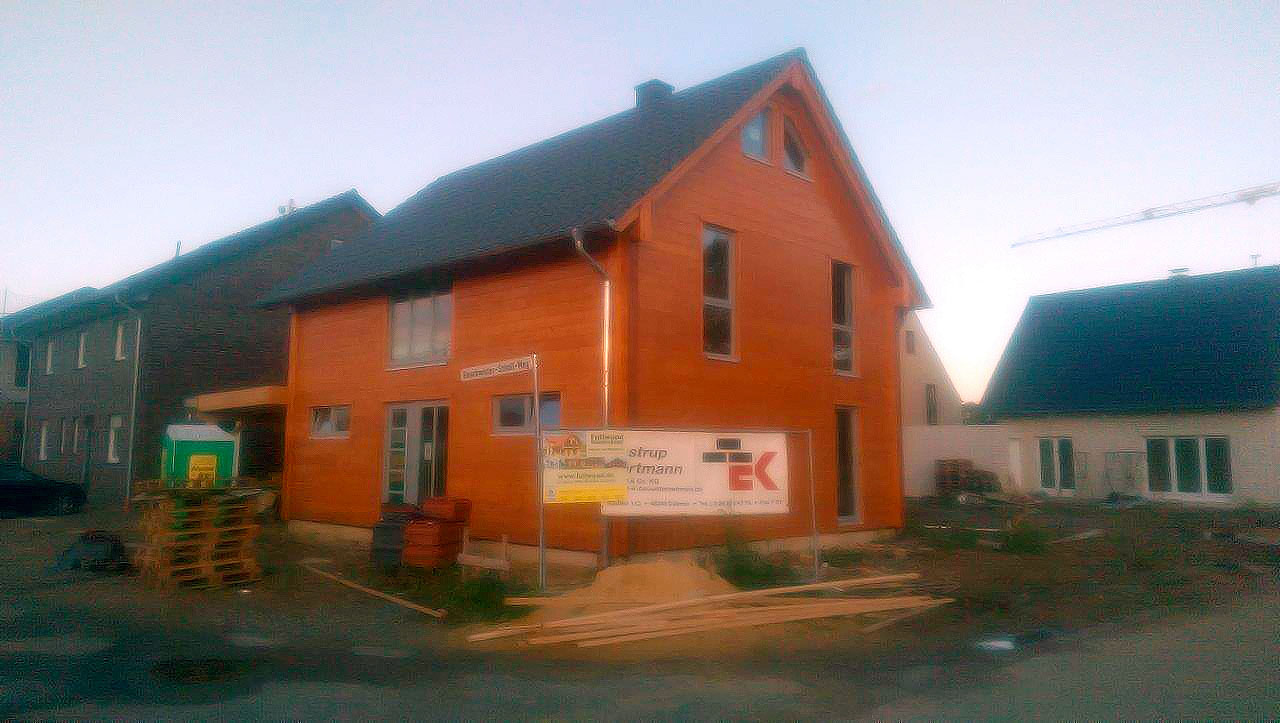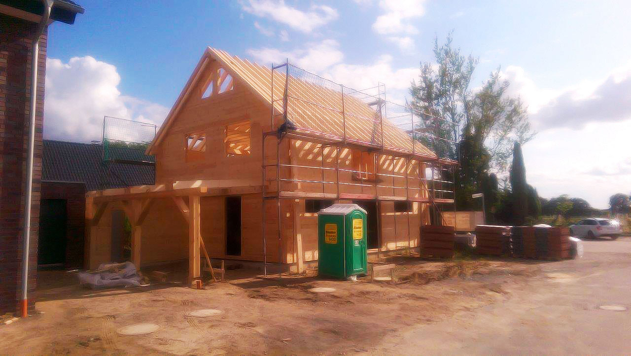 Zwei Vollgeschosse plus ausgebauten Dachstuhl bietet dieses neue Blockhaus von Fullwood. Der sehr effektiv genutzte Baukörper bietet reichlich Fläche für die gesamte Familie. Auf einen Keller verzichten auch diese Bauherren und stellen die 20cm dicken Vollholzwandelemente direkt auf die Bodenplatte. Im Rahmen einer Richtmeistermontage bauen sie ihr Blockhaus selbst mit auf, und führen den Ausbau komplett in Eigenregie durch.