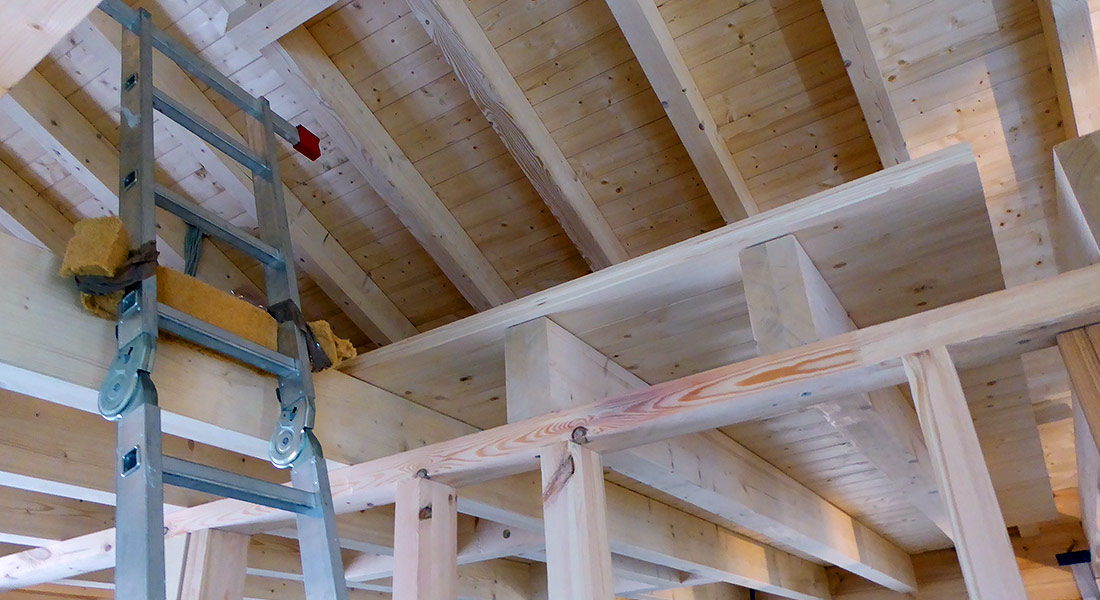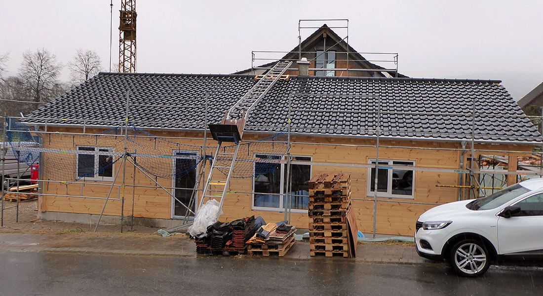 Komplett nach den Vorstellungen der Bauherrin plant und baut Fullwood Wohnblockhaus dieses schöne Blockhaus in nachhaltiger Bauweise. Dazu gehören zum Beispiel hohe Lufträume im Hausinneren, ein sichtbarer Dachstuhl und die Verwendung der im Kern gedämmten Kombiblockwand. Diese Wandalternative zur einschaligen Blockwand ist genau so hochwertig, aber in der Innengestaltung flexibel und mit einem rechnerisch niedrigerem U-Wert. Beim Blockhaus Bau packen die Bauherrin und ihr Partner höchstpersönlich mit an.