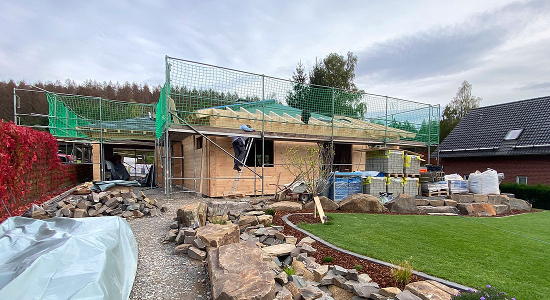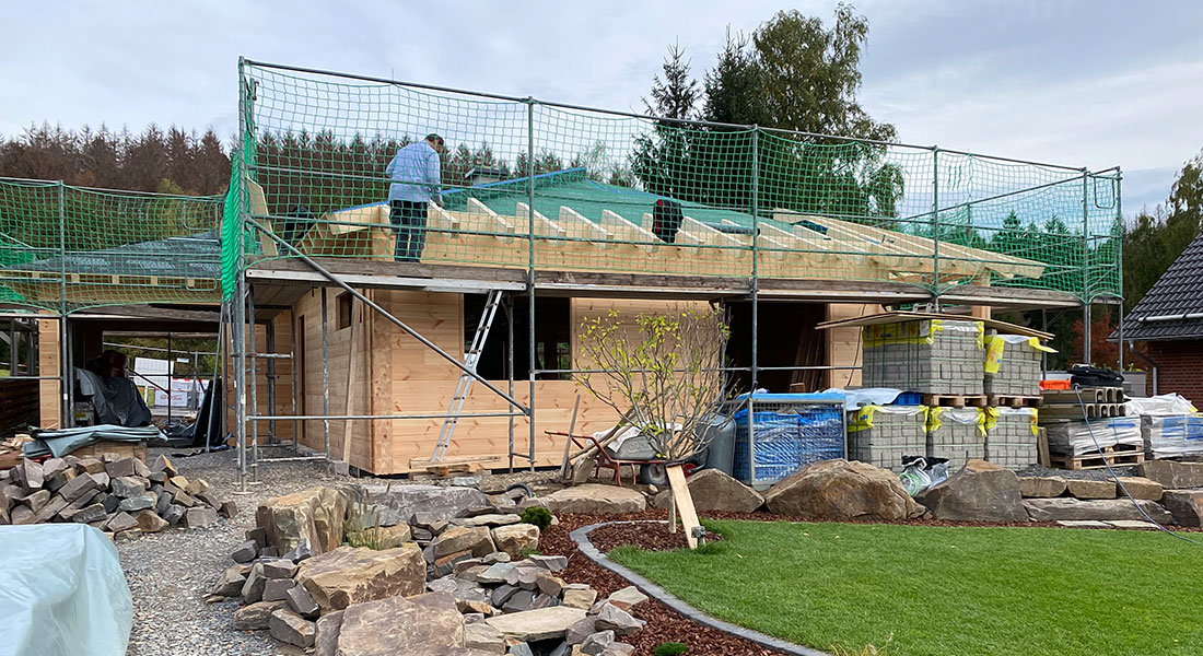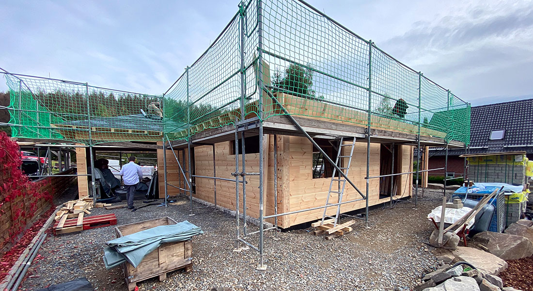 Viel Komfort, moderne Haustechnik und einen sehr hohen Standard wünscht sich die Bauherrschaft für ihr Blockhaus, das „nur“ als Ferien-/Wochenendhaus genutzt wird. Im schönen Bergischen Land liegt das Baugrundstück, dessen Außenanlage bei Montagebeginn bereits fertig angelegt ist. Nach einer detaillierten Hausplanung und exakter Wandfertigung im Werk, geht der Blockhaus Aufbau sehr rasch vonstatten. Die handwerklich begabten Bauherren helfen beim Bau ihres Blockhauses mit. Später verlassen sie sich ganz auf eine Haussteuerung per Smartphone.
