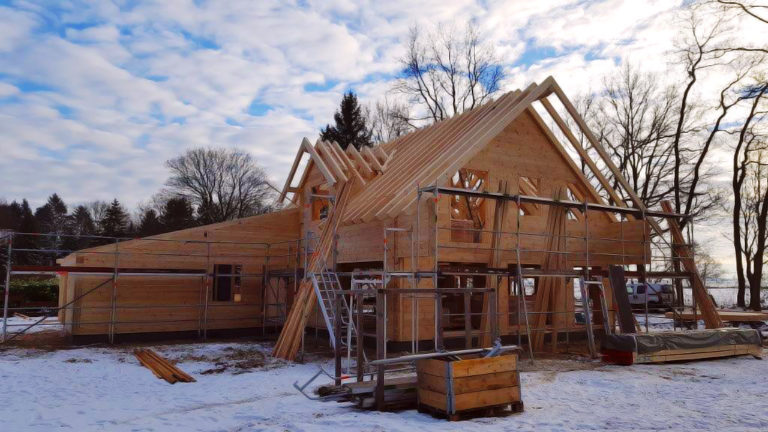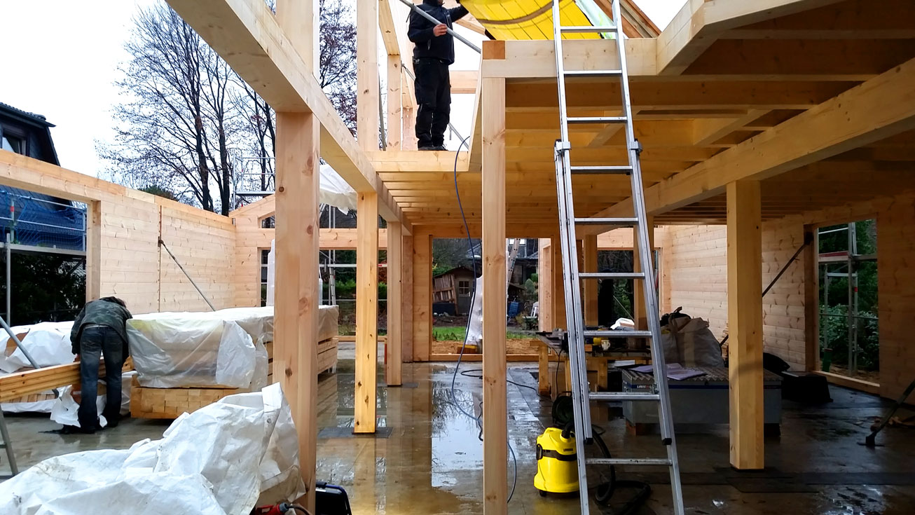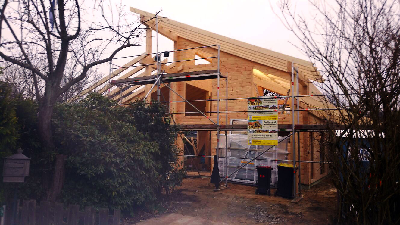 Neben dem Baustoff, massives Kiefernhholz, erhält dieses Blockhaus eine auffällige Dachlandschaft, bestehend aus Pultdächern mit verschiedener Firsthöhe. Modern und unkonventionell mutet das Blockhaus schon jetzt, in der Bauphase, an. Eine Großstadt wie Hamburg verträgt besonders gut so ein in Material und Architektur auffälliges Wohngebäude. Ein erneuter Beweis, dass jedes Blockhaus von Fullwood individuell nach Bauherrengeschmack geplant wird, und dass ein Blockhaus generell jedem Geschmack angepasst werden kann. Holz sieht einfach immer gut aus!