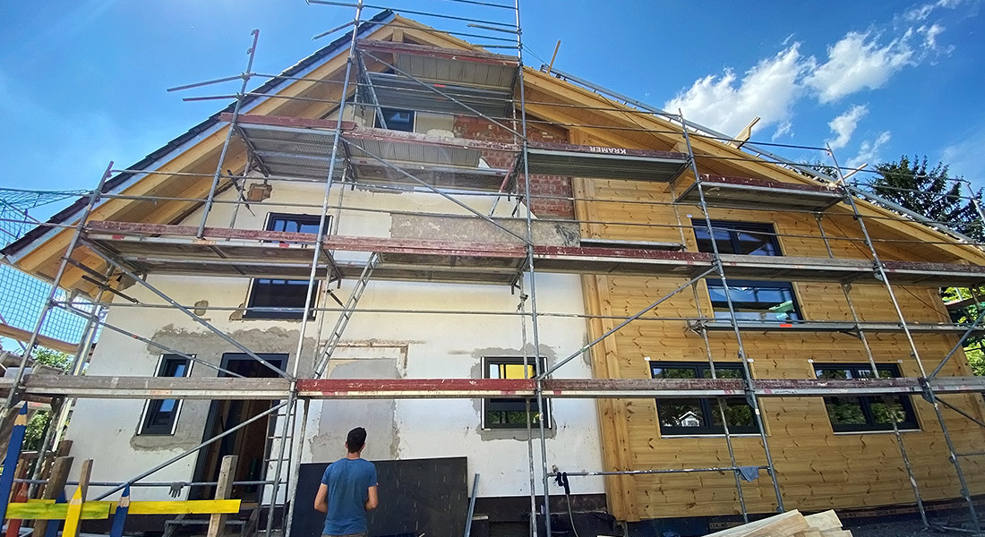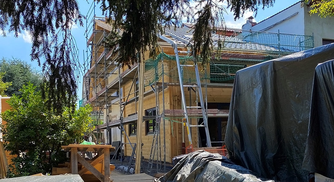 Hier wird das Blockhaus gartenseitig an ein Bestandshaus angebaut, inklusive Dach und neuer Gaube zur Straßenseite. Die junge Baufamilie setzt bei ihrem Blockhaus auf eine kostensparende Richtmeistermontage mit viel Eigenleistung, auch bei der Sanierung des Altbaus. Als Wand-Typ entscheidet man sich für die flexibler gestaltbare, gedämmte Kombiblockwand.