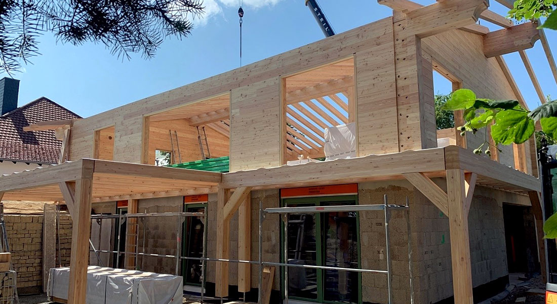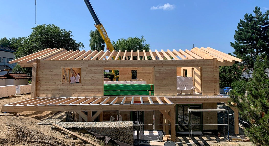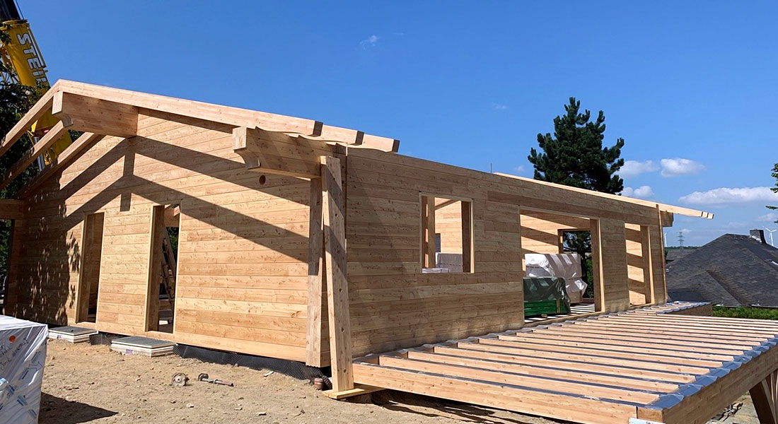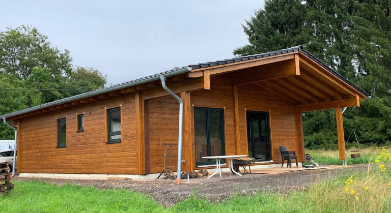 Für ihr eingeschossiges, massives Blockhaus wählt diese Bauherrschaft die mit 27cm extradicke „Luxus“-Blockwand von Fullwood. Die Wand ist einschalig und somit noch energieeffizienter als ihre dünnere Schwester. Selbstverständlich ist auch diese verbaute Wand setzungsfrei und somit wartungsfrei. Das Blockhaus wird komplett von Fullwood Wohnblockhaus auf einem Keller in Vollmontage errichtet inklusive des Einbaus der Holz/Alu-Fenster. Das Baupaar erschafft sich mit seinem Eigenheim aus Massivholz den lang erträumten Altersruhesitz. Einen Außenanstrich wünscht man sich nicht – das Lärchenholz darf also in Ruhe vergrauen.