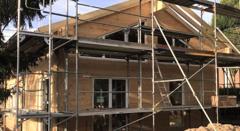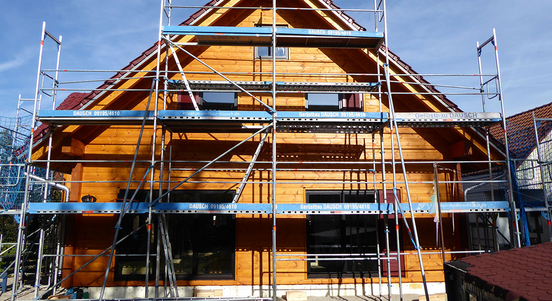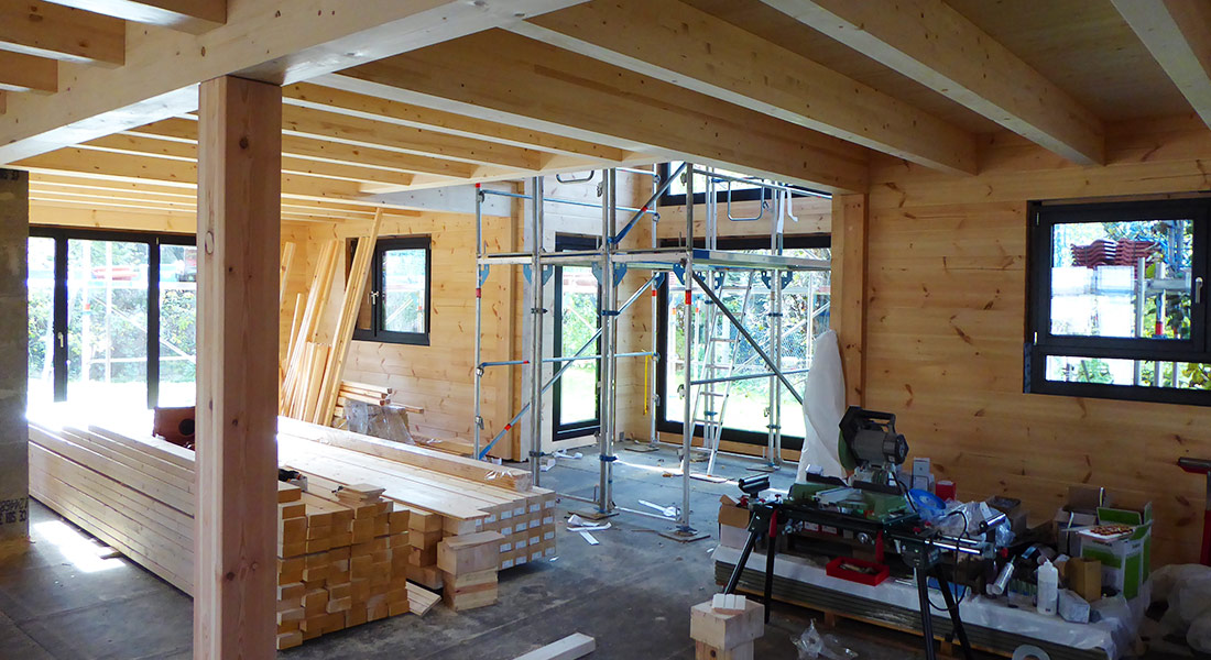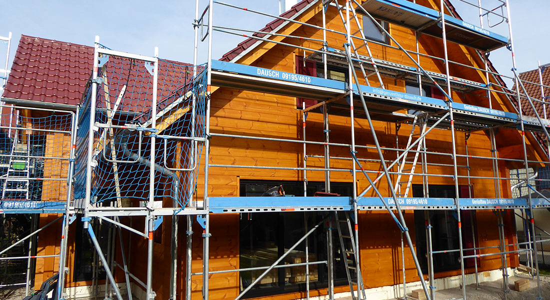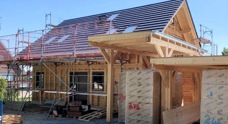 Nachhaltig und ökologisch bauen ist bei uns Standard. Genau wie die Einzigartigkeit jedes von uns geplanten Blockhauses. Dieses im Bau befindliche, eineinhalbgeschossige Einfamilien Blockhaus ist mit 13 x 10m besonders großzügig. Die vierköpfige Baufamilie baut es mit unserer 20er-Blockwand ganz ohne zusätzliche Wanddämmung. Natur pur also und schön warm. Die knifflige Zufahrt zum Grundstück ist hier fast die größte Herausforderung.