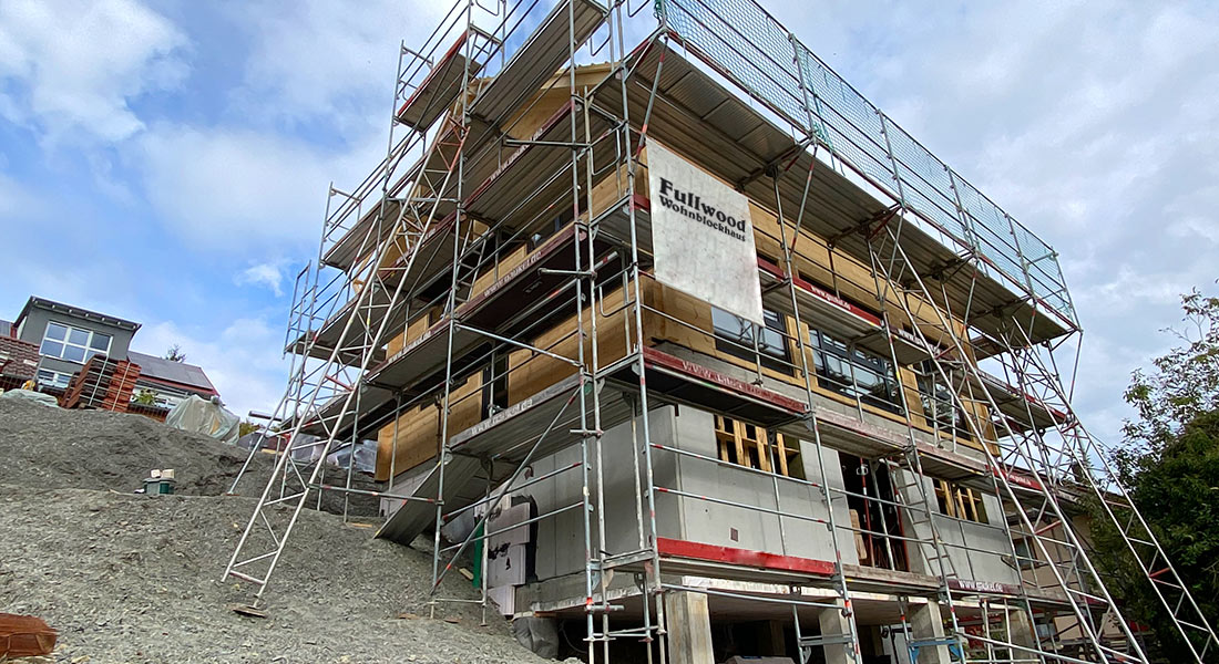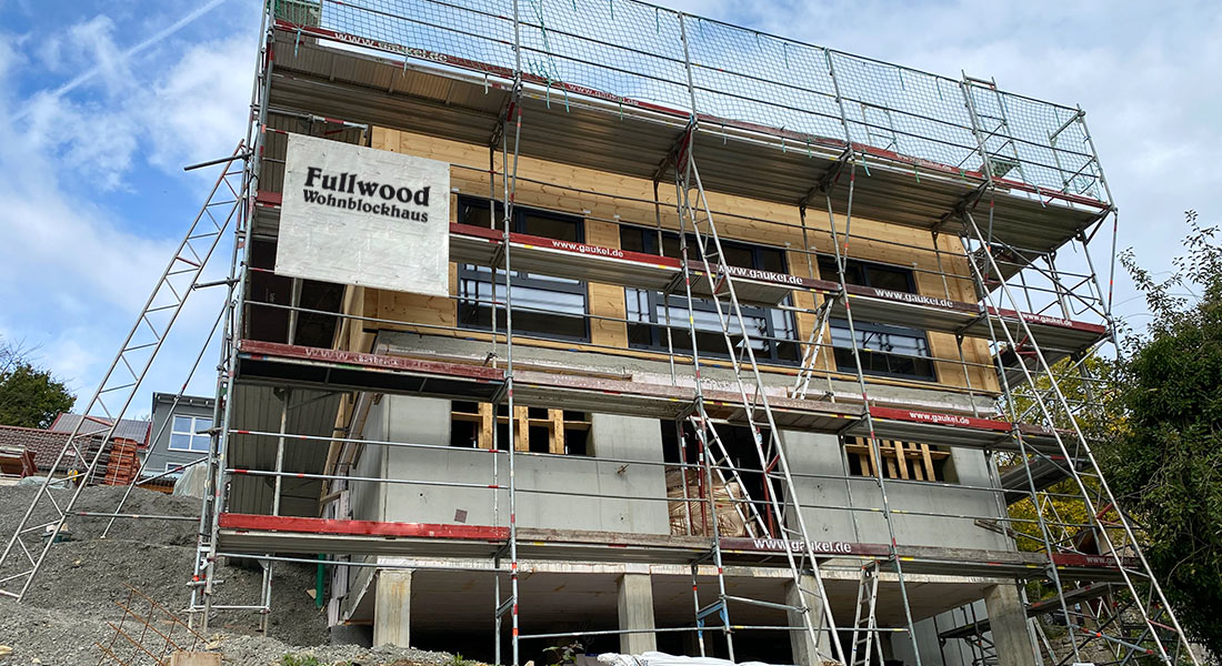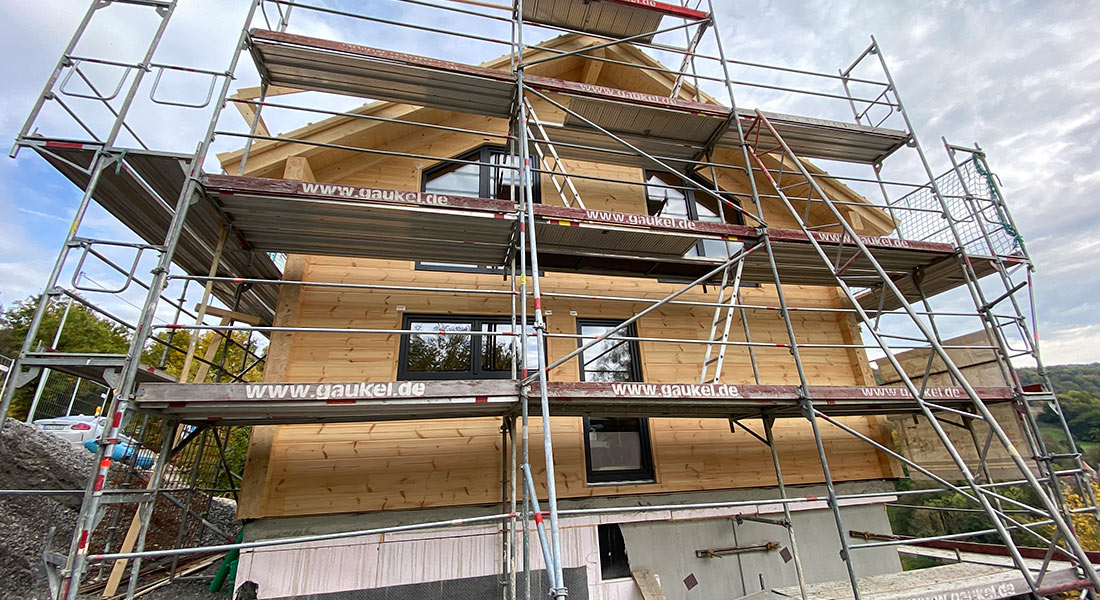 Aufgrund der besonders steilen Hanglage entsteht dieses massive Blockhaus auf gleich zwei Untergeschossen aus Mauerwerk. Das Blockhaus selbst verfügt über eineinhalb Geschosse und wird in Form einer Richtmeistermontage gebaut.