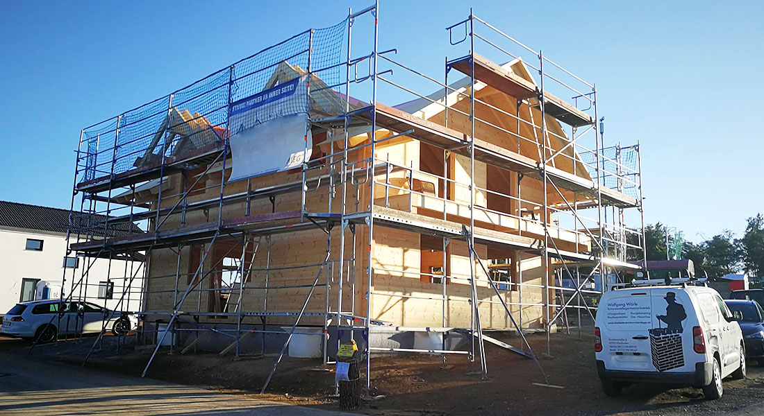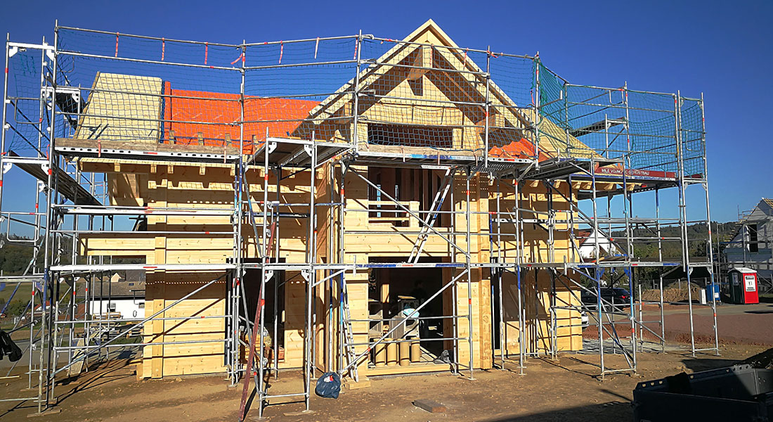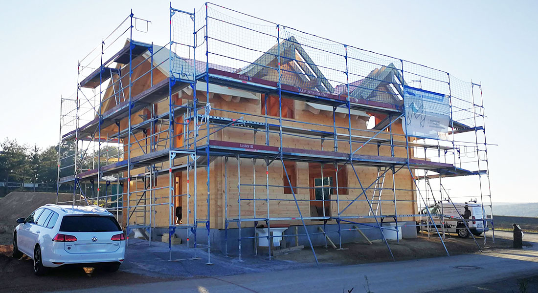 Nachdem der Hausvertrag unter Dach und Fach ist, heiratet das Baupaar noch, bevor es in die ereignisreiche Bauphase geht. Unter der Regie ihres Richtmeisters montieren die Bauherren eigenhändig ihr ökologisches Blockhaus auf den zuvor ebenfalls eigenhändig gebauten Keller. Die 20cm dicken, einschaligen Blockwände werden im Werk passgenau und solide gefertigt, dann in wenigen Elementen überpünktlich zum Bauplatz geliefert, dort mittels Kran an Ort und Stelle gehievt und zum kompletten Blockhaus montiert. Auch im Innenausbau möchte das Baupaar viel selbst machen, was bisher auch alles reibungslos klappt.