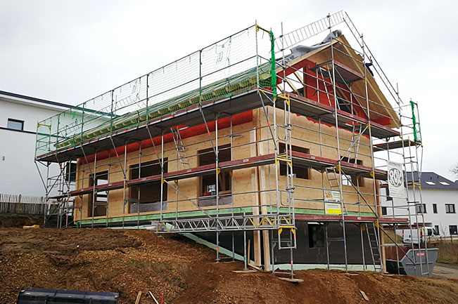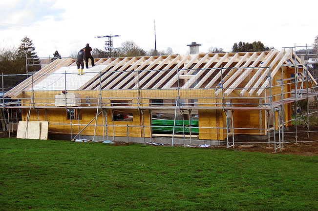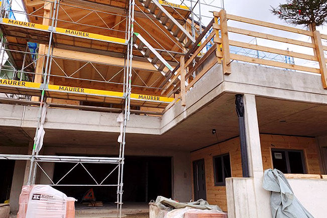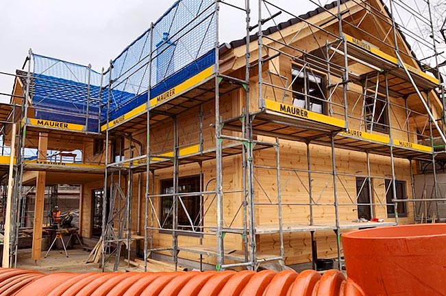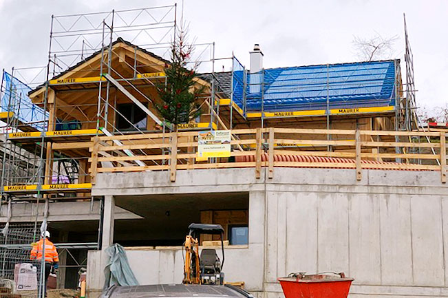 Die gesamte Grundstücksfläche wurde mit einem betonierten Untergeschoss versehen, das Doppelgarage, Werk- und Nebenräume sowie einen großzügigen Eingangsbereich aus Fullwood-Massivholzwänden beinhaltet. Auf den circa 350m² Untergeschossdecke wird nun das eigentliche Blockhaus gebaut, das später noch mit Terrassen- und Rasenfläche ergänzt wird. Die gleichermaßen anspruchsvollen wie begeisterten Bauherren bauen ihr Blockhaus mit dem Fullwood-Richtmeister in Eigenregie.
