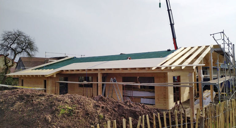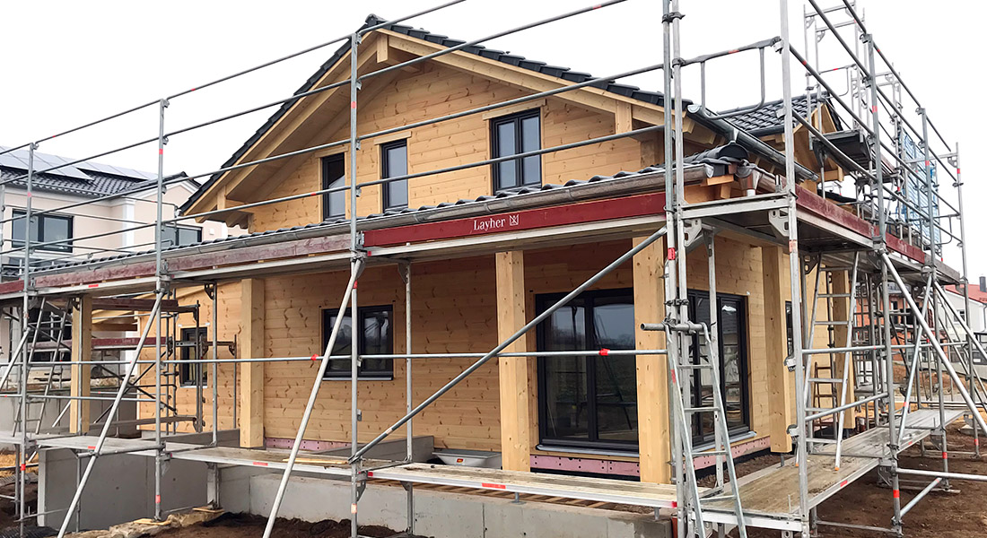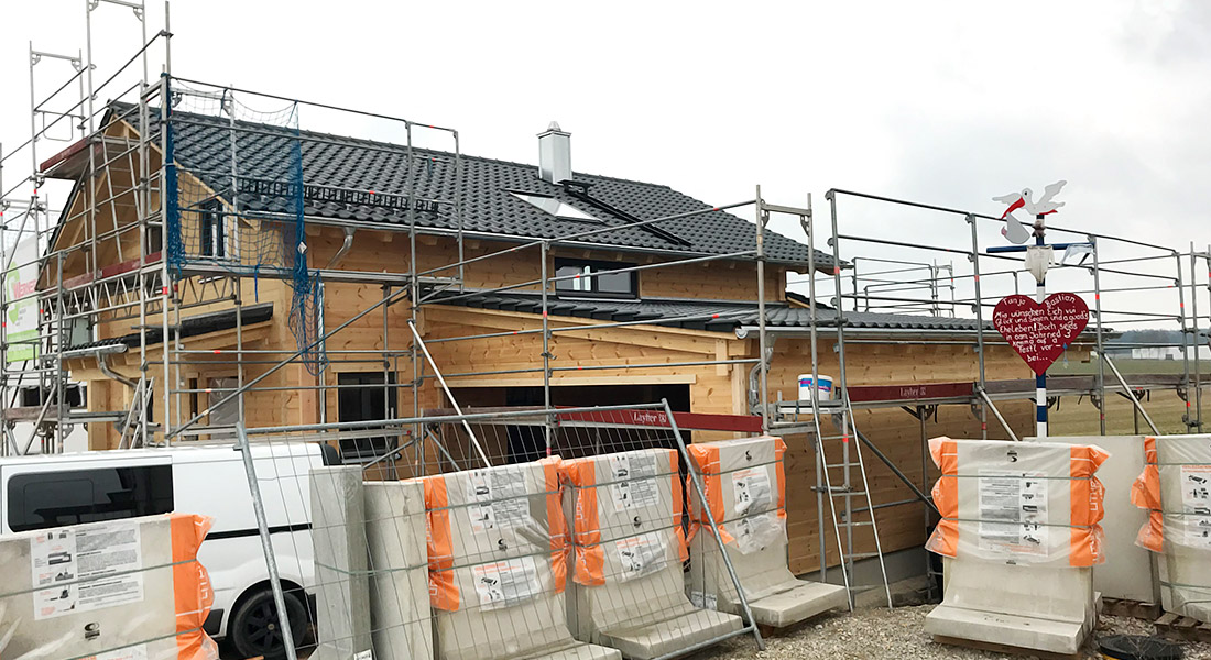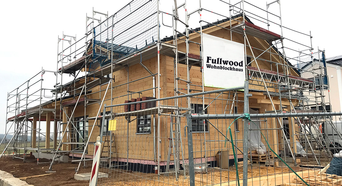 Hier wird ein Blockhaus für ein Rentnerehepaar gebaut. Das Baupaar möchte den neuen Lebensabschnitt in der Nähe seiner Kinder verbringen und verkauft deshalb das Bestandshaus. Als Baustufe wird eine Vollmontage gewählt, bei der die Fullwood-Monteure das Blockhaus rasch, routiniert und plangenau errichten. Montiert wird die einschalige, 20cm dicke Blockwand.