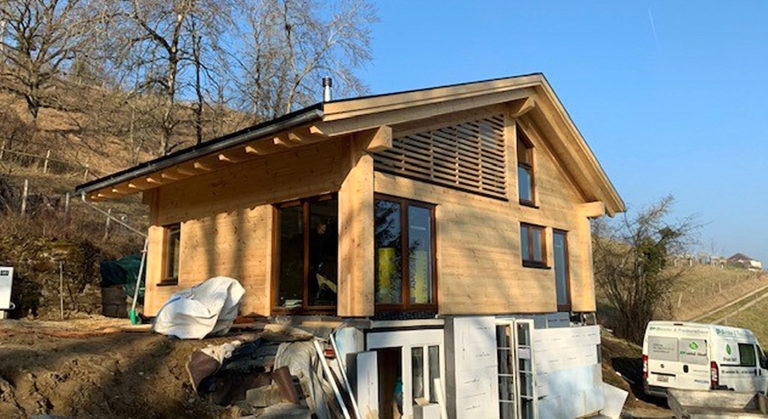 Was lange währt, wird endlich gut: Schon vor drei Jahren bestellt die junge Baufamilie ihr ökologisches Blockhaus bei Fullwood Wohnblockhaus, allein die lokale Schweizer Baubehörde braucht etwas mehr Zeit für die Baugenehmigung. Nun wird das nachhaltige Blockhaus unter Verwendung der extra-dicken, einschaligen 27er Blockwände Schlag auf Schlag und mit großer Sorgfalt gebaut.