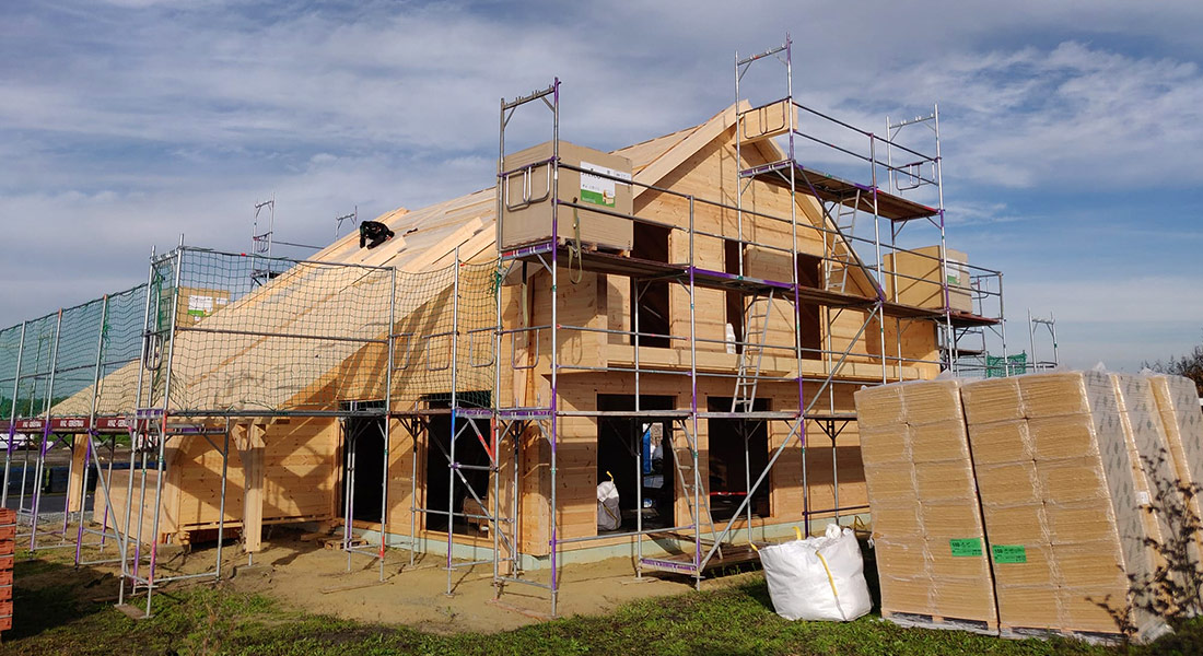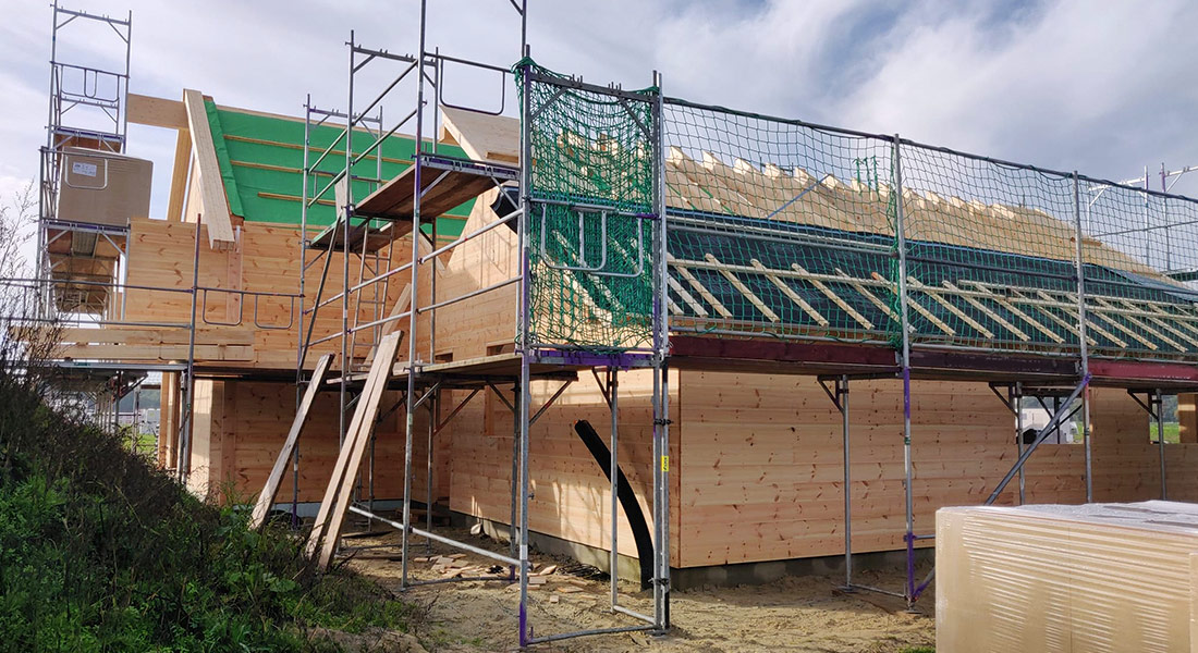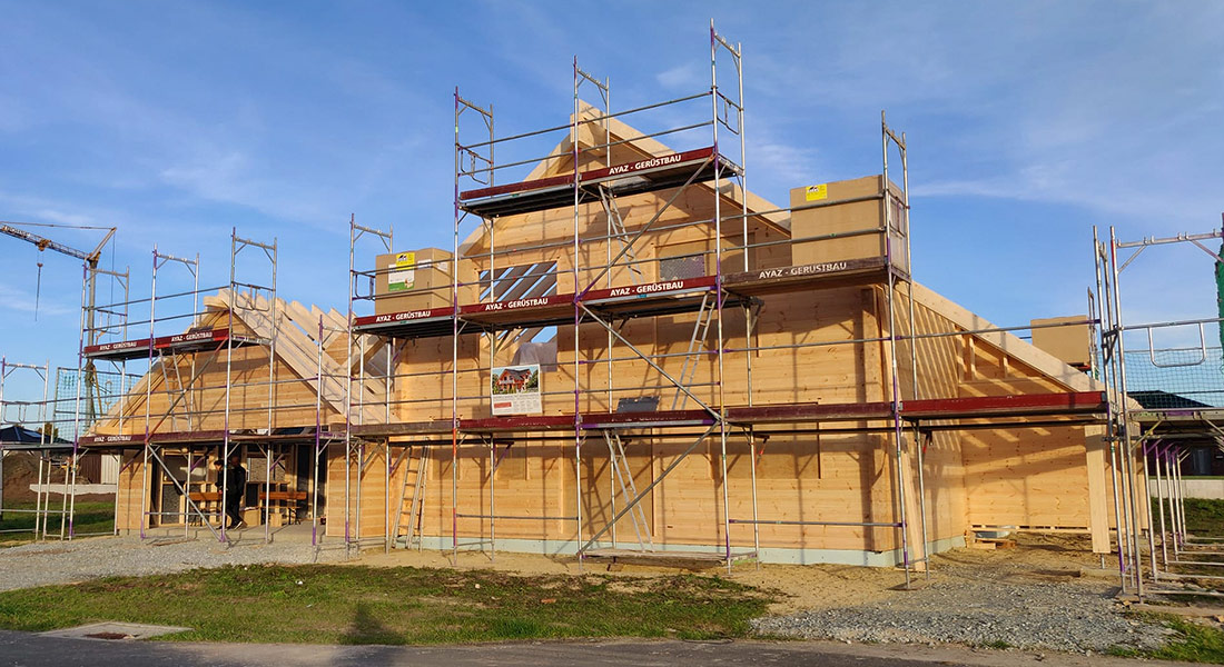 Hier baute ein Lehrerpaar sein Blockhaus mit viel Eigenleistung in den großen Sommerferien. Mittlerweile ist der Baufortschritt des Eigenheims natürlich deutlich weiter und es kann bald eingezogen werden. An den 20cm dicken Kiefernblockwänden ihres Blockhauses schätzt das Baupaar die Dämmfähigkeit, die Winddichtigkeit und die Natürlichkeit (chemisch unbehandeltes Polarkiefernholz!) sowie auch die Optik, die Haptik und den Duft des hellen Holzes.