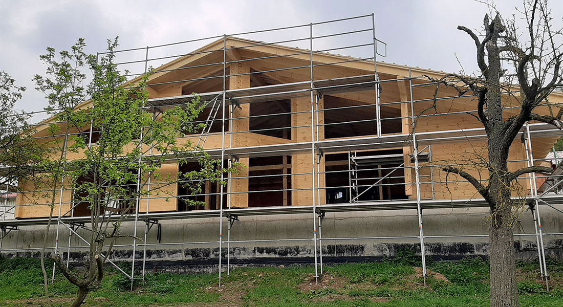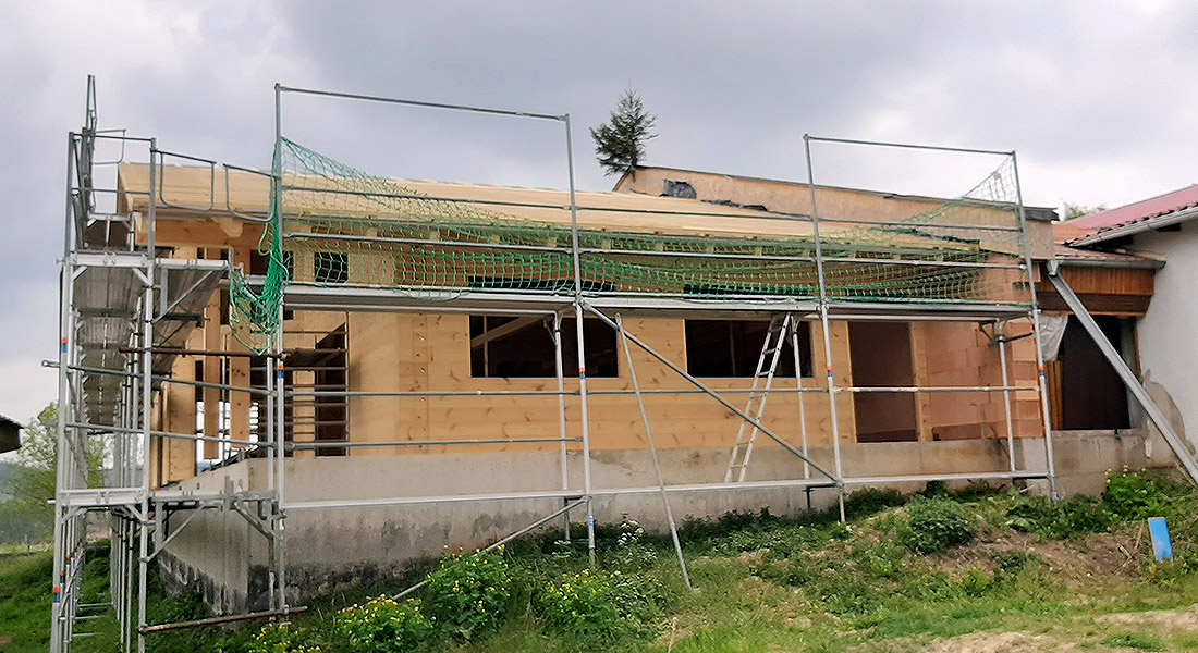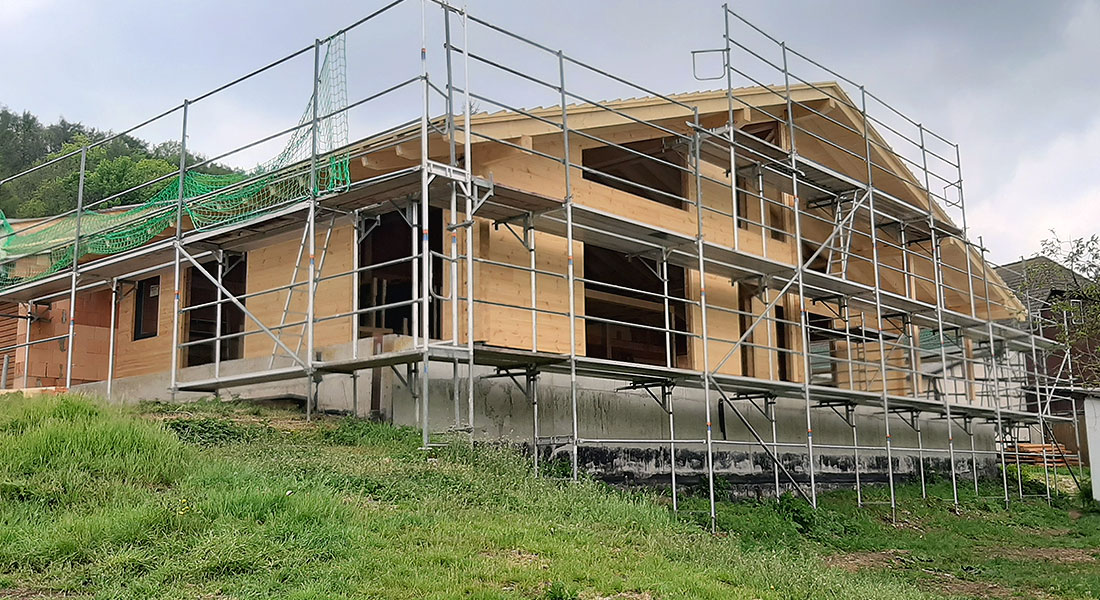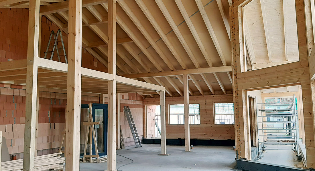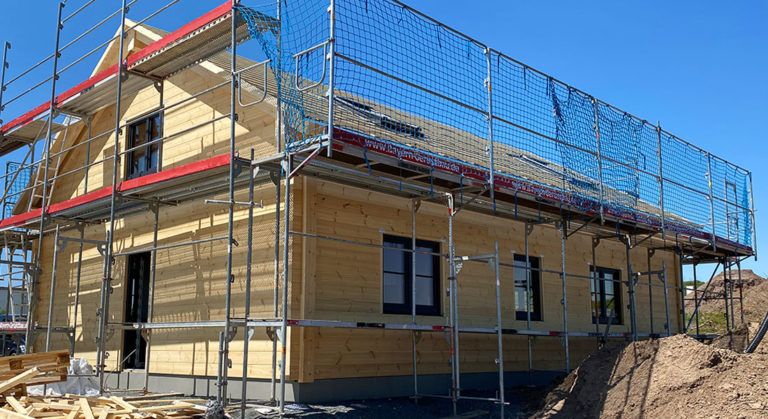 Die Bauherren, es handelt sich um Landwirte, entscheiden sich bei ihrem Blockhaus für die solide, einschalige Blockwand aus schadstofffreiem Kiefernholz und große, bodentiefe Fensterflächen für lichtdurchflutete Räume.