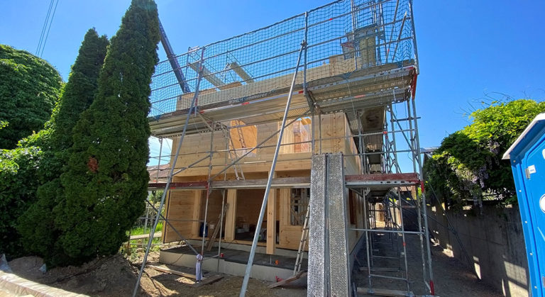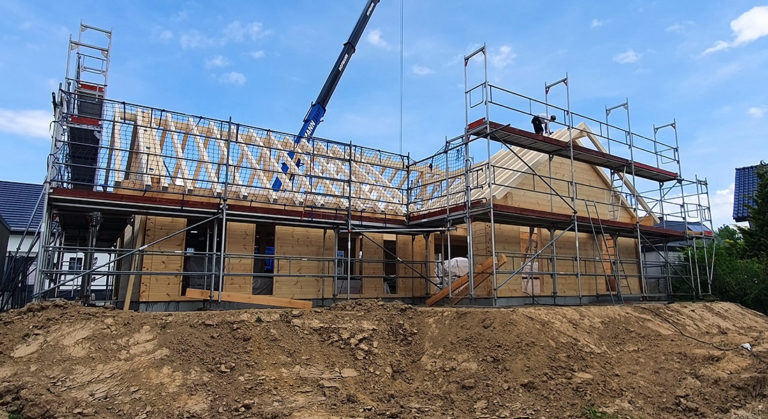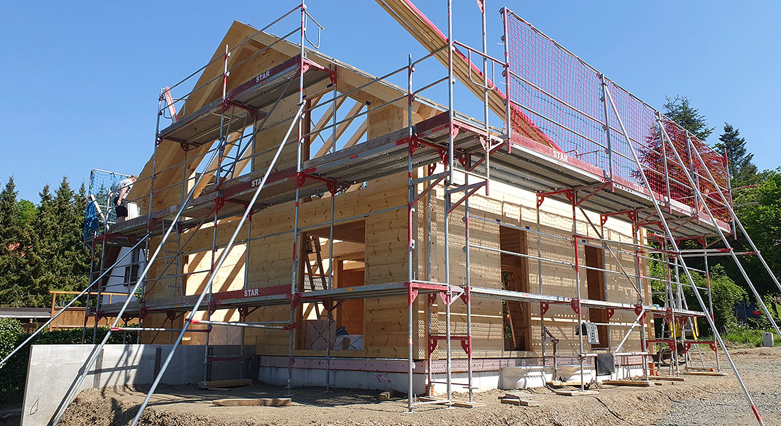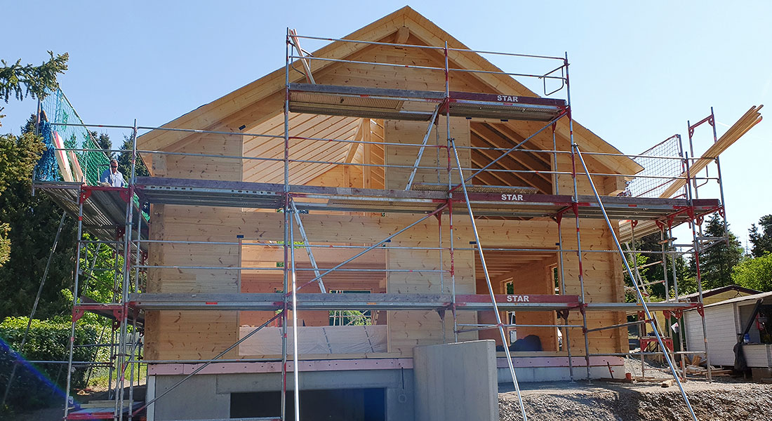 Hier wird ein Ferienhaus abgerissen und an seiner Stelle ein schönes neues Blockhaus gebaut. Die Bauherrin lässt es sich nicht nehmen, die 20cm dicken einschaligen Blockwände höchstpersönlich zu streichen. Überhaupt erbringt die Bauherrschaft viel Eigenleistung bei der Hausmontage. Abgesehen von ihrem ökologischen Blockhaus freut sich das Baupaar auch sehr auf die wunderschöne Aussicht, in deren Genuss es bald tagtäglich kommen wird.