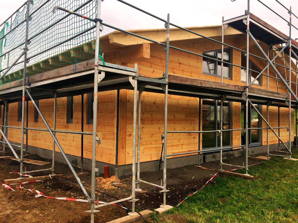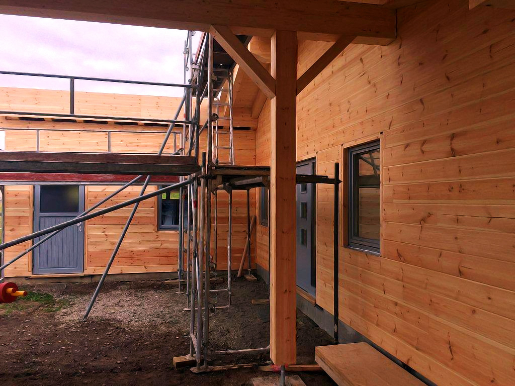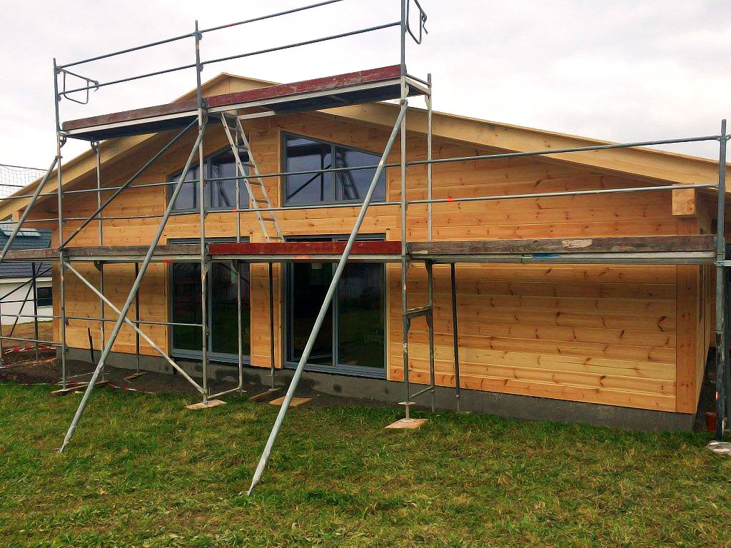 Schon bei der Wandmontage von Blockhaus Ahrweiler packen die Bauherren kräftig mit an und werden den Innenausbau komplett in Eigenregie durchführen. Dank eines Carports und einer großen Garage, ist das Blockhaus in eine U-förmige Gebäudeanordnung integriert. Im späteren Wohnalltag wird sich das als sehr praktisch und bequem erweisen. Obwohl man im Zusammenhang mit einem Blockhaus von Fullwood natürlich nie von "Alltag" – im Sinne von trist und langweilig – sprechen kann, sondern ein Leben lang ausschließlich "Genusswohnen" in Reinkultur erleben wird!