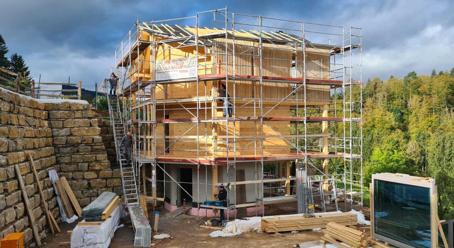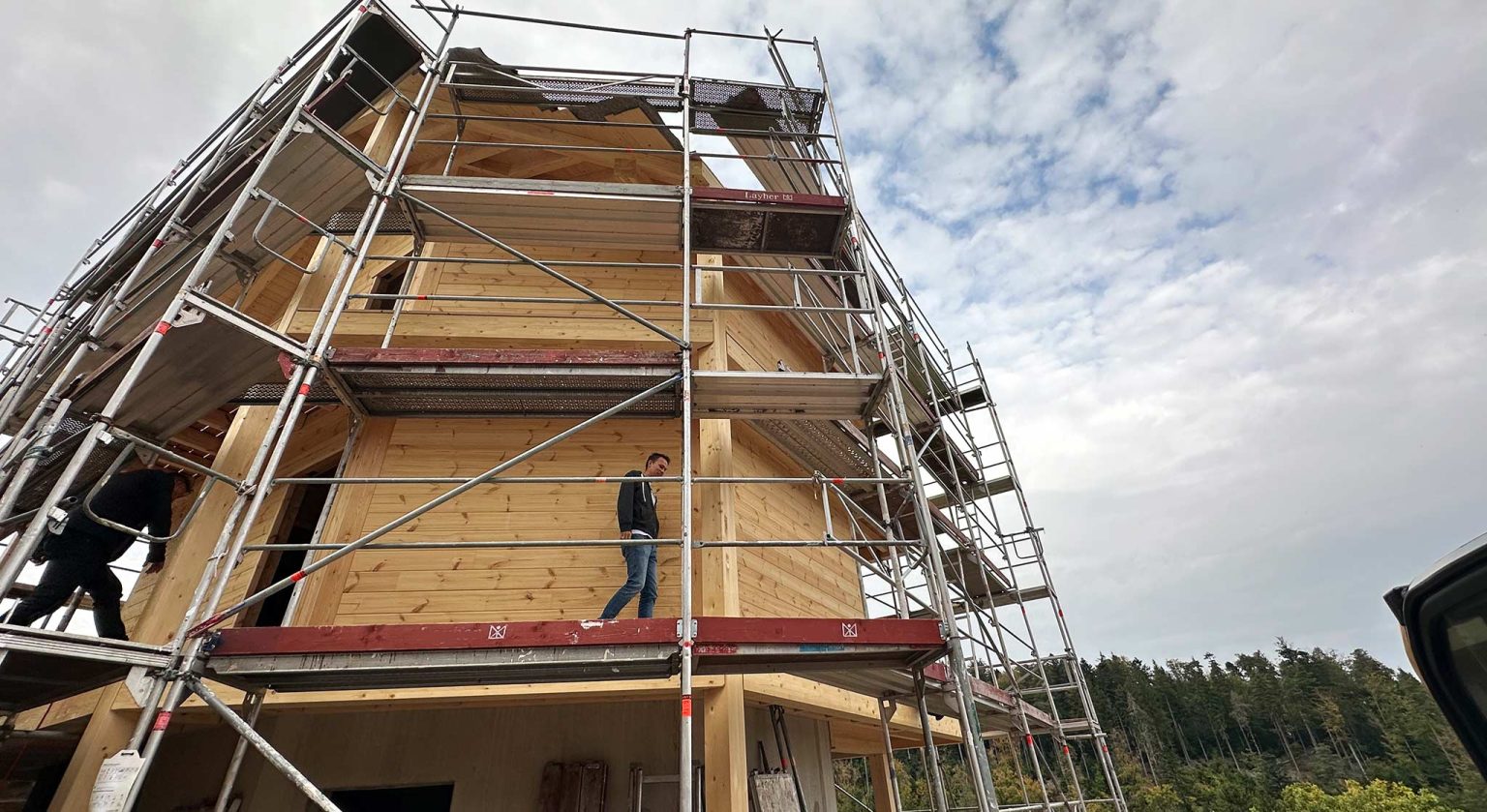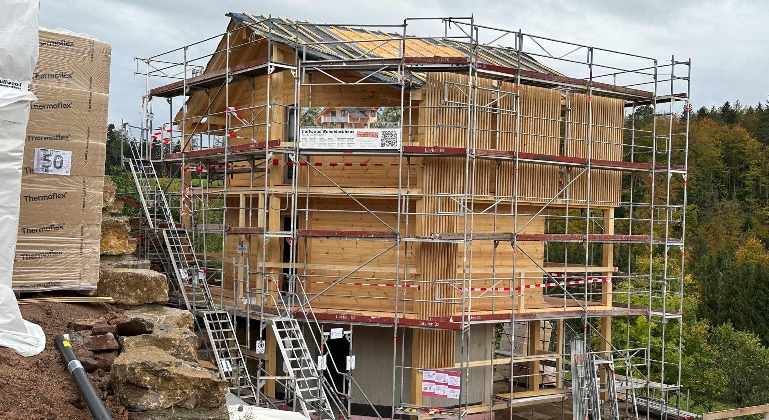 Blockhäuser ("Schwarzwalddeck") für Feriengäste am Buckelweg im Gaistal. Der Bauherr, ein ideenreicher und geschäftstüchtiger Selfmade-Mann mit ökologischem und spirituellem Bewusstsein, baut nicht zum allerersten Mal, auch nicht zum ersten Mal mit Holz, aber erstmalig mit Fullwood Wohnblockhaus. In enger Zusammenarbeit mit Fullwood werden die