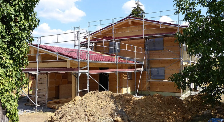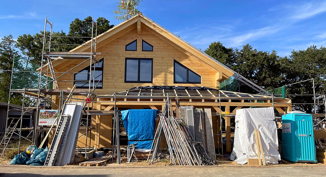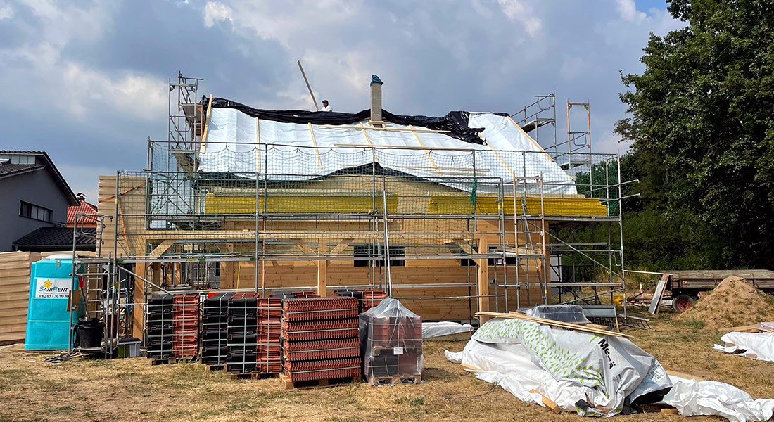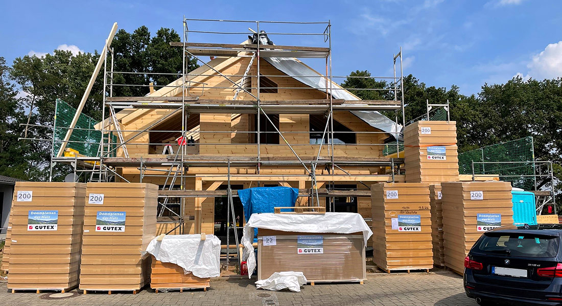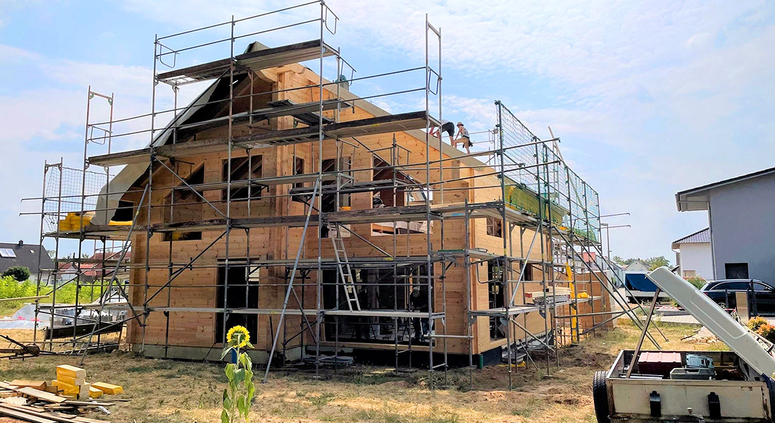 Hier packt ein junges Baupaar bei der Montage des eigenen Blockhauses mit an. Die Ingenieure lassen sich vom zuständigen Fullwood-Richtmeister instruieren und vorarbeiten. Das klappt wunderbar, zumal alle Wandelemente im Werk exakt auf den Millimeter vorgefertigt werden. Das unterkellerte, massive Blockhaus bekommt einen Sichtdachstuhl, da die Bauherrschaft sich für schöne Holzkonstruktionen begeistert. Auch die ökologische nachhaltige Bauweise ihres zukünftigen Einfamilienhauses findet das Baupaar ideal.