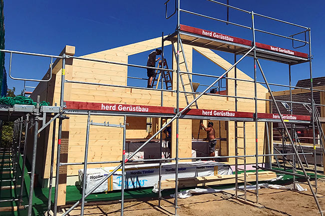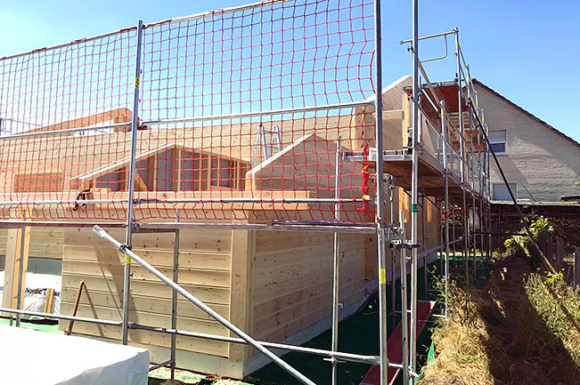 Hier der Baufortschritt nach 1,5 Tagen. Für ihr Blockhaus wählt die Bauherrschaft die durch und durch Holz-massive, einschalige Blockwand. Deren Stärke beträgt 20cm, und sie wird fix und fertig in wenigen Elementen in der Werkstatt angefertigt. Auf der Baustelle passt alles perfekt zusammen. Dank der Fertigkonstruktion ist jedes Blockhaus von Fullwood nahezu setzungsfrei und somit dauerhaft wartungsfrei.