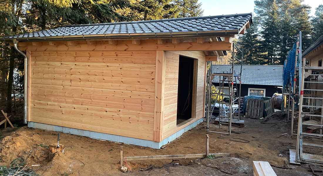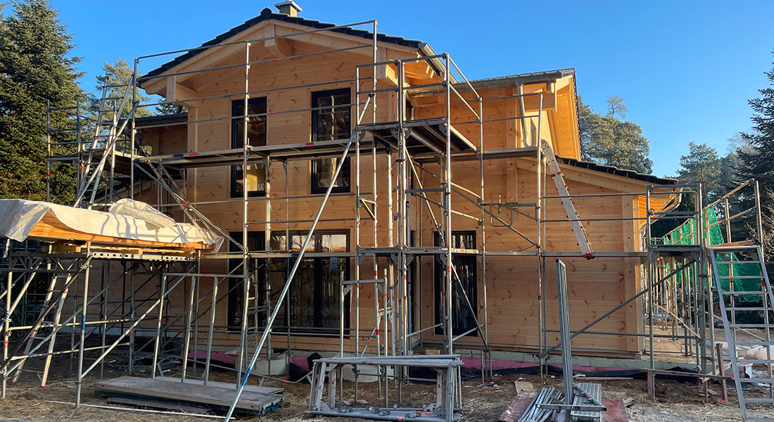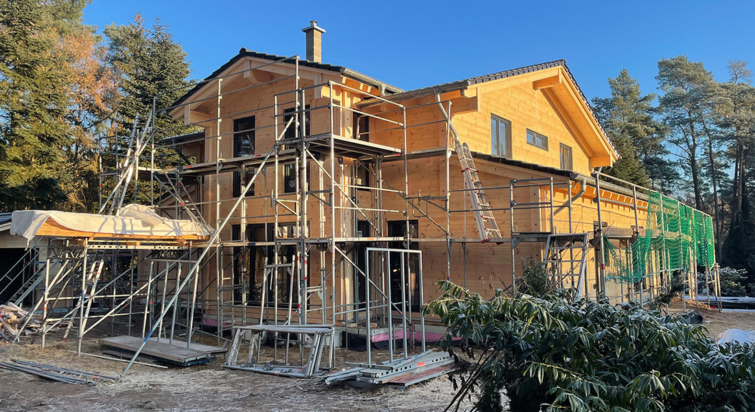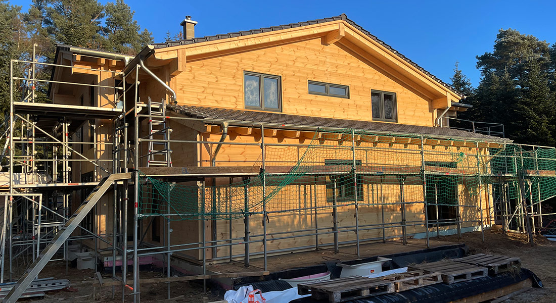 Zwei Vollgeschosse in ökologischer und nachhaltiger Bauweise vereint dieses Blockhaus nahe der Hansestadt. Da gibt es besonders viel Stellfläche im Obergeschoss. Die Baufamilie hat sich für die gedämmt Kombiblockwand und einen imposanten Sichtdachstuhl entschieden. Das Blockhaus ist außerdem komplett unterkellert.