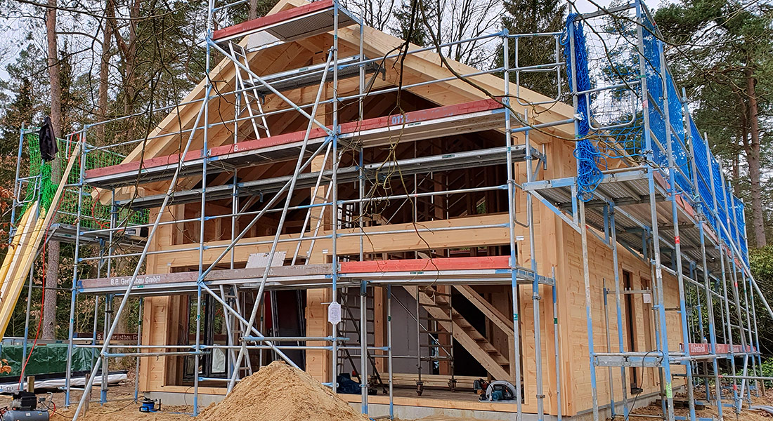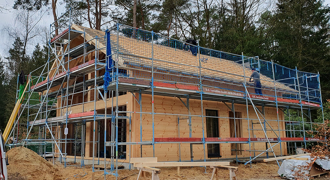 Auch dieses Blockhaus entsteht in nachhaltiger Bauweise und wird ganz nach den Wohnbedürfnissen der Bauherrschaft geplant. Montiert werden hier 20cm dicke, einschalige Blockbohlenwände aus Polarkiefernholz und eine der beiden Giebelseiten wird auf beiden Geschossen fast vollständig verglast. Geradlinige, klassisch-moderne Holzarchitektur mit lichtdurchfluteten Räumen wartet darauf belebt zu werden.