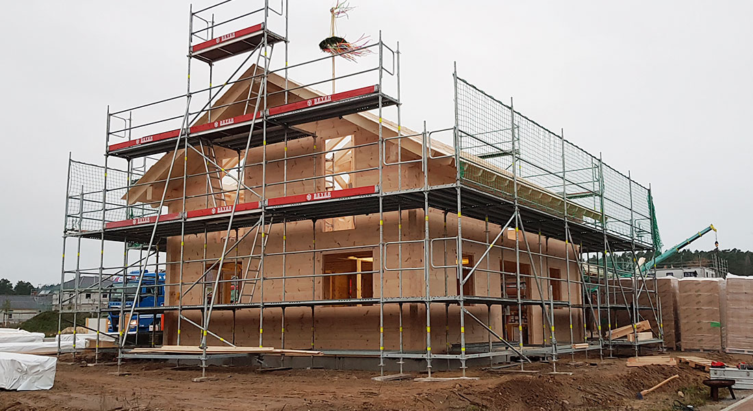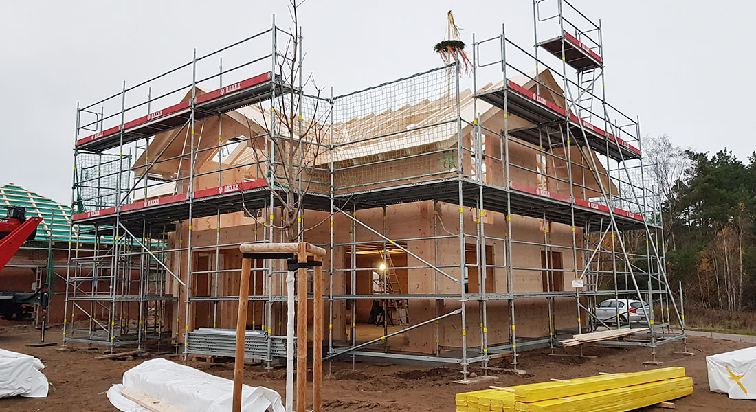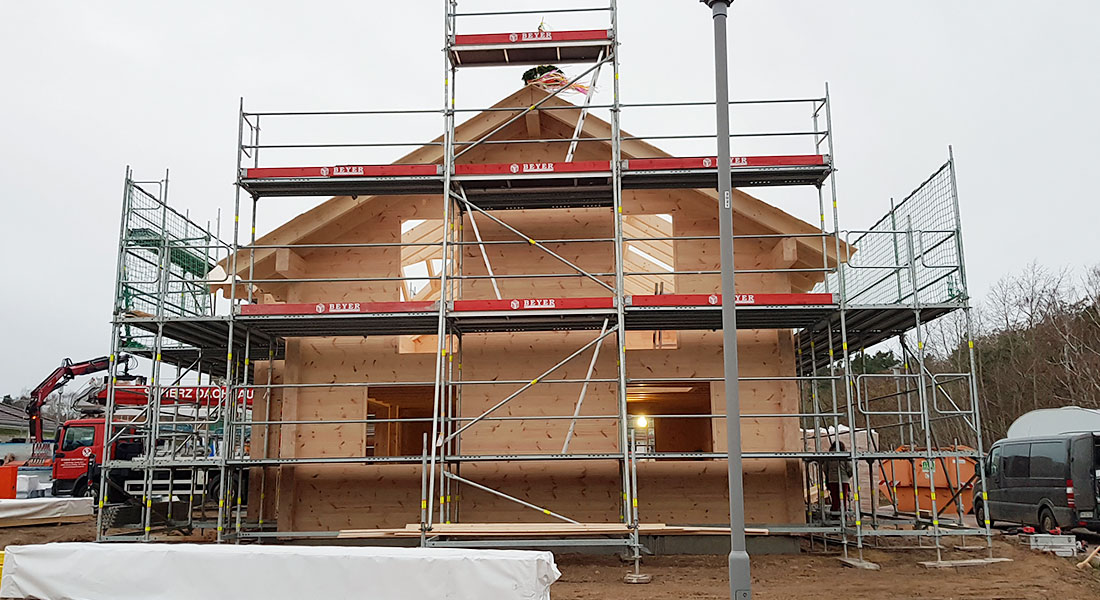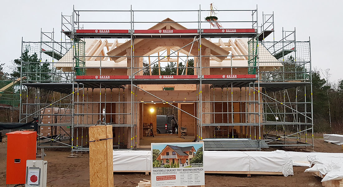 Hier bauen eine Möbelschreinerin und ihr Mann ihr Blockhaus Eigenheim aus Massivholz. Die Bauherrin hat sogar schon antike Möbel in Schloss Sanssouci restauriert, ist also Expertin in Sachen Holz. Auch der Bauherr begeistert sich für Holz und dessen überragende Eigenschaften als Baustoff. Logisch, dass die Wahl der beiden auf die einschalige Blockwand von Fullwood fällt. Gekauft hat das Paar sein Blockhaus in ökologischer Bauweise als Richtmeistermontage und lässt den Innenausbau komplett von kleinen Handwerksbetrieben aus der Region durchführen.