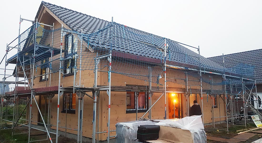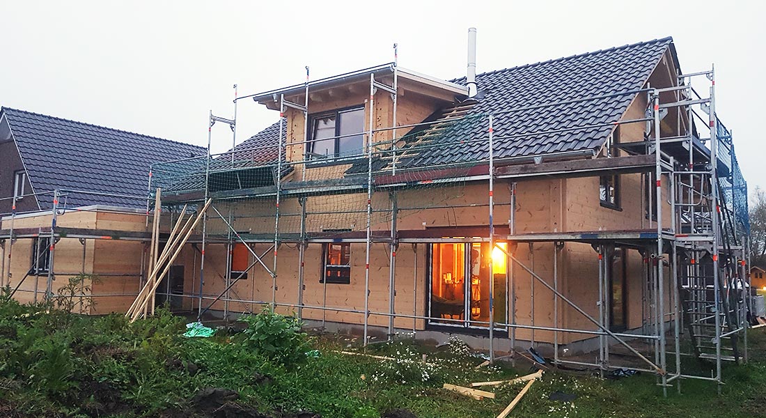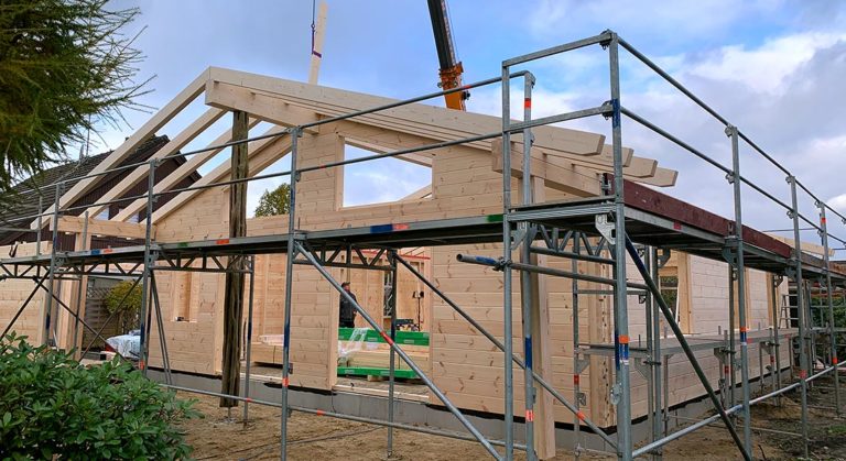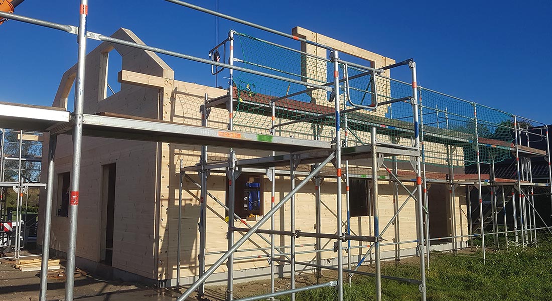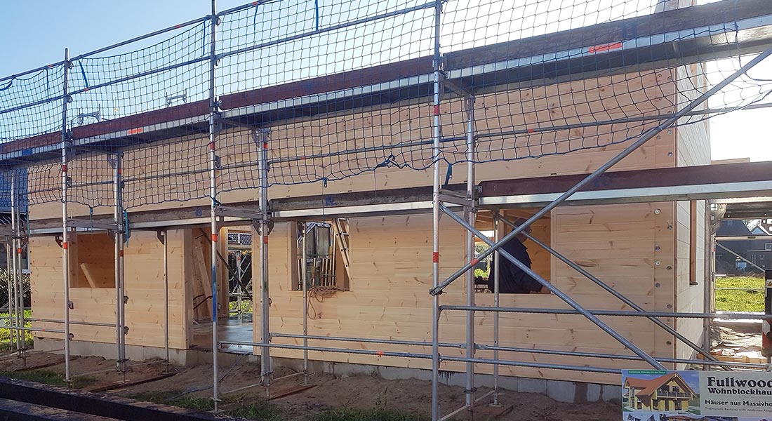 Anderthalb Geschosse mit einem Flachgiebel im Obergeschoss besitzt das Blockhaus, ganz so, wie das Baupaar es sich wünscht. Die Kombiblockwände werden im Hausinnern überwiegend mit Kiefernhalbbohlen verkleidet und ein gemütlicher Kaminofen ist ebenfalls geplant. Das Blockhaus wird außerdem eine kleine Galerie erhalten.