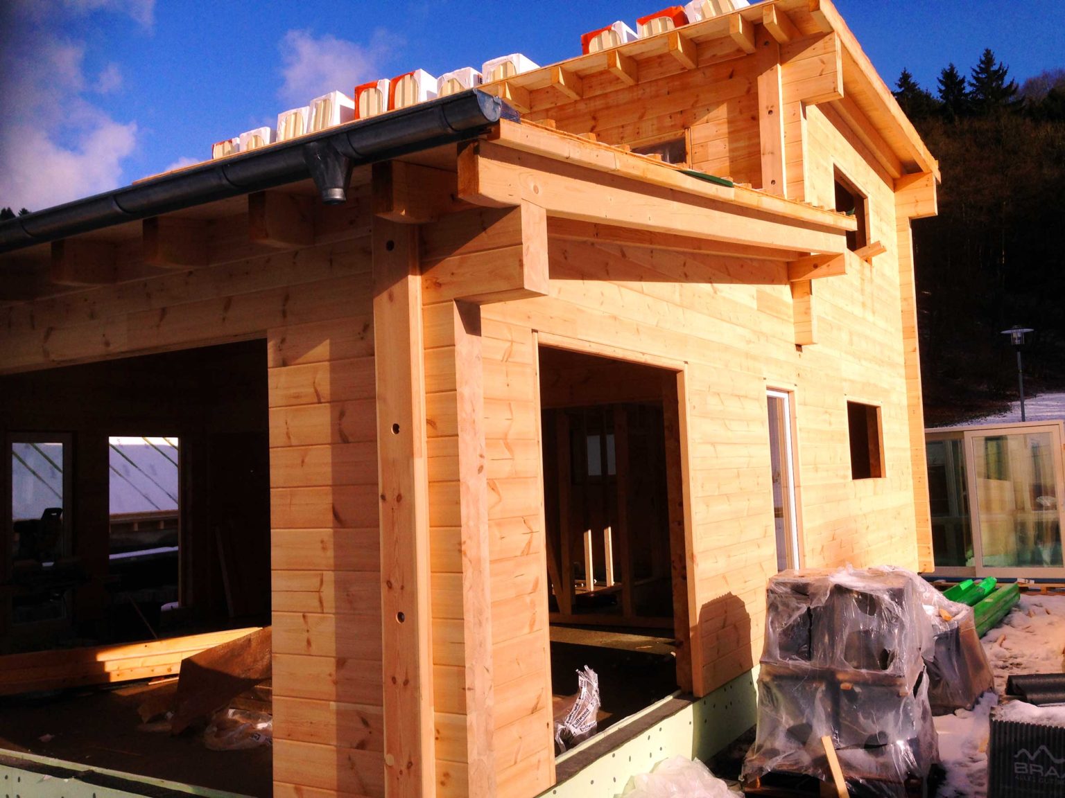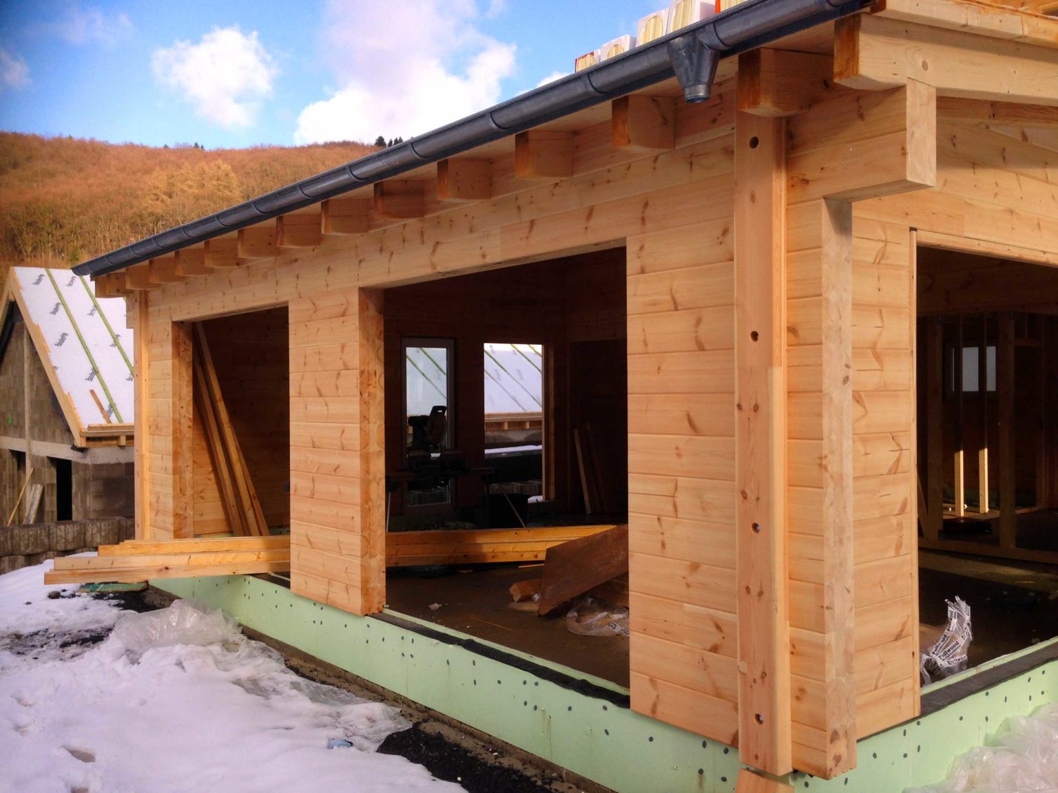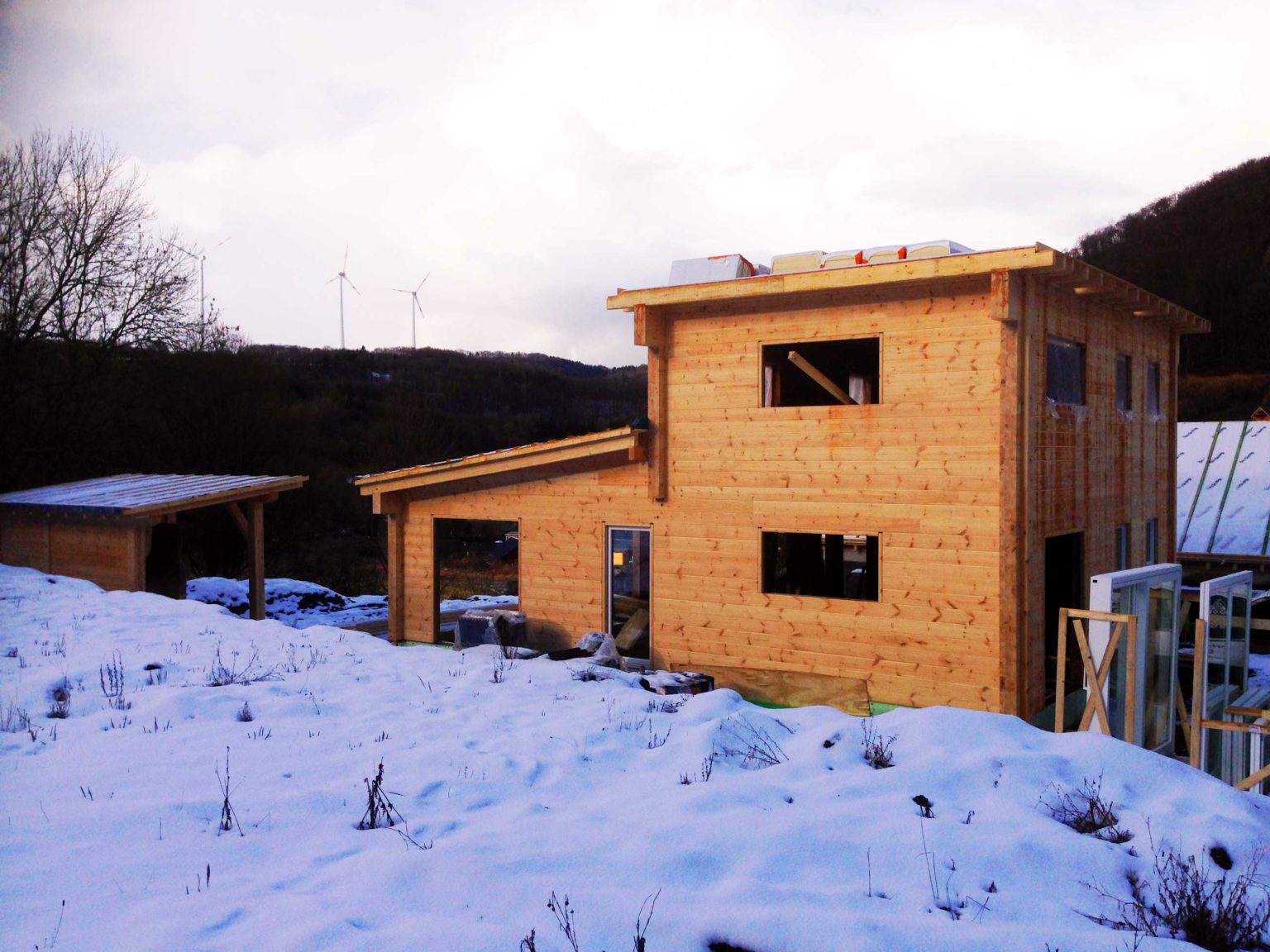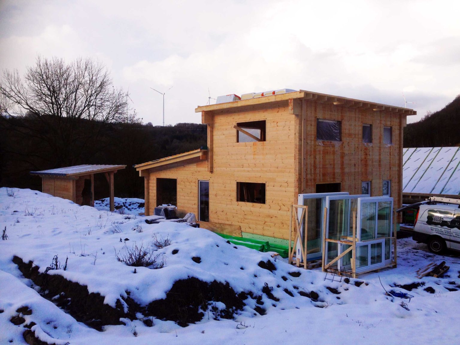 Der Baubeginn von diesem Blockhaus bei Koblenz fällt noch in die (kurze) Schneeperiode vor ein paar Wochen. Das Blockhaus wird in einer reinen Ferienhaussiedlung errichtet, in der sich überwiegend Blockhäuser befinden. Mittlerweile ist auch am Bauort dieses Blockhauses alles Weiß geschmolzen und der Frühling hält seinen hellgrünen Einzug. Schnee an sich kann einer Fullwood-Hausmontage nichts anhaben, da die Fullwood-Monteure bei jedem Wetter die fertigen Wandelemente aufstellen können – solange es sie nicht davonweht. Den Innenausbau übernehmen die belgischen Bauherren in Eigenregie. Sogar ein massives Gartenhaus lassen sich die Bauherren von Fullwood errichten.
