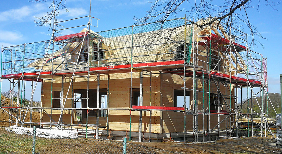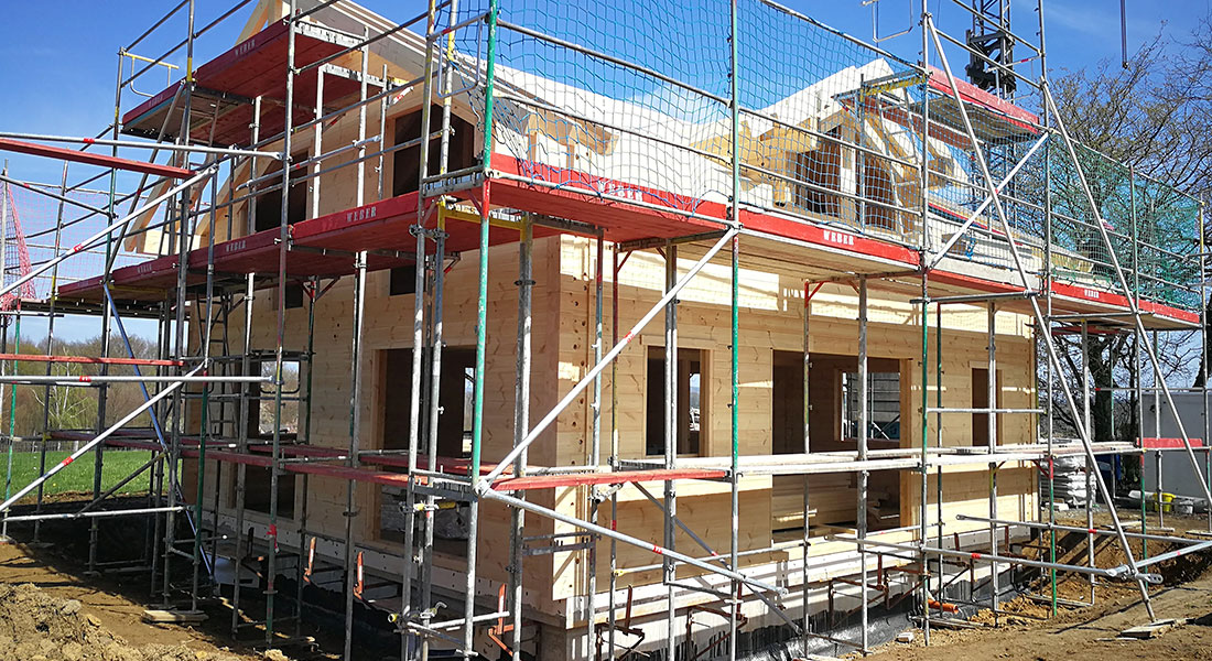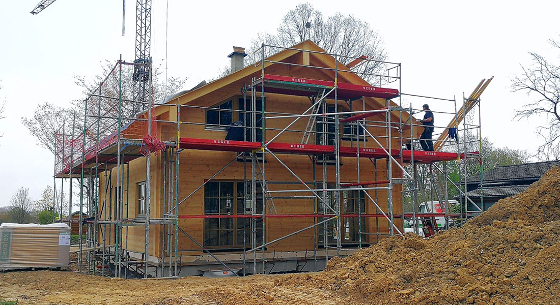 Schon seit 8 Jahren träumt die Baufamilie konkret von diesem Fullwood Wohnblockhaus, nun endlich klappt die Realisierung. Mittlerweile gibt es auch ein neues Familienmitglied, das im wohngesunden Blockhaus aufwachsen wird. Schon jetzt, in der Bauphase, sind alle glücklich und freuen sich auf ihr eineinhalb geschossiges Einfamilien Blockhaus aus Massivholz mit Sichtdachstuhl.