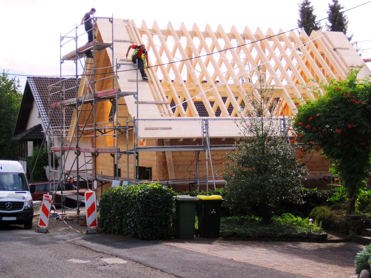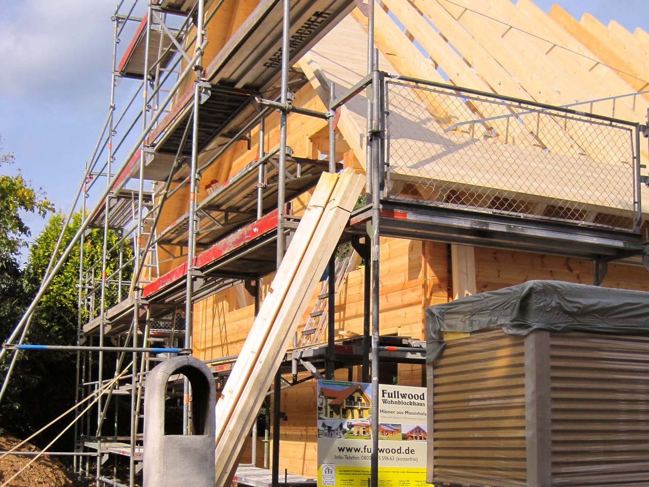 Direkt neben dem Elternhaus der Bauherrin baut Fullwood ein individuelles Blockhaus für diese und ihre Familie. Nachdem die detaillierte Planung abgeschlossen ist, und die massiven Kiefernwände passgenau im Werk vorgefertigt sind, stellt der Richtmeister von Fullwood das Blockhaus auf. Dabei helfen ihm die Bauherren, da sie sich für eine Richtmeistermontage mit hohem Eigenleistungsanteil entschieden haben. Wichtig ist der Baufamilie die Setzungsfreiheit ihrer 20cm starken Blockwände, denn somit stehen keine späteren Wartungsarbeiten an. Außerdem legen sie Wert darauf ihr eigenes Blockhaus mit einem Blockhaus-Spezialisten aus ihrer Region zu bauen. Schon jetzt sind die Bauherren rundum zufrieden mit ihrem Blockhaus und den von Fullwood erbrachten Leistungen!