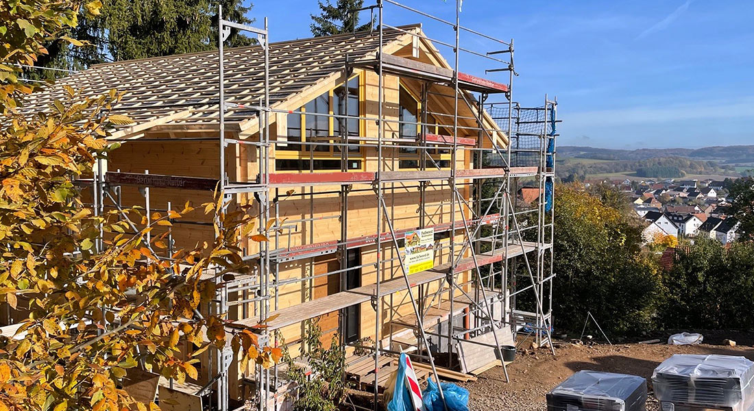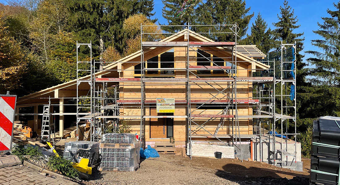 Hier baut ein junges Paar mit viel Eigenleistung sein Blockhaus. Aufgrund der steilen Hanglage wird das eineinhalbgeschossige Blockhaus auf ein Kellergeschoss gestellt. Mit 166cm ist der Kniestock des Blockhauses sehr hoch, was ein relativ flach geneigtes Satteldach zur Folge hat. Im Erdgeschoss vergrößert eine zusätzliche Balkenlage die Raumhöhe. Neben einem Quergiebel und einem abgeschleppten Dach, unter dem sich ein Carport befindet, ist außerdem eine Einliegerwohnung fest eingeplant.