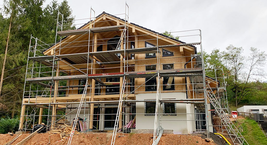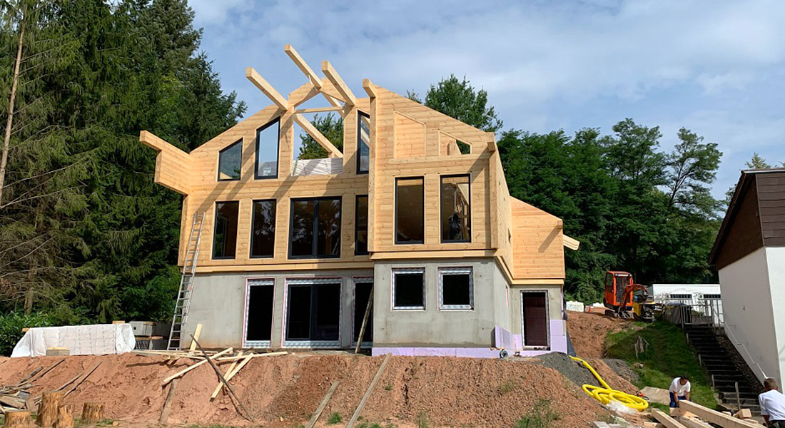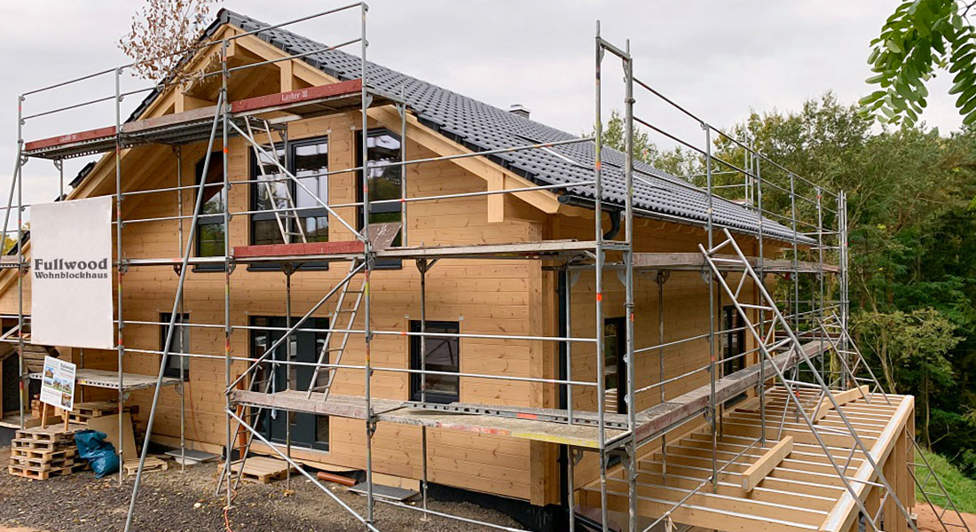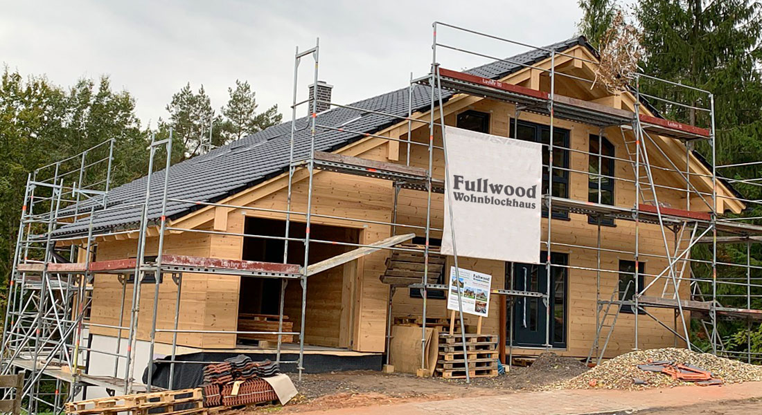 Auch das gibt es immer mal wieder: Ein Baupaar, das zufällig über Fullwood stolpert und gleich begeistert hängen bleibt. Vor kurzem wusste die Bauherrschaft noch nichts von der Existenz moderner, ungedämmter Wohnblockhäuser – nun erfüllt sie sich bereits den Traum vom eigenen nachhaltig gebauten Blockhaus. Das massive Blockhaus besitzt 1,5 Geschosse und seine 20cm dicken Polarkiefernwände werden schnell und solide auf einen Fertigkeller montiert. Anstatt einer offenen Balkendecke wählt das Baupaar eine glatte Brettsperrholzdecke im Erdgeschoss. Beim Bau ihres Eigenheims arbeiten Bauherr und Bauherrin mit.