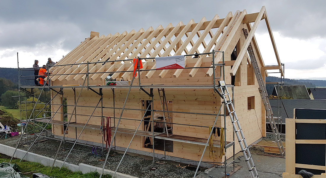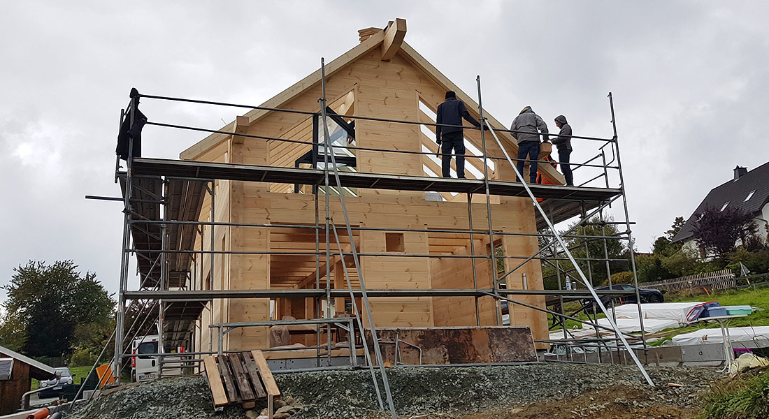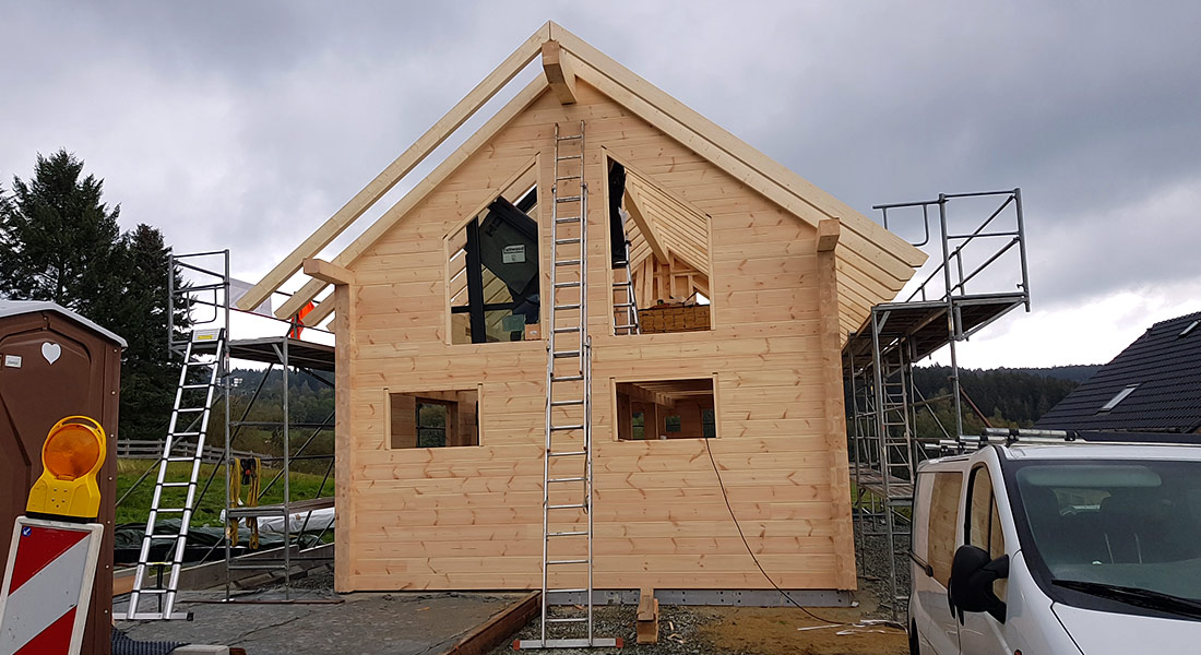 Der Bauherr ist im Metallbau beschäftigt, die Bauherrin in der Altenpflege: beide freuen sich auf ihr gemütliches und wohngesundes „Naturhaus“, das die ersehnte Entspannung nach einem anstrengenden Arbeitstag gewährt. Allein der Duft der Wände im Blockhaus verzaubert bereits in der Bauphase alle Beteiligten. Bevor es an den Einzug und ans Genusswohnen im eigenen Blockhaus geht, bringt die Bauherrschaft noch sehr viel Eigenleistung für den Ausbau ein.