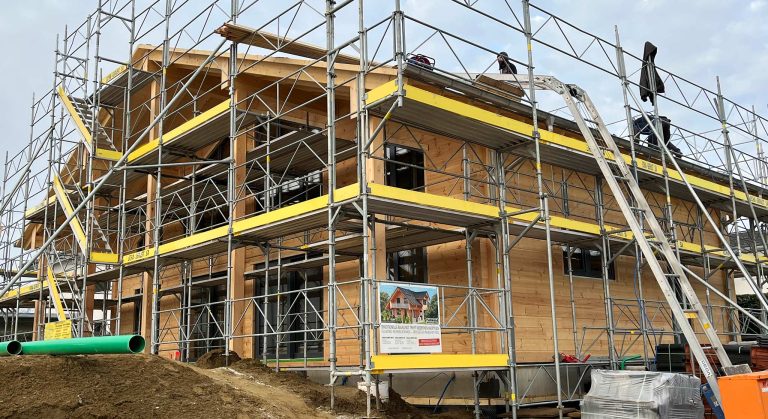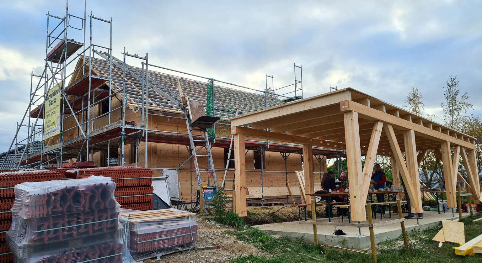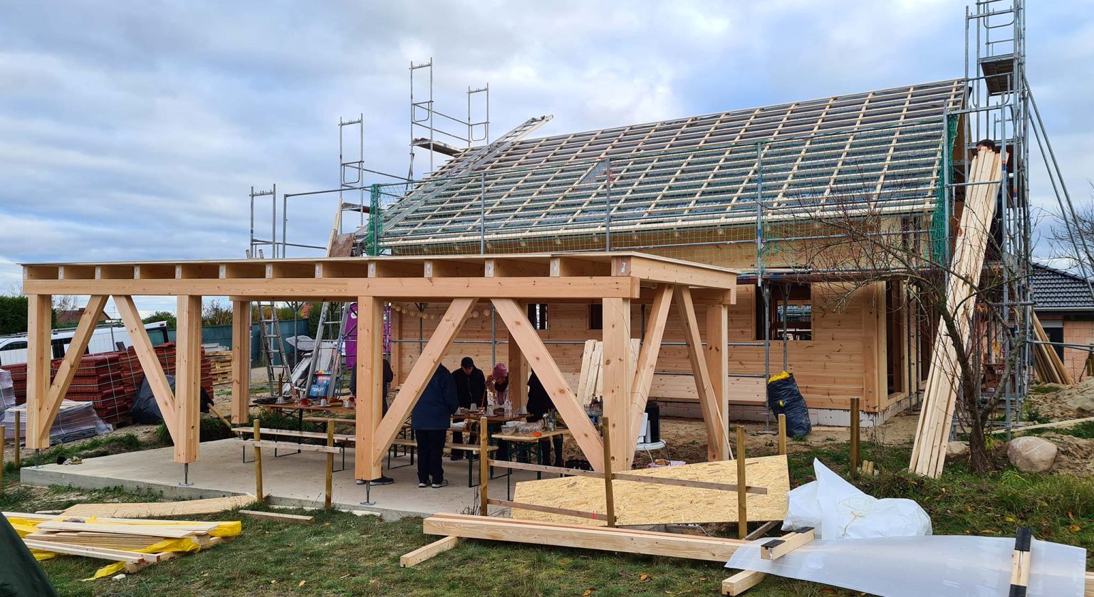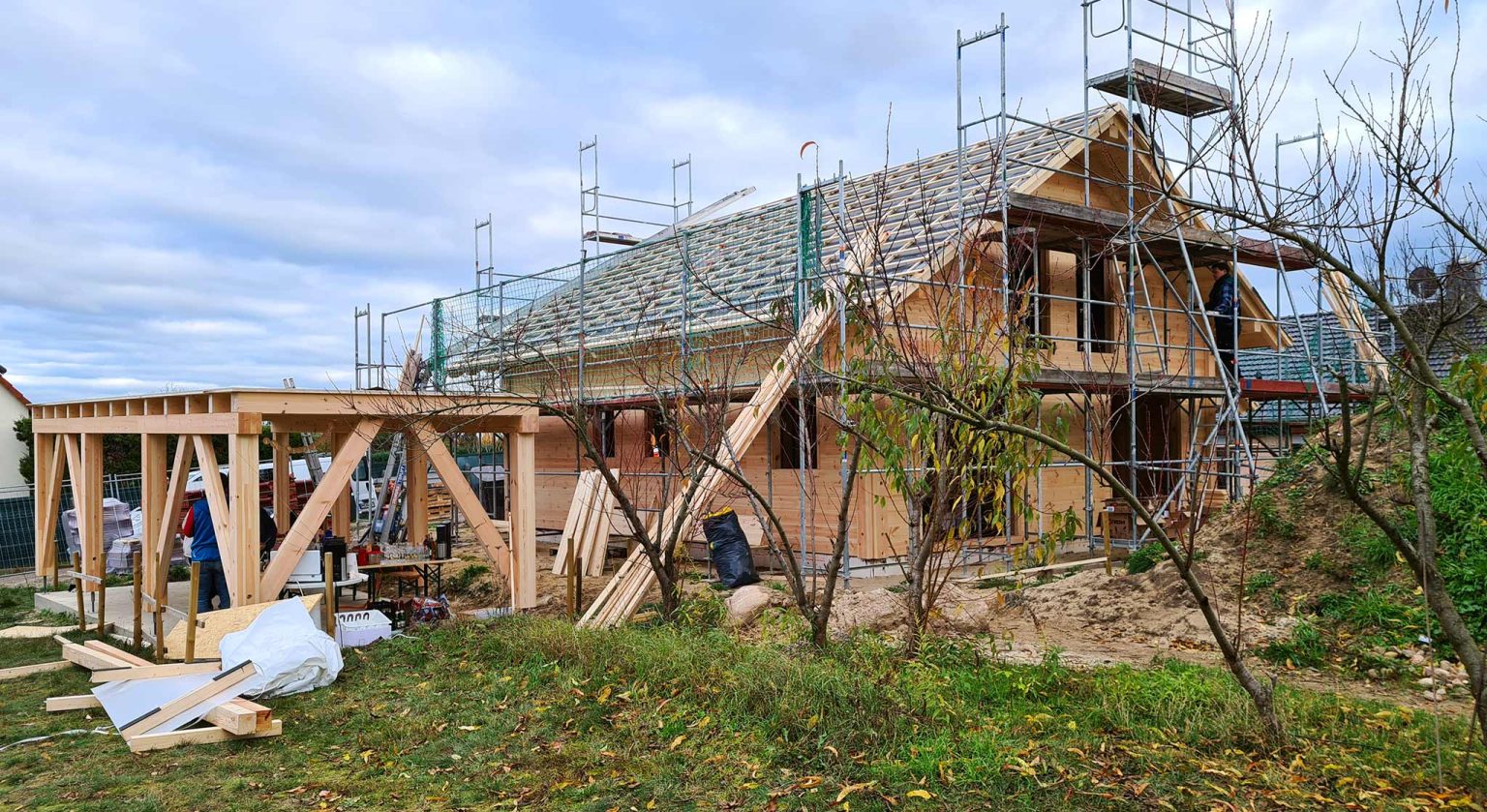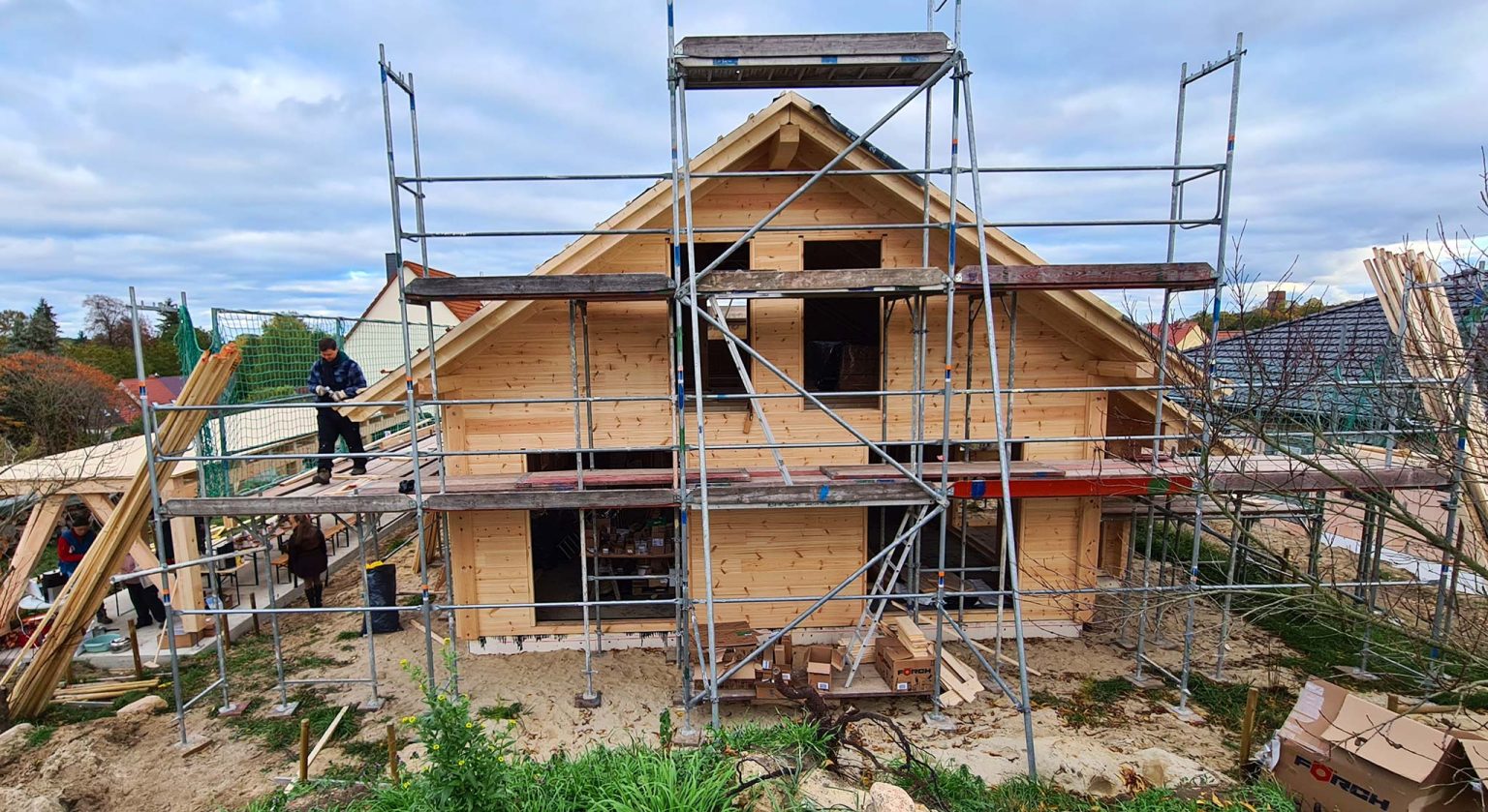 Unter der Regie und Vorarbeit unseres Richtmeisters montiert die Baufamilie ihr Blockhaus in nachhaltiger Bauweise selbst. Der Bausatz passt perfekt und entsprechend läuft alles reibungslos. Wie es die Tradition verlangt, spricht Richtmeister Timo am Tag des Richtfestes einen individuellen Richtfest Spruch und begießt das Ganze feierlich mit einem adäquaten Destillat. Für den Innenausbau und die Haustechnik engagiert die Bauherrschaft regionale Handwerksfirmen.