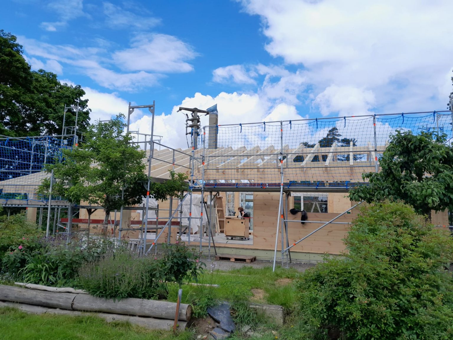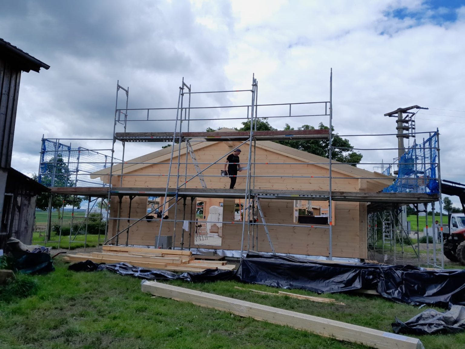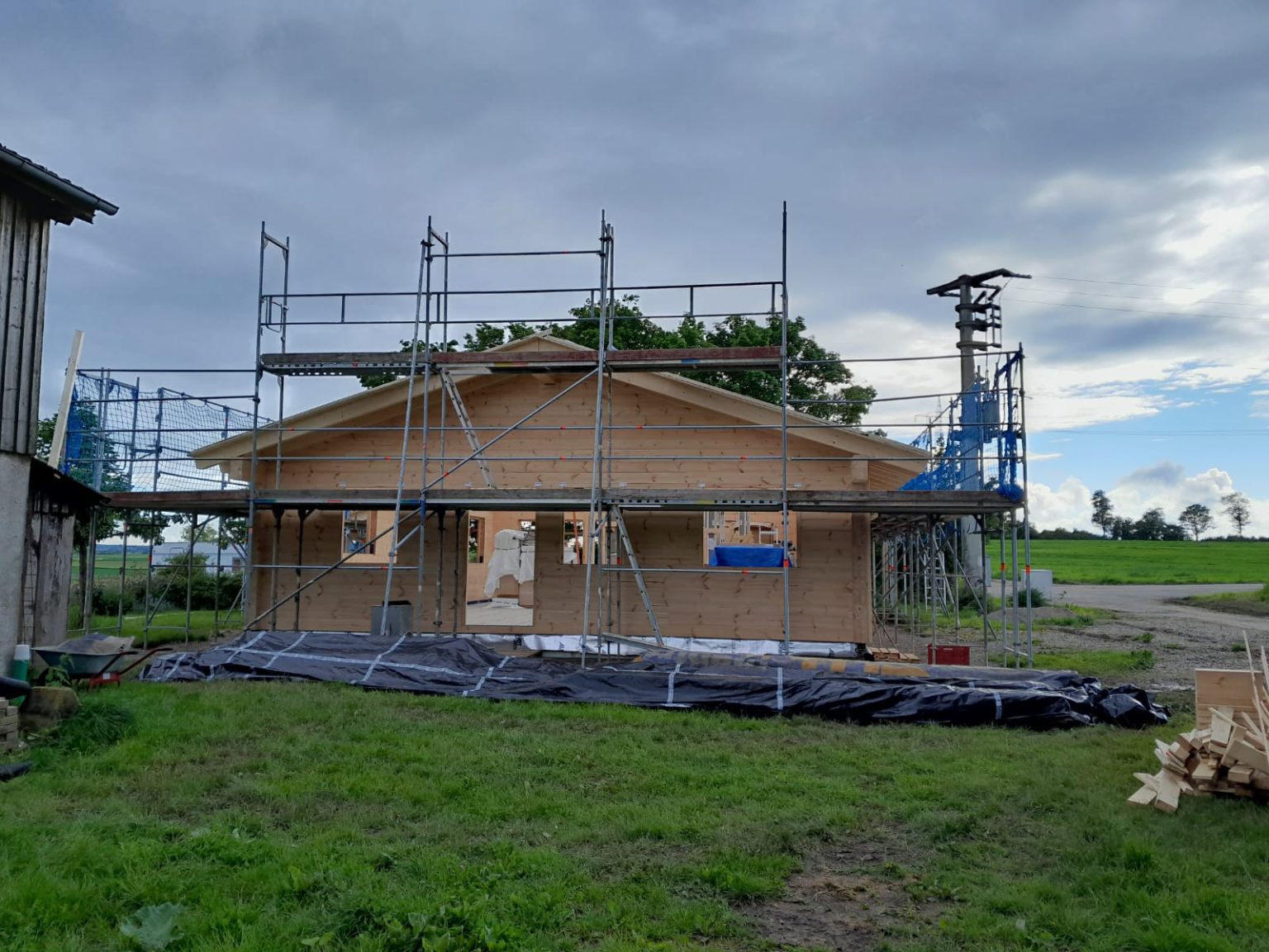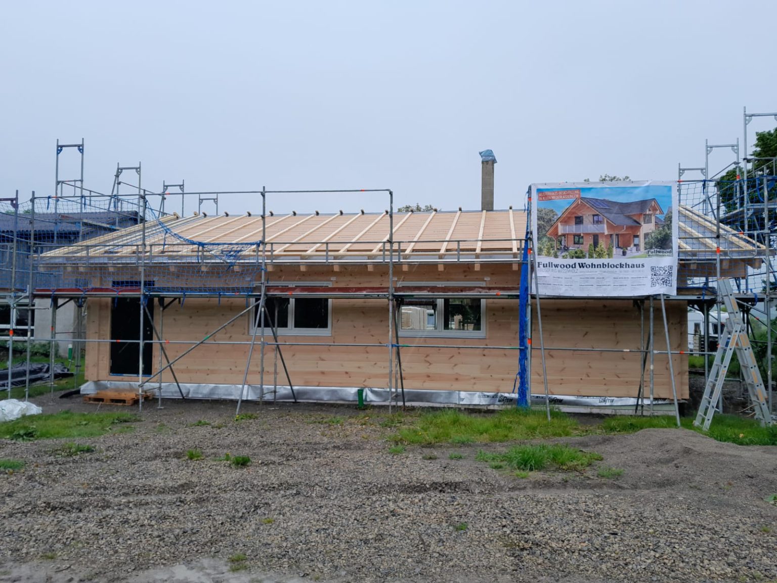 20cm massive Blockwand, 1-geschossig, Sichtdachstuhl mit Gutex-Aufdachdämmung, Richtmeistermontage