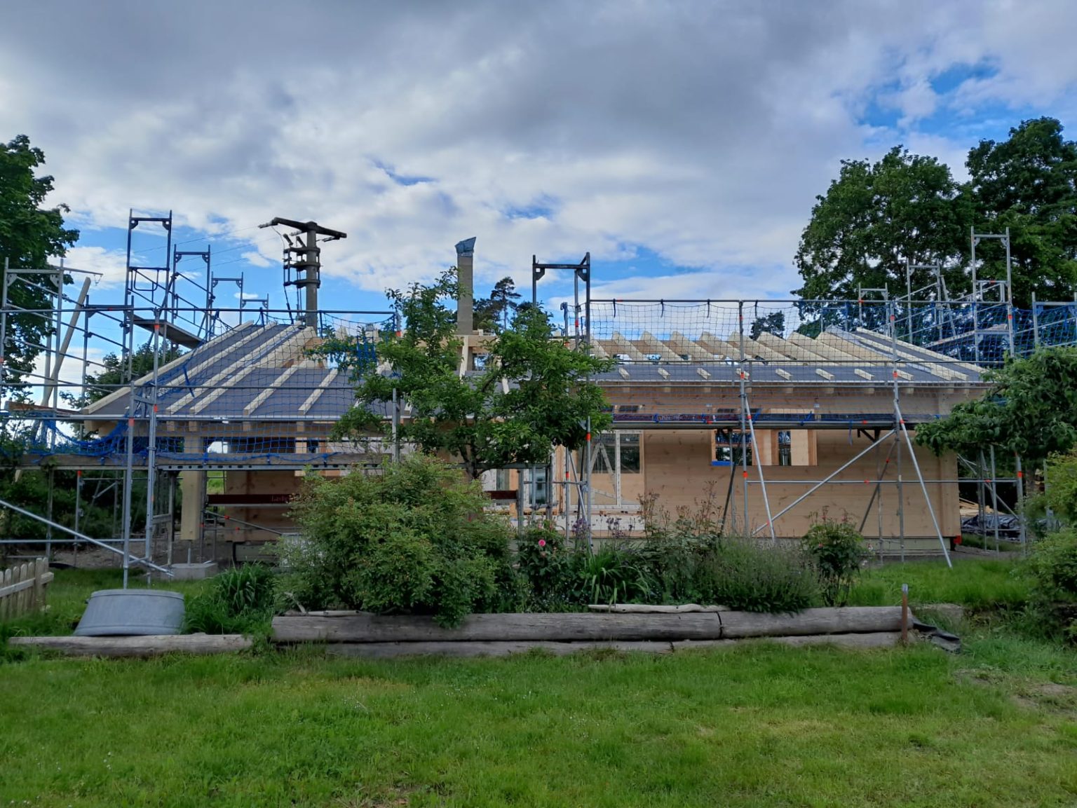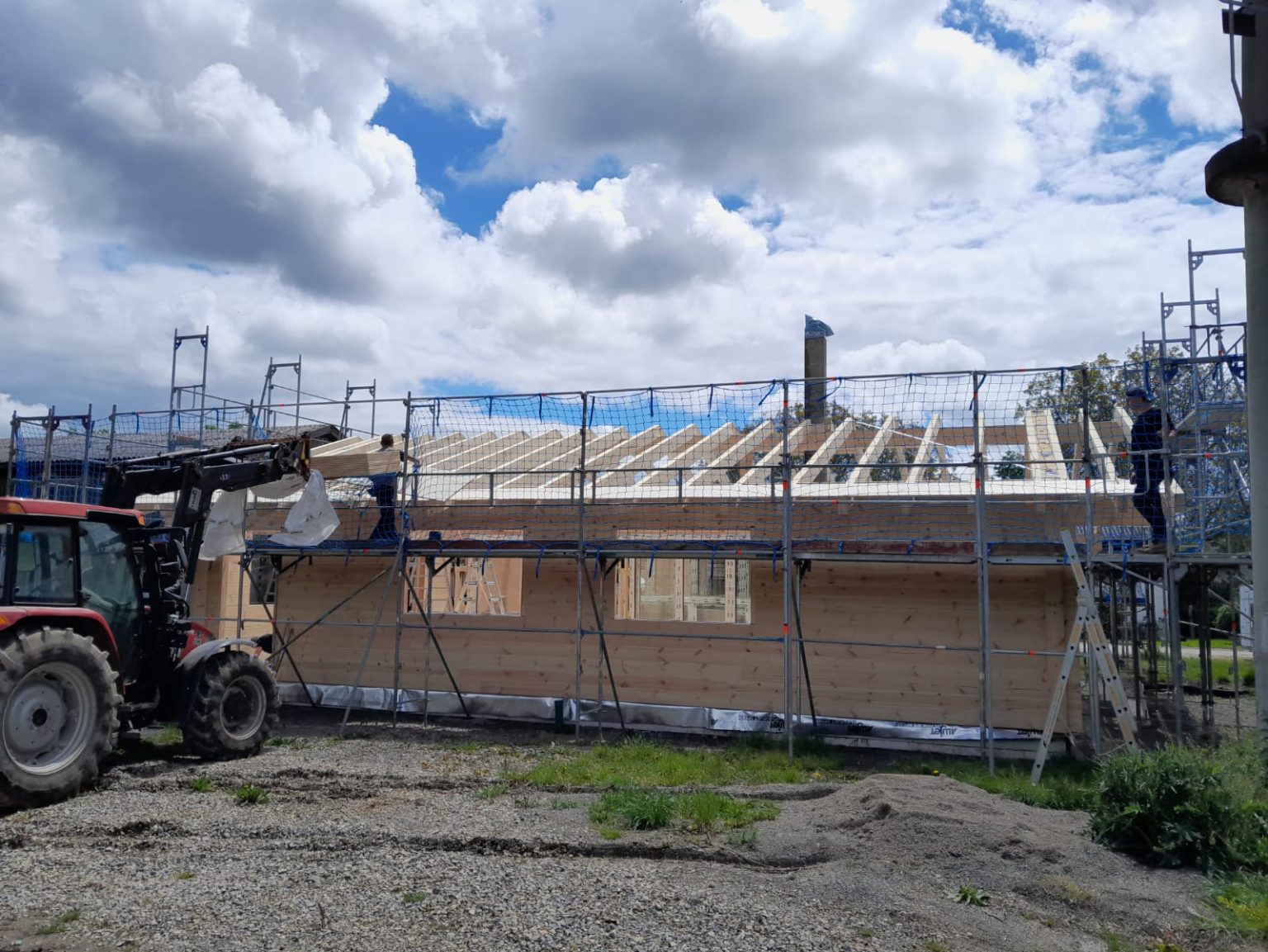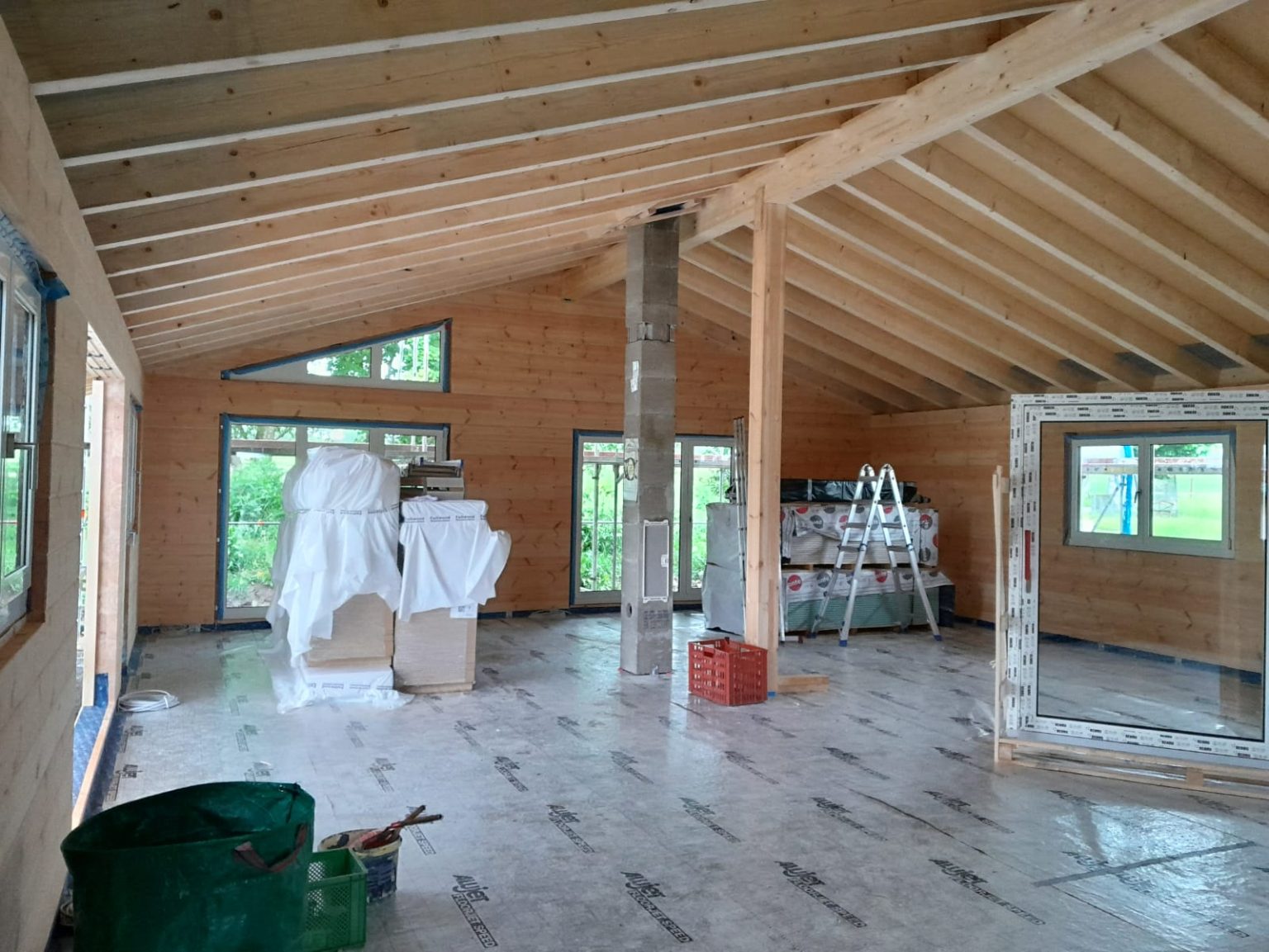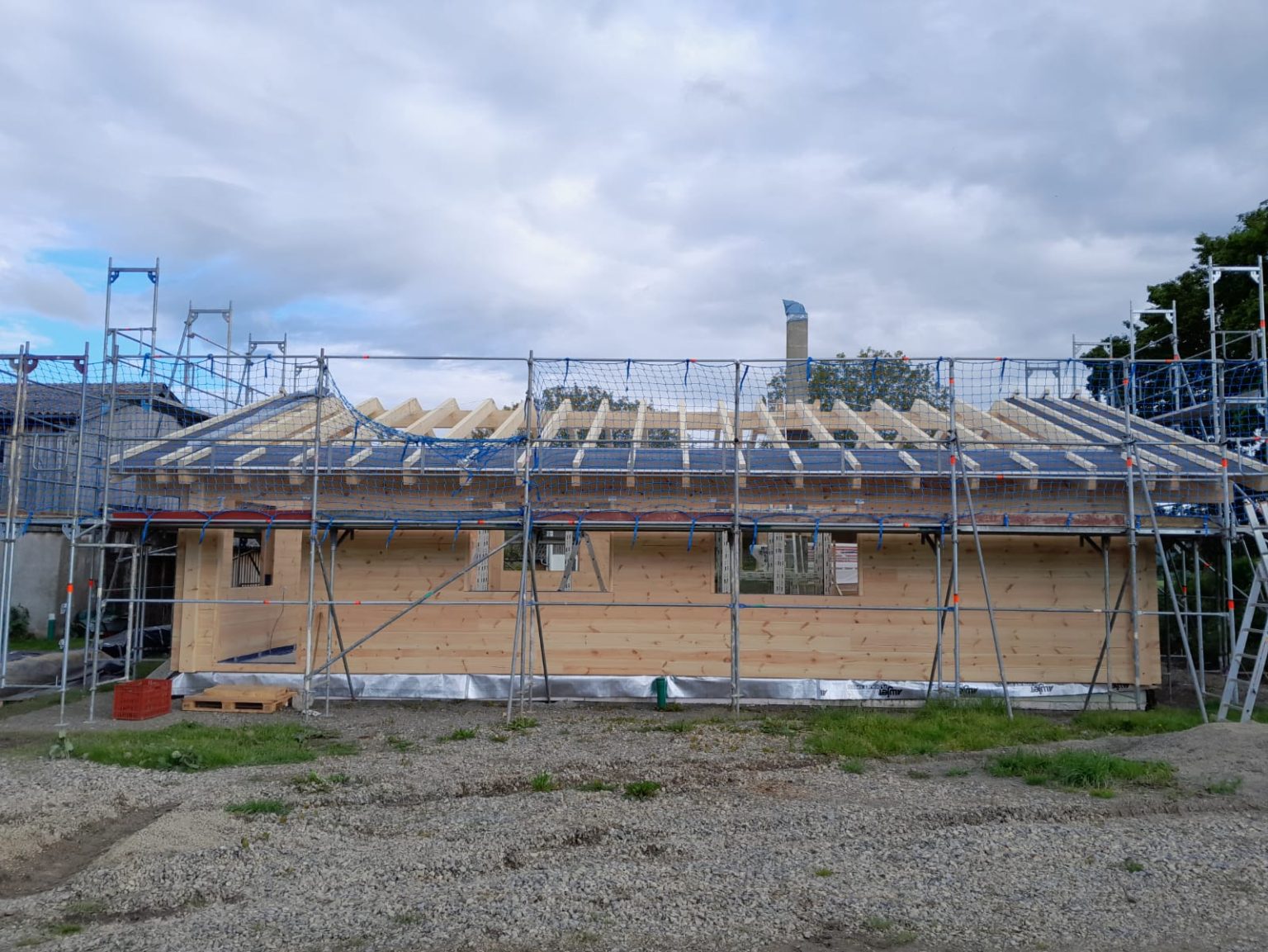 20cm massive Blockwand, 1-geschossig, Sichtdachstuhl mit Gutex-Aufdachdämmung, Richtmeistermontage