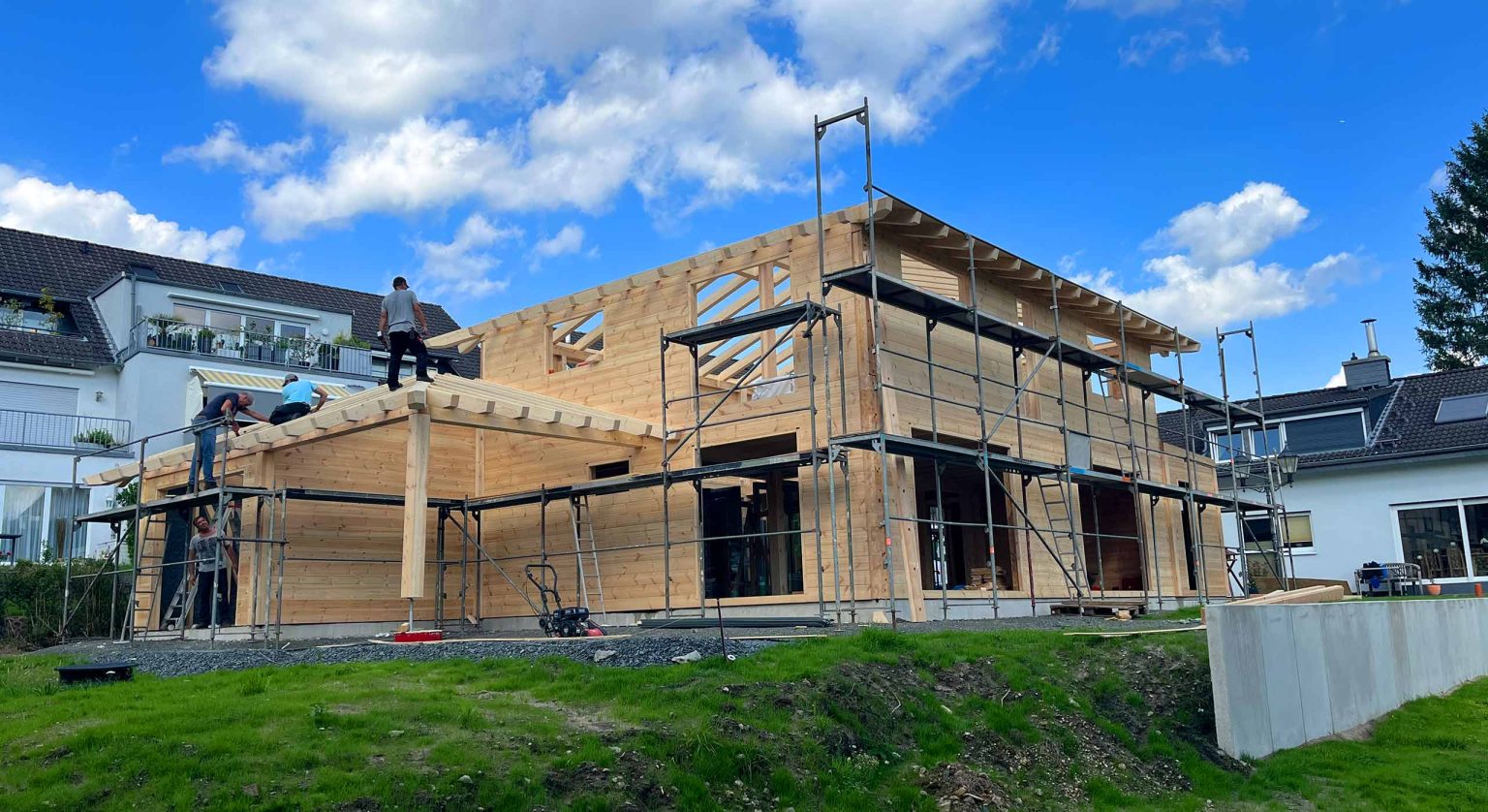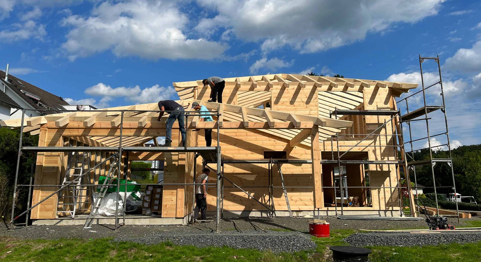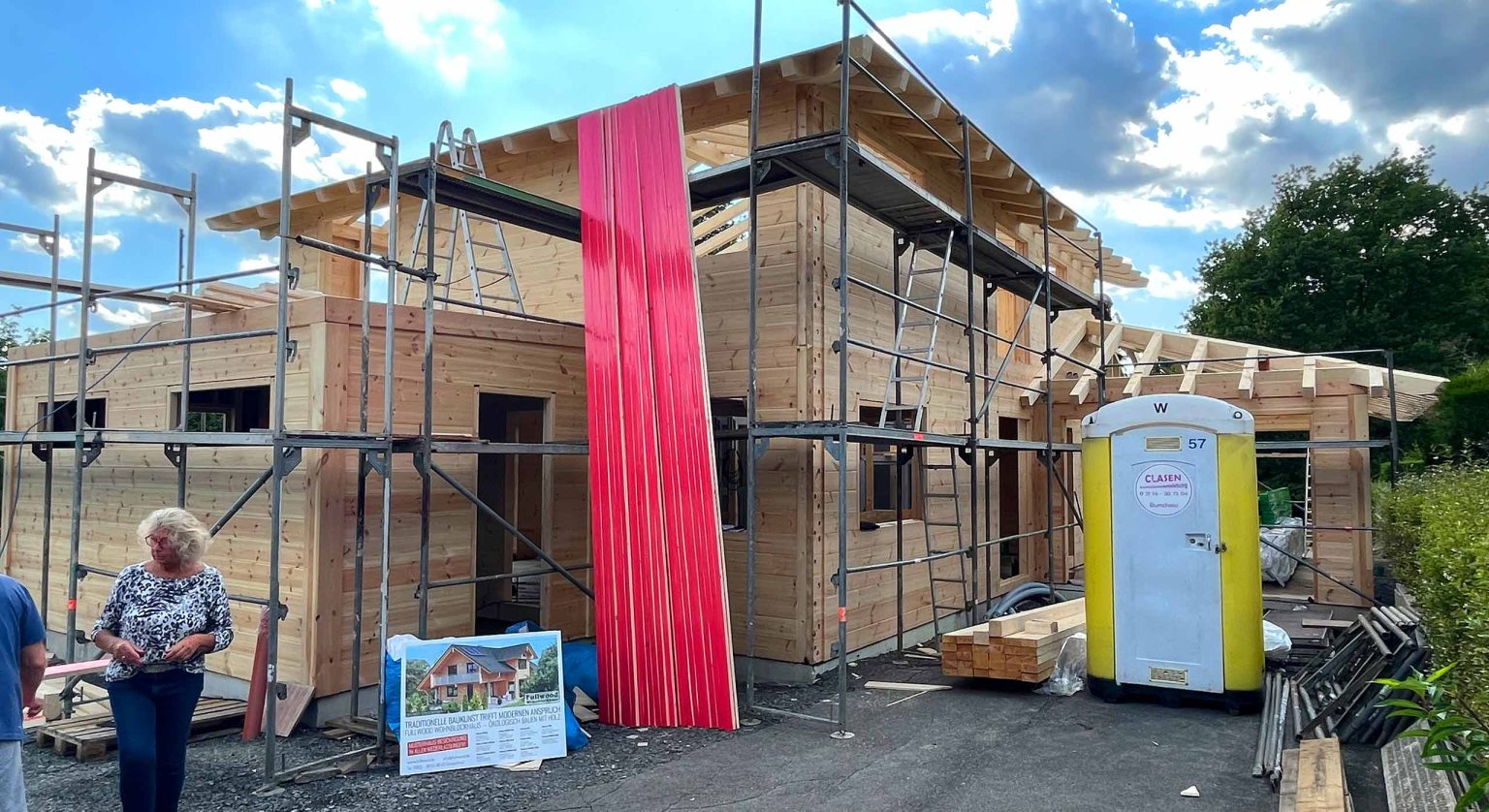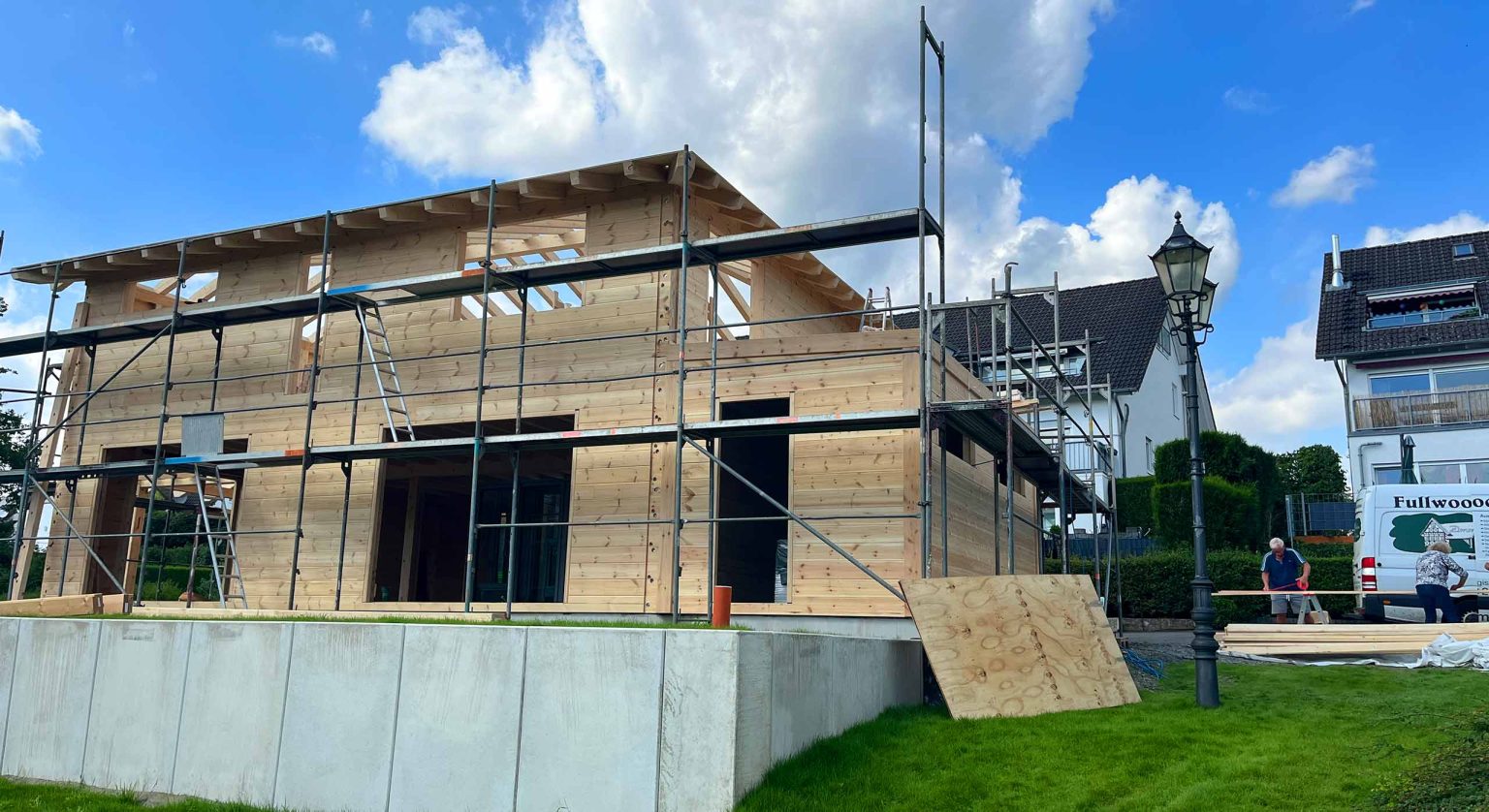 Blockhaus mit sehr viel Eigenleistung zu bauen. Die beliebte „Muskelhypothek“ spart einen ordentlichen Batzen Geld, genau wie die Kombination der beiden Fullwood-Wandtypen miteinander. Die einschalige 20er-Blockwand wird, wo es Sinn macht, mit der im Kern gedämmten, preisgünstigeren 9er-Blockwand kombiniert. So hat man außerdem mehr Flexibilität bei der Wandgestaltung im Innenbereich und rechnerisch noch bessere U-Werte der Wände.