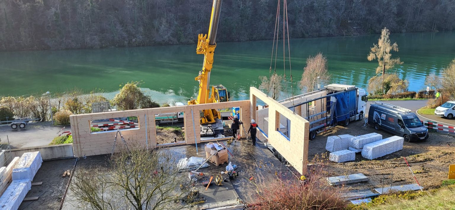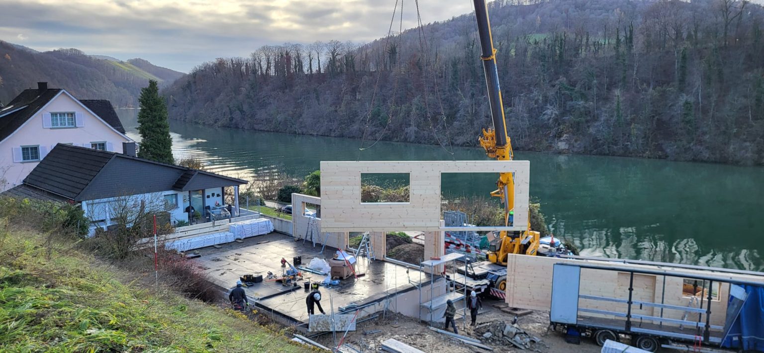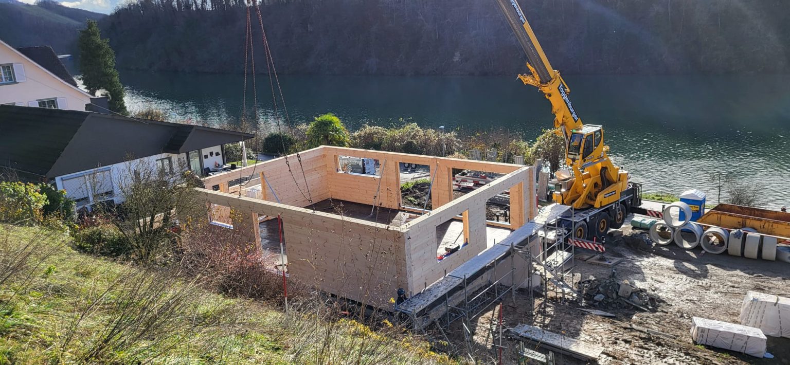 Direkt am Rhein in Eglisau wurde das bestehende Haus bis auf den Keller abgerissen. Es wurde ein sehr schöner Vollholzaufbau mit 27cm Vollholz und gegen Süden mit 2 Meter Vordach als Bungalow Bau auf den Bestand gesetzt. Daneben ist ein weiteres Fullwood Blockhaus mit 2 Wohnungen geplant, der Aufbau startet zeitnah.