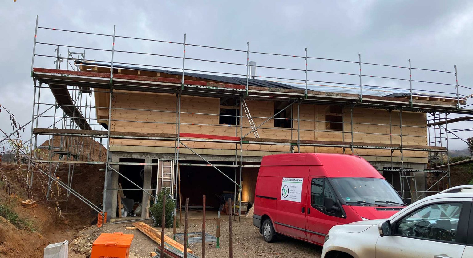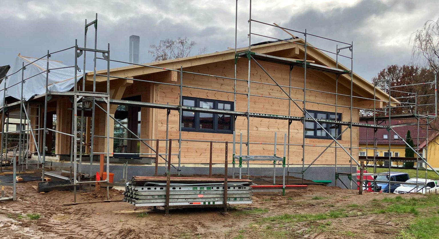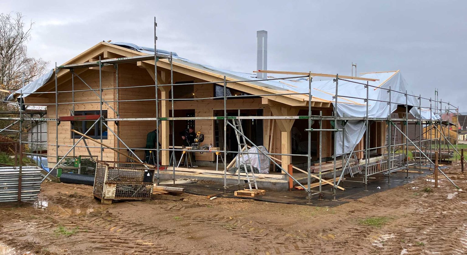 eingeschossiges Blockhaus bauen. Dafür werden die 20cm dicken, einschaligen Blockwände verbaut und das Dach erhält eine Aufdachdämmung mit Holzfaser. Vorerst wird die Bauherrschaft selbst nicht in den Wohngenuss ihres Bungalows kommen, sondern diesen erst einmal vermieten. Später will man dann gegebenenfalls selbst in dem