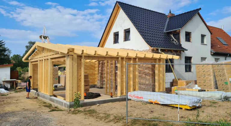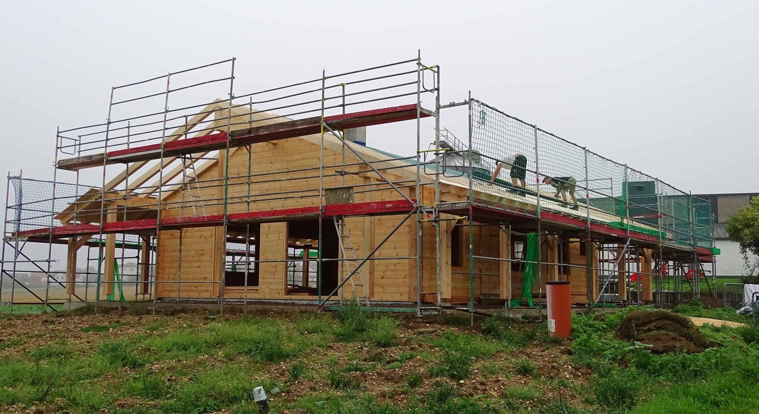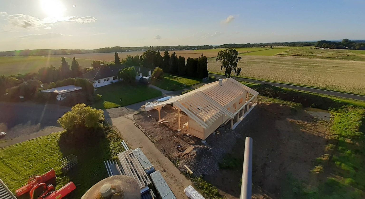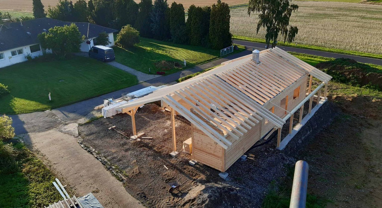 Hier lässt ein Biologe und Doktor der Agrarwissenschaft mit auf Getreide spezialisiertem, landwirtschaftlichem Betrieb, einen Bungalow aus massivem Holz bauen. Damit erfüllt er sich den lang gehegten Traum vom wohngesunden